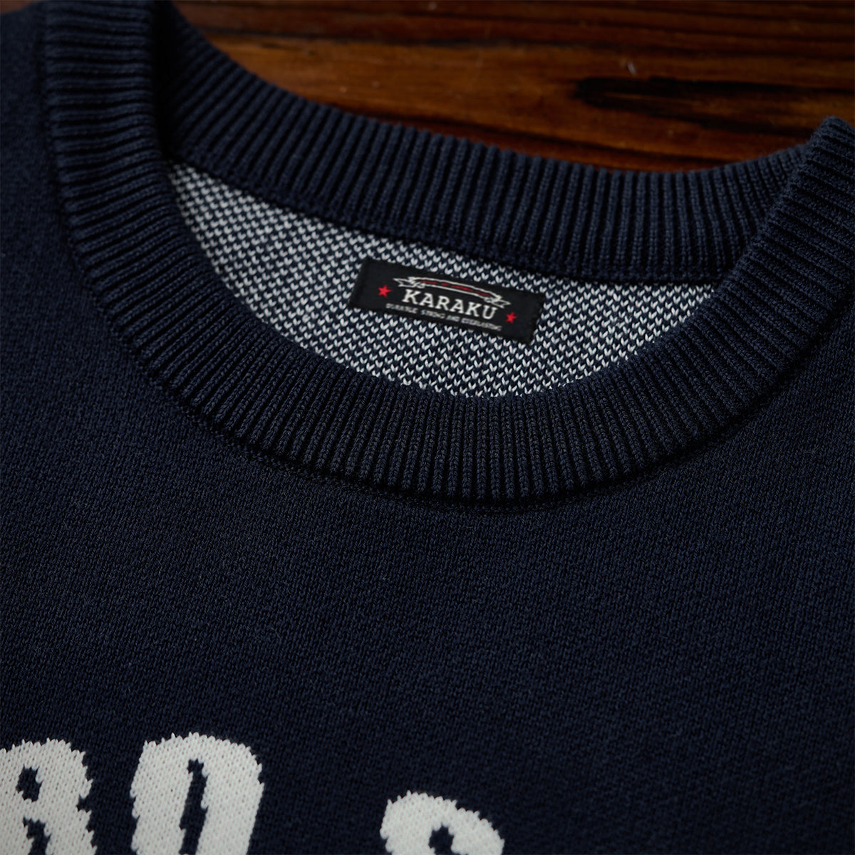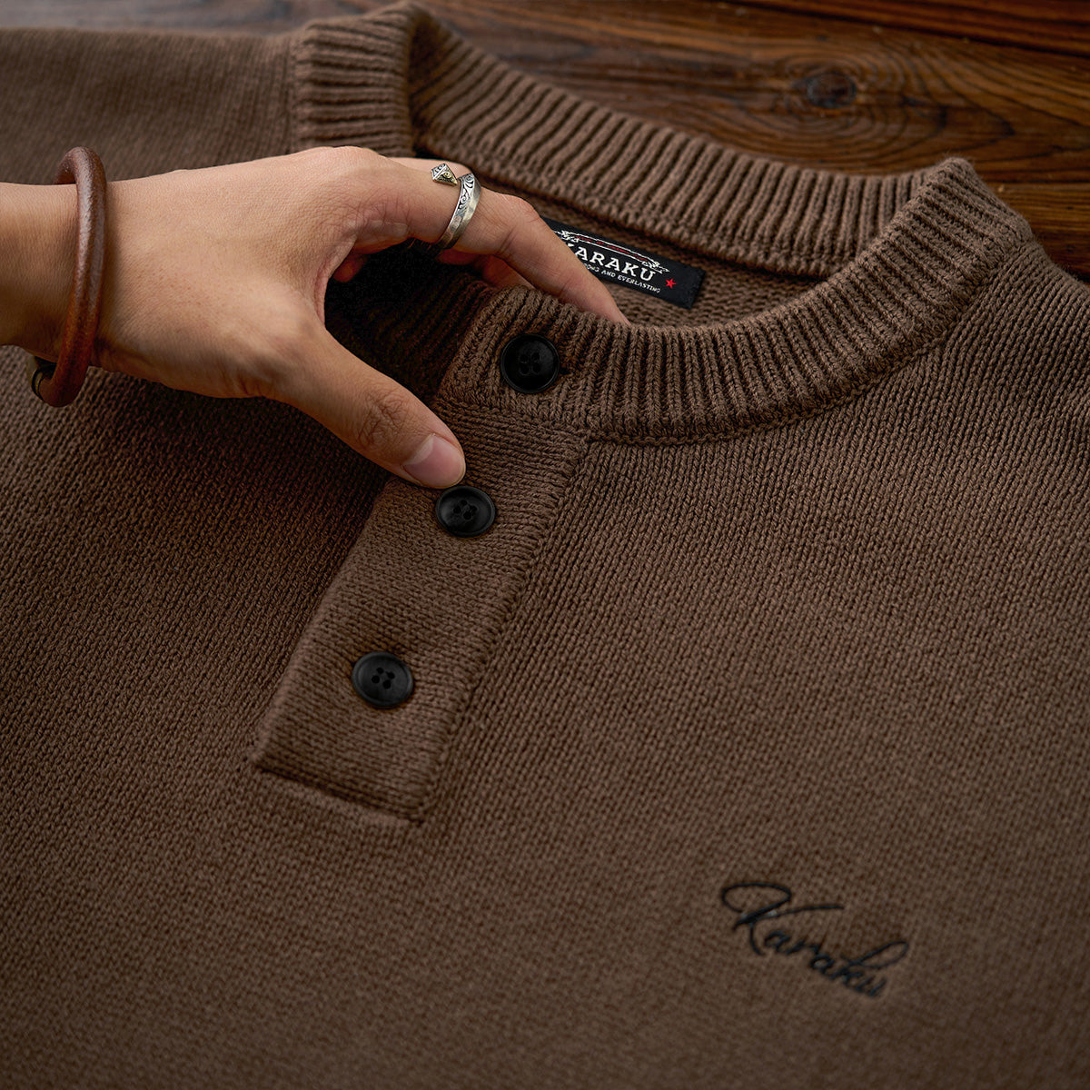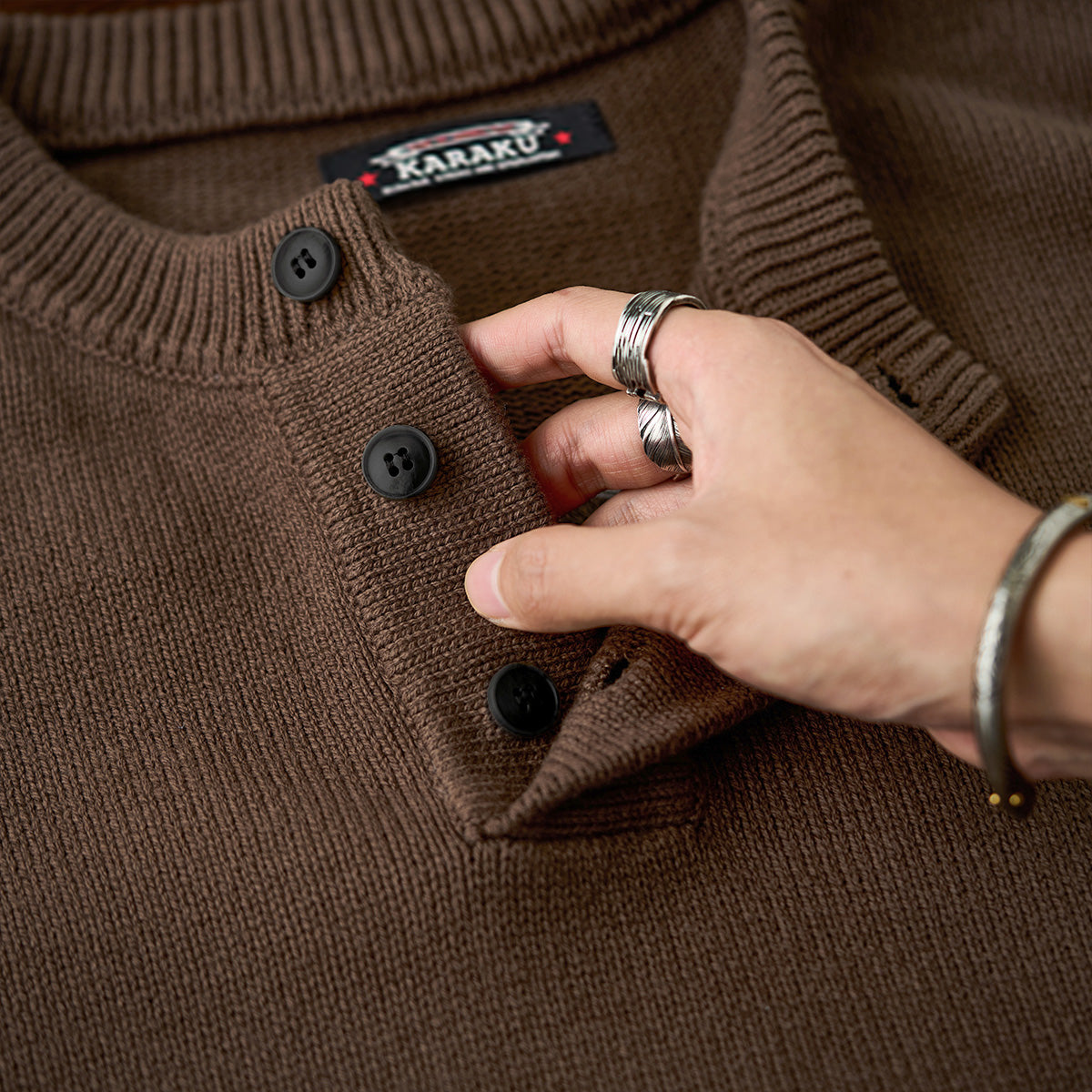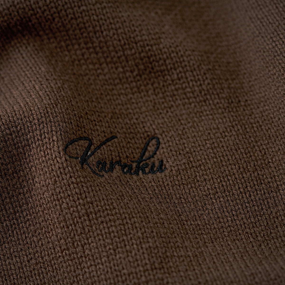 「헬멧 쓴 고양이」자수 & KARAKU 로고 자수 헨리넥 니트 스웨터