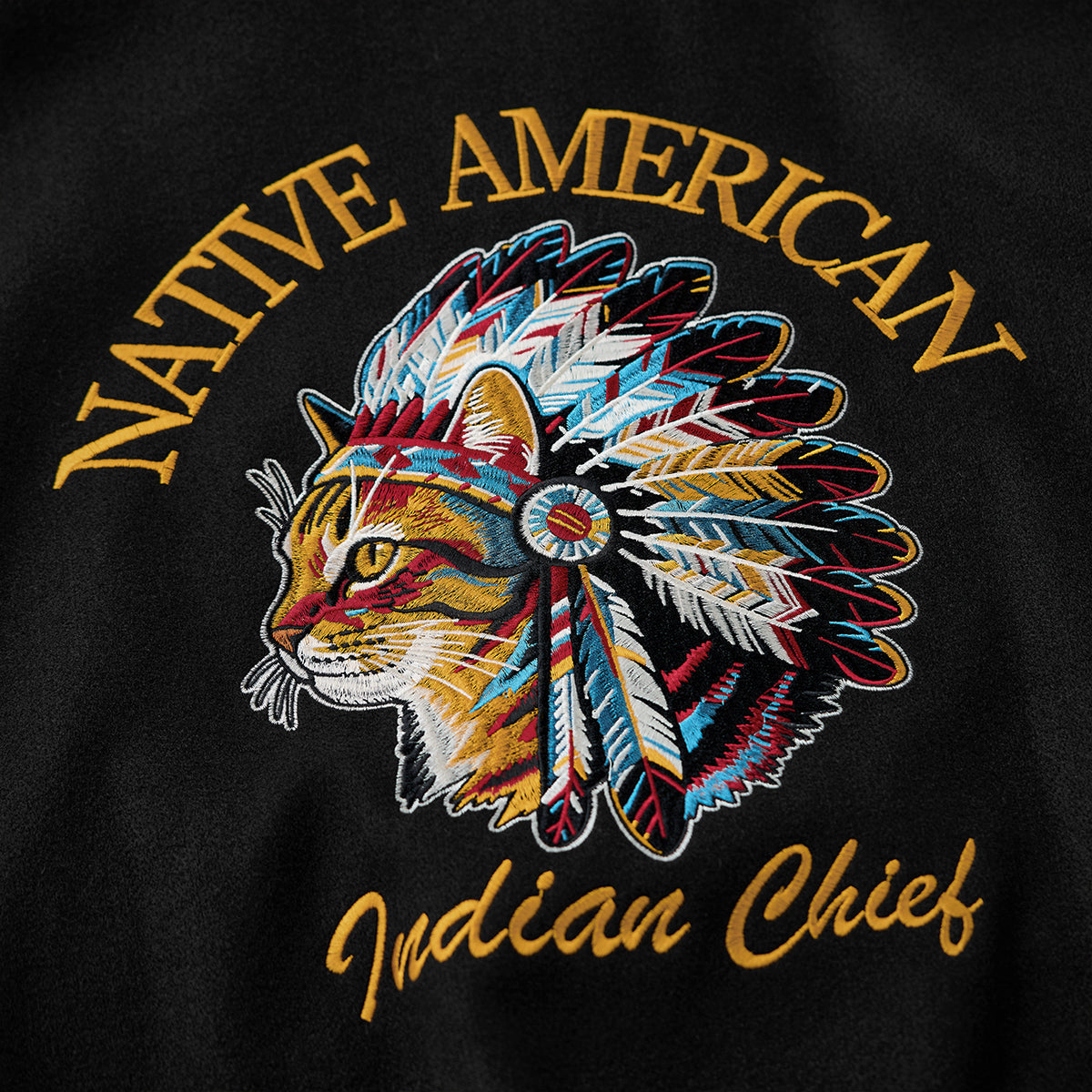 「인디언 추장 고양이」프린트 및 Karaku 자수 면 티셔츠