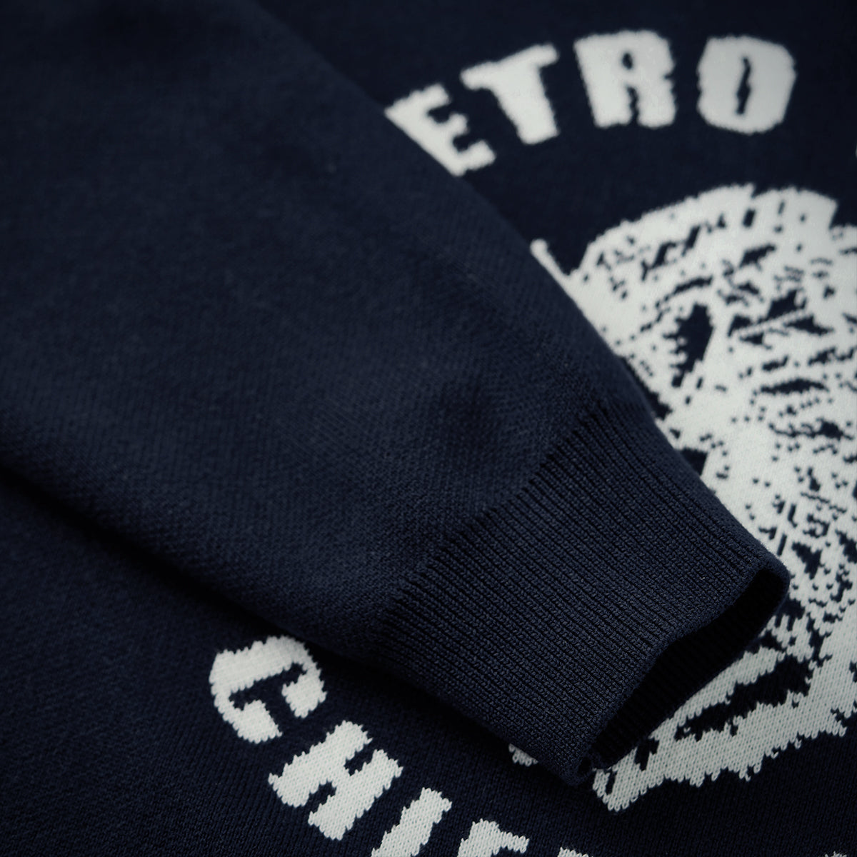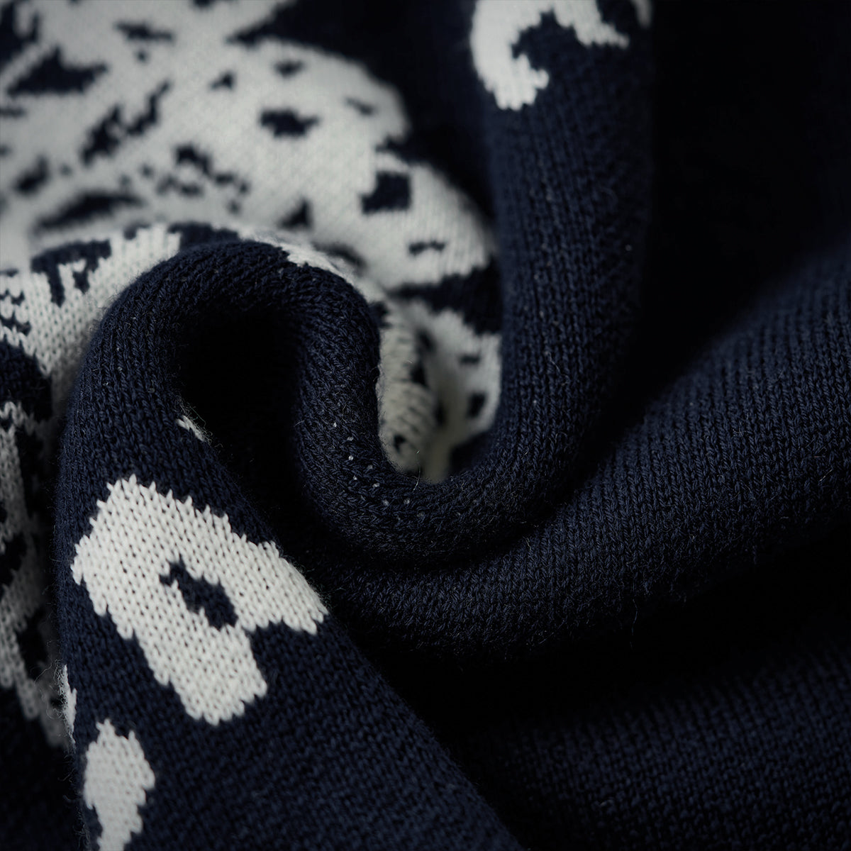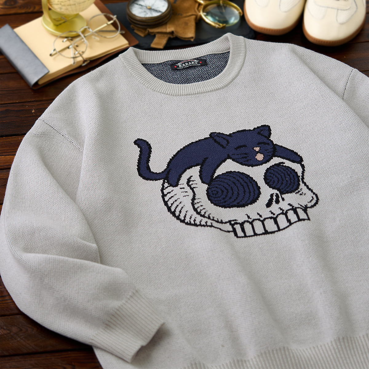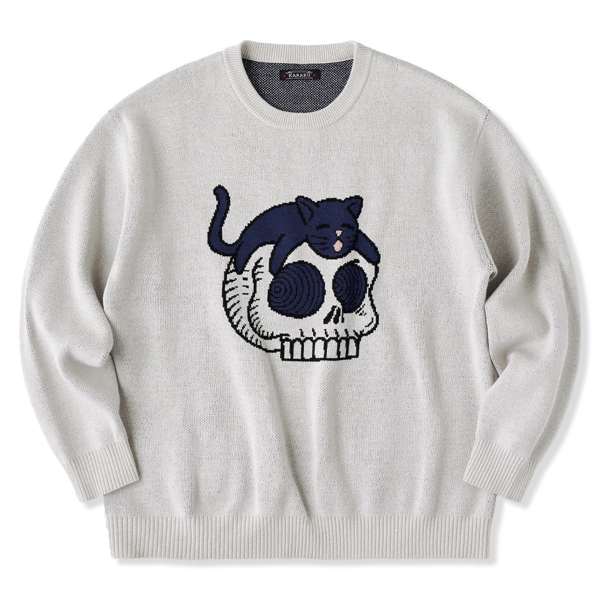 【사전예약】「해골 위에 엎드려 있는 고양이」팝아트 스타일 자카드 니트 스웨터