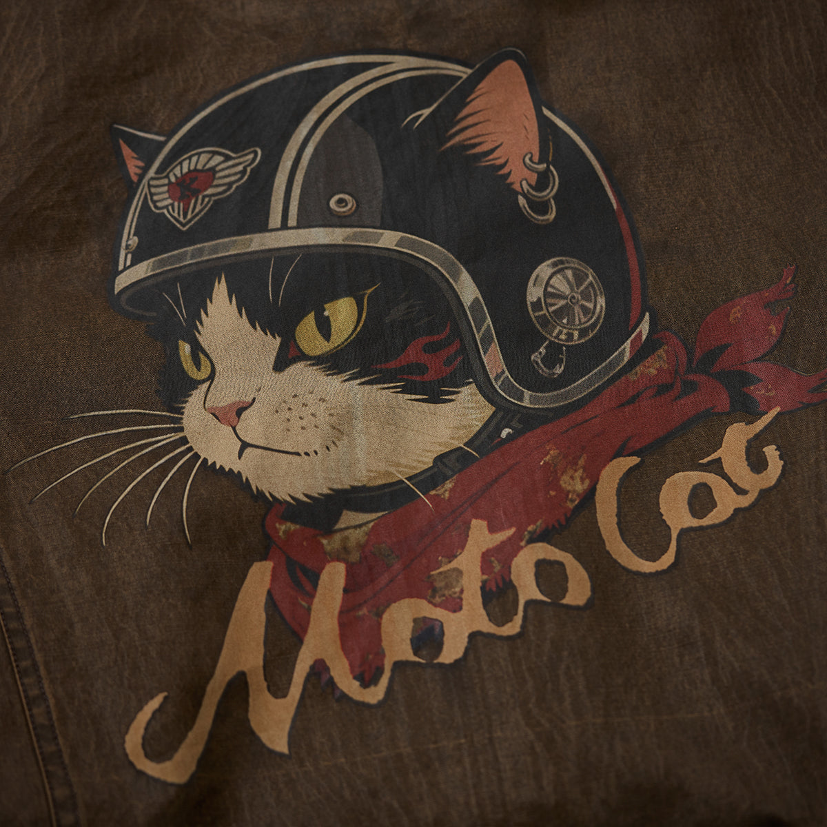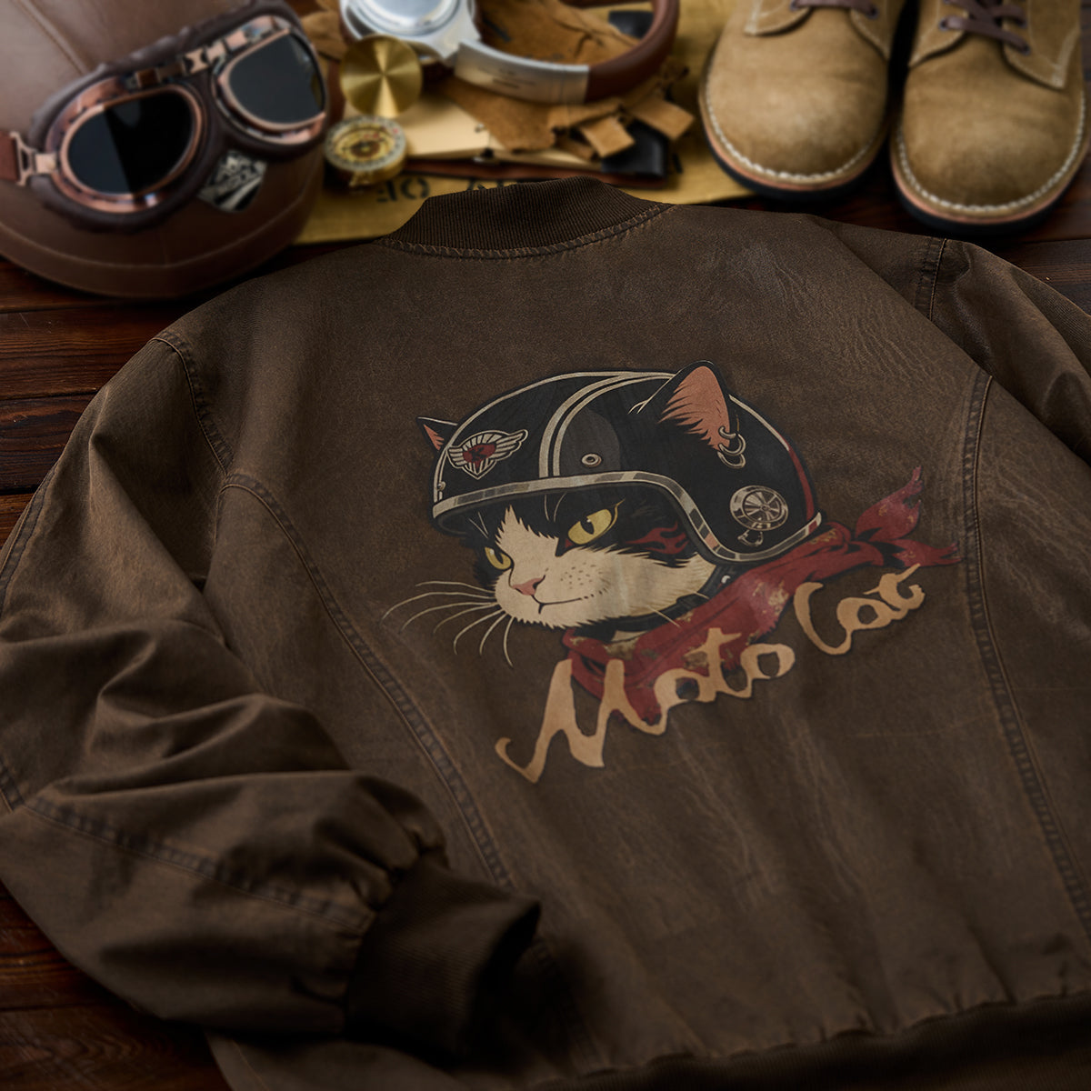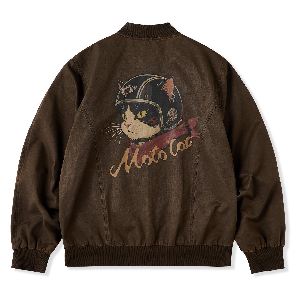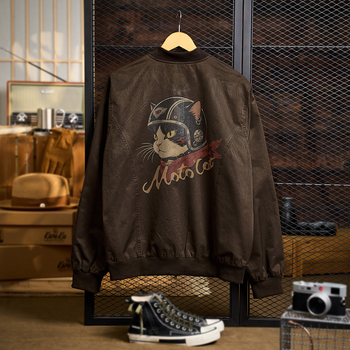 【사전예약】「헬멧 쓴 고양이」프린트 워싱 가공 더블 지퍼 스타디움 점퍼