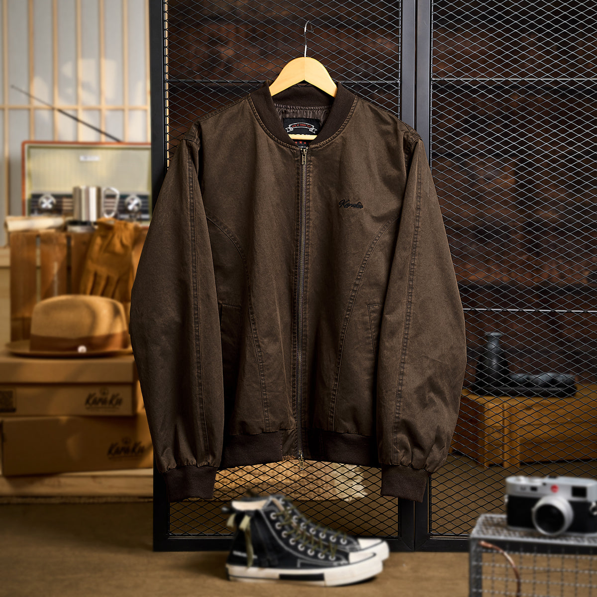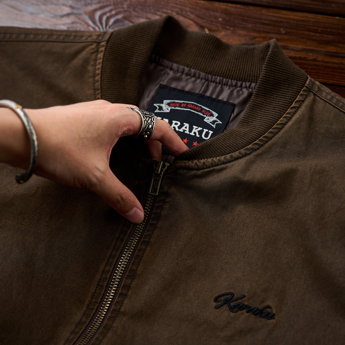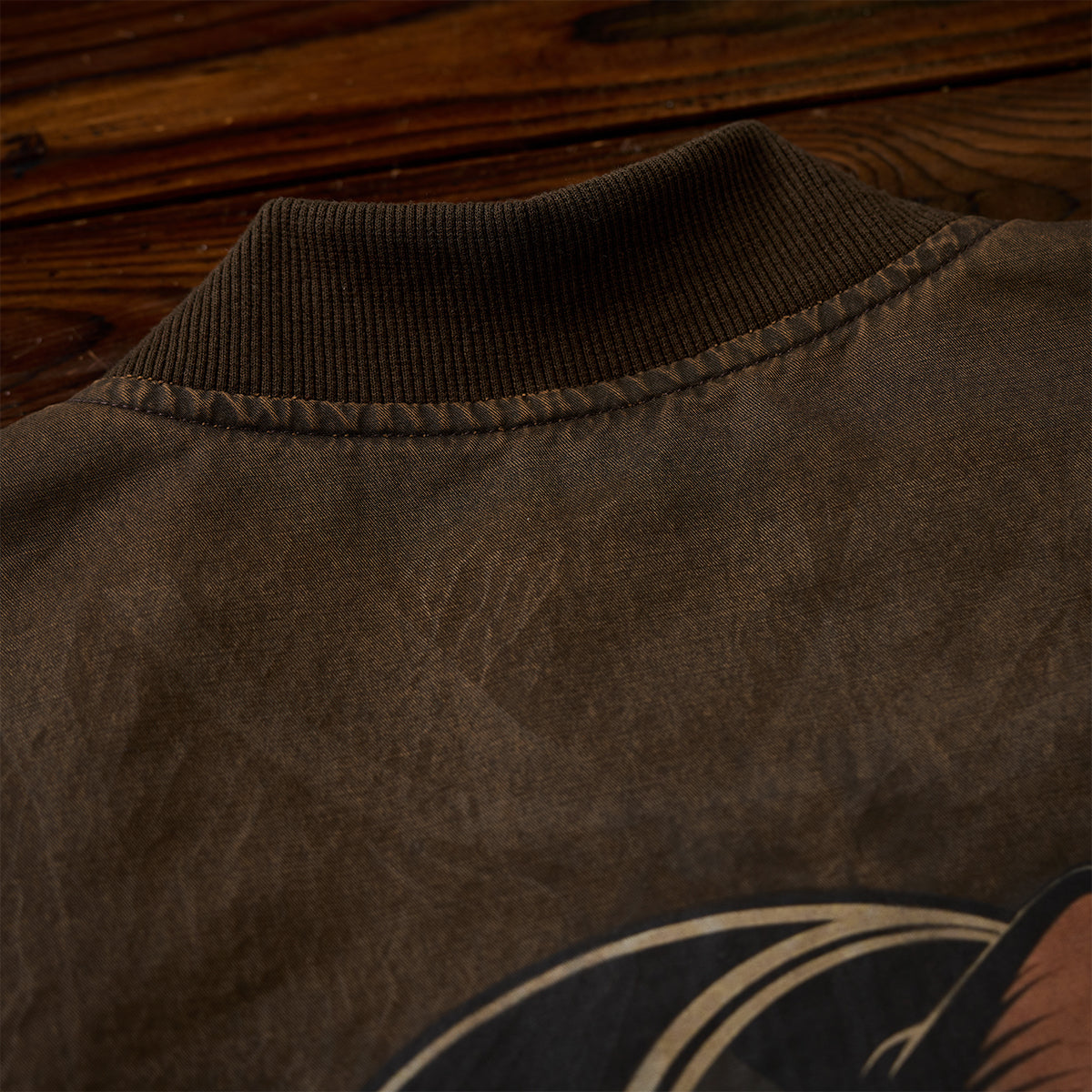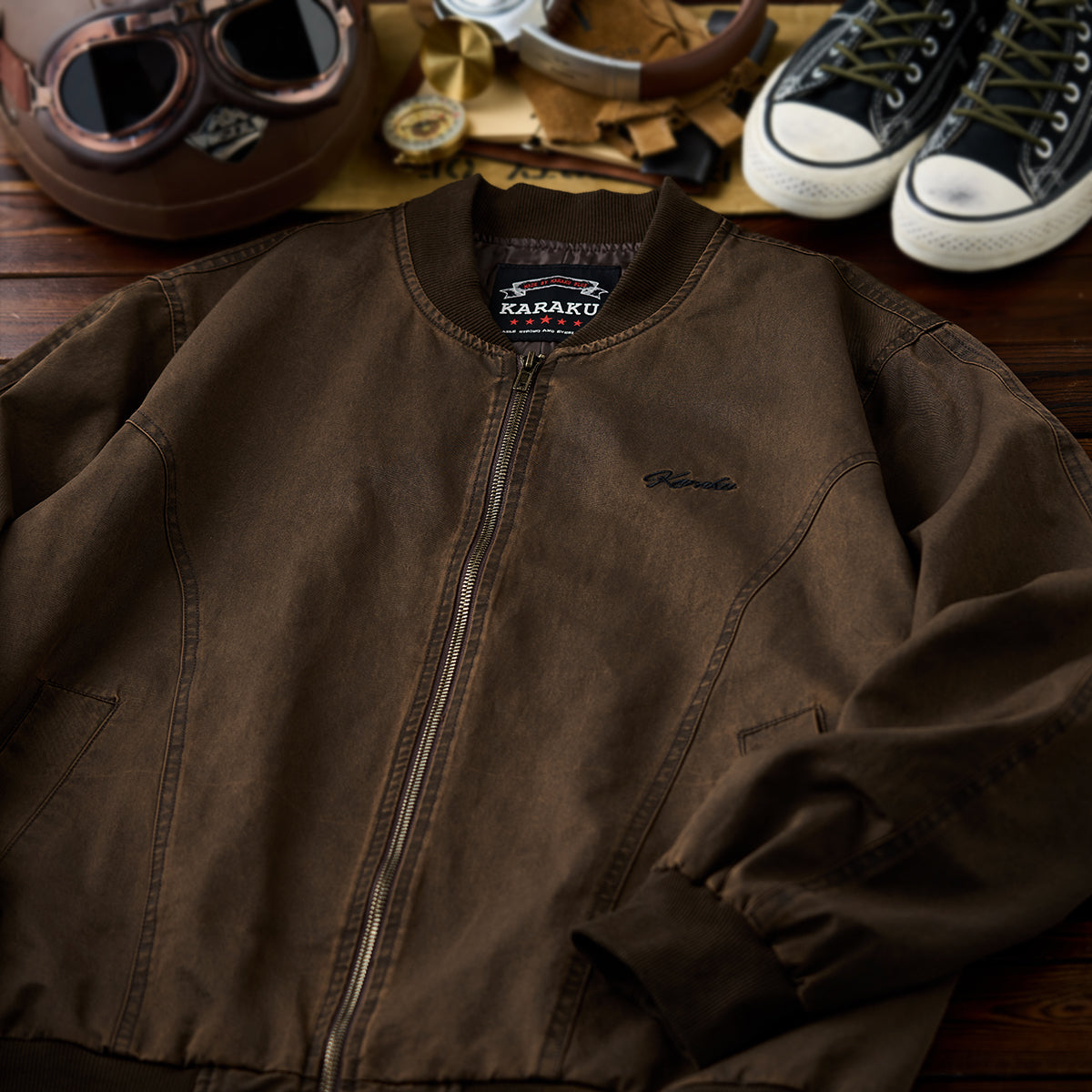 【사전예약】「헬멧 쓴 고양이」프린트 워싱 가공 더블 지퍼 스타디움 점퍼