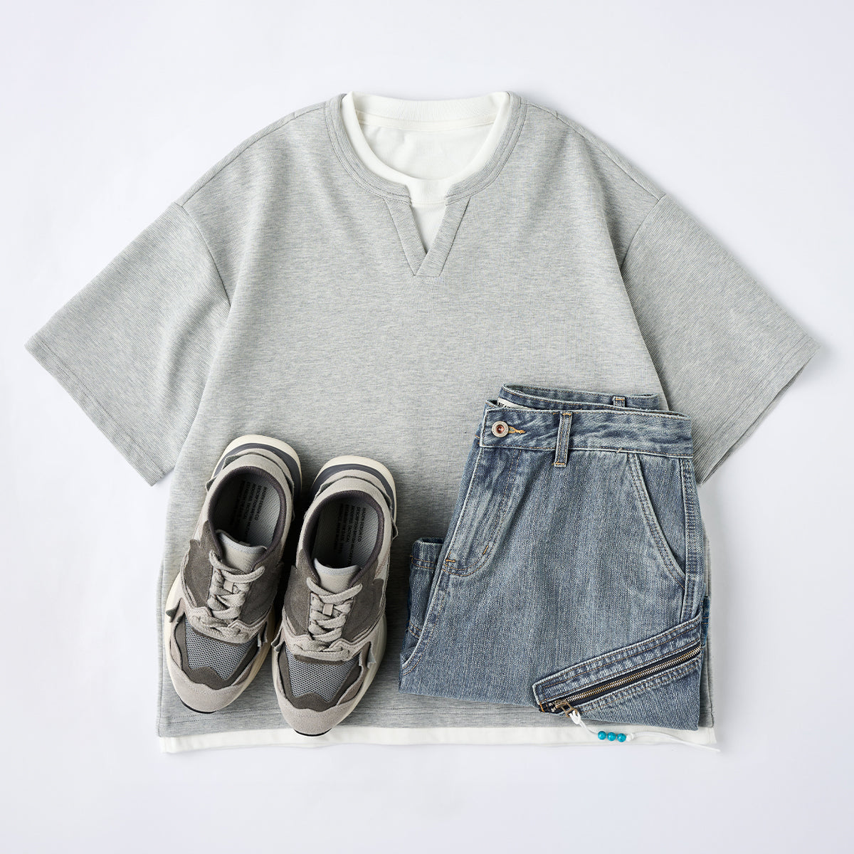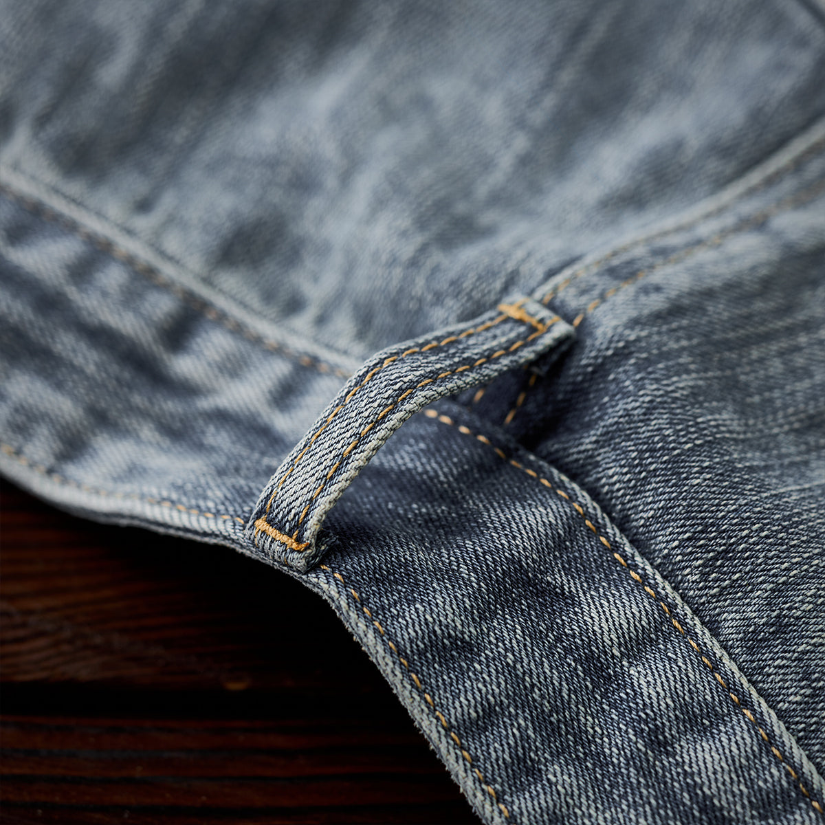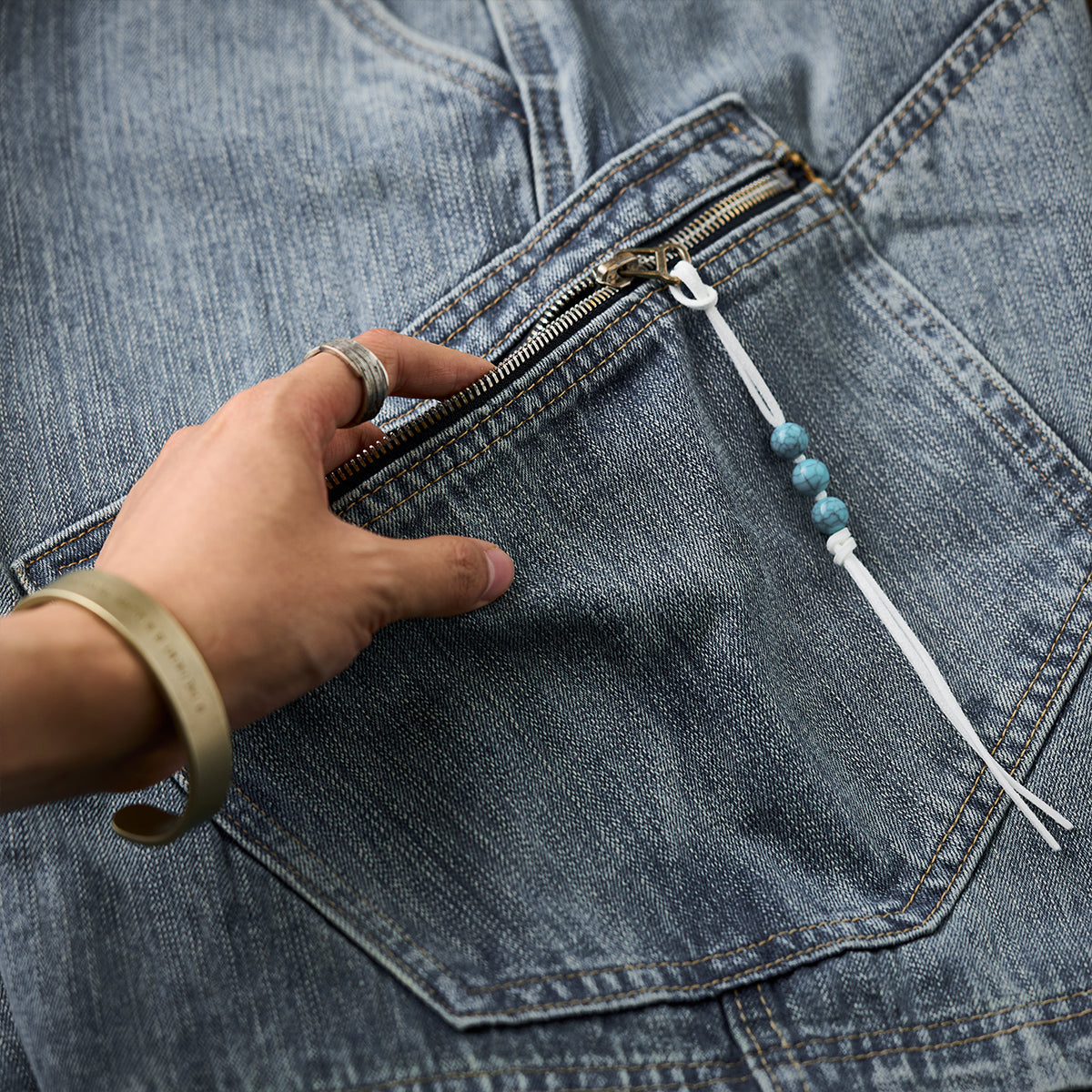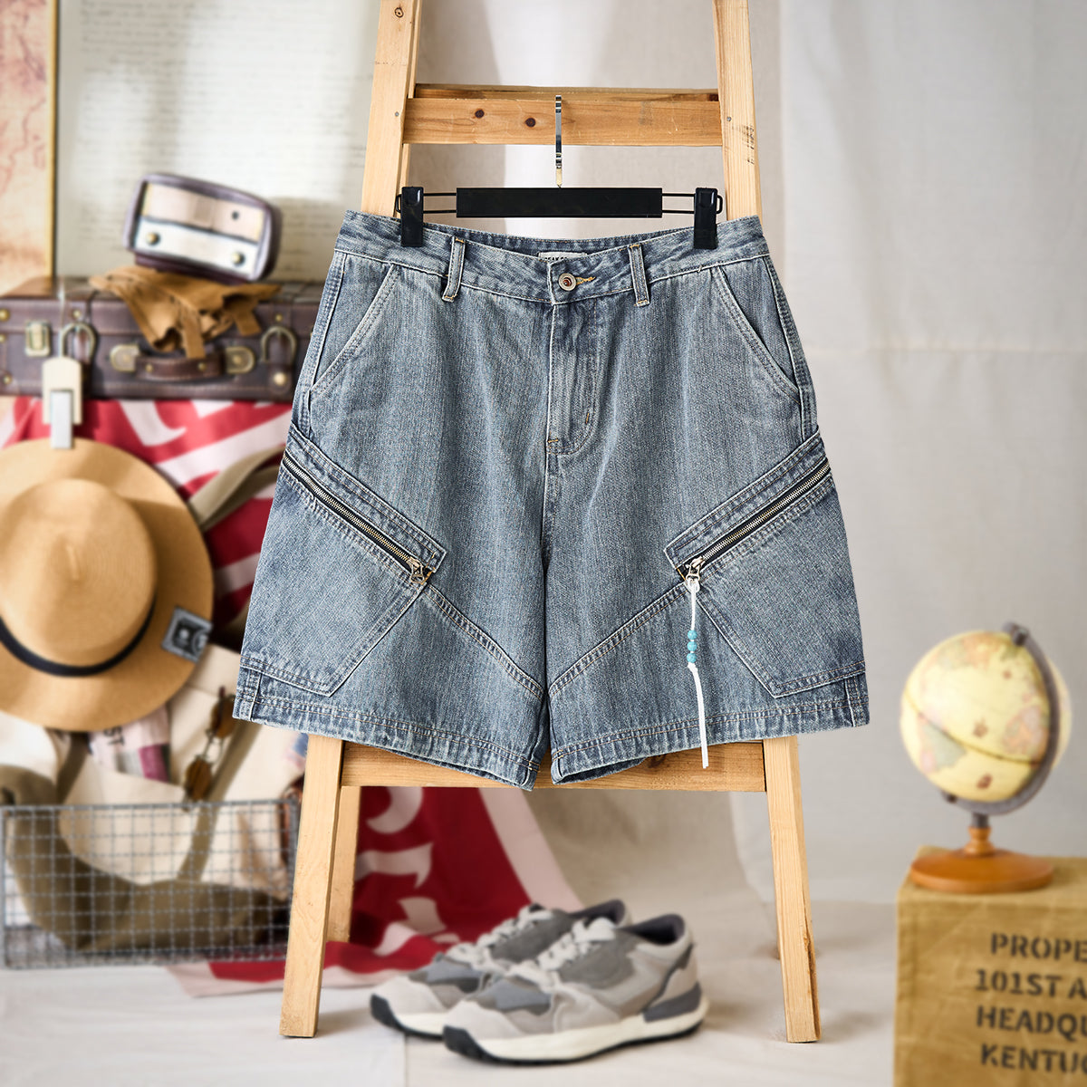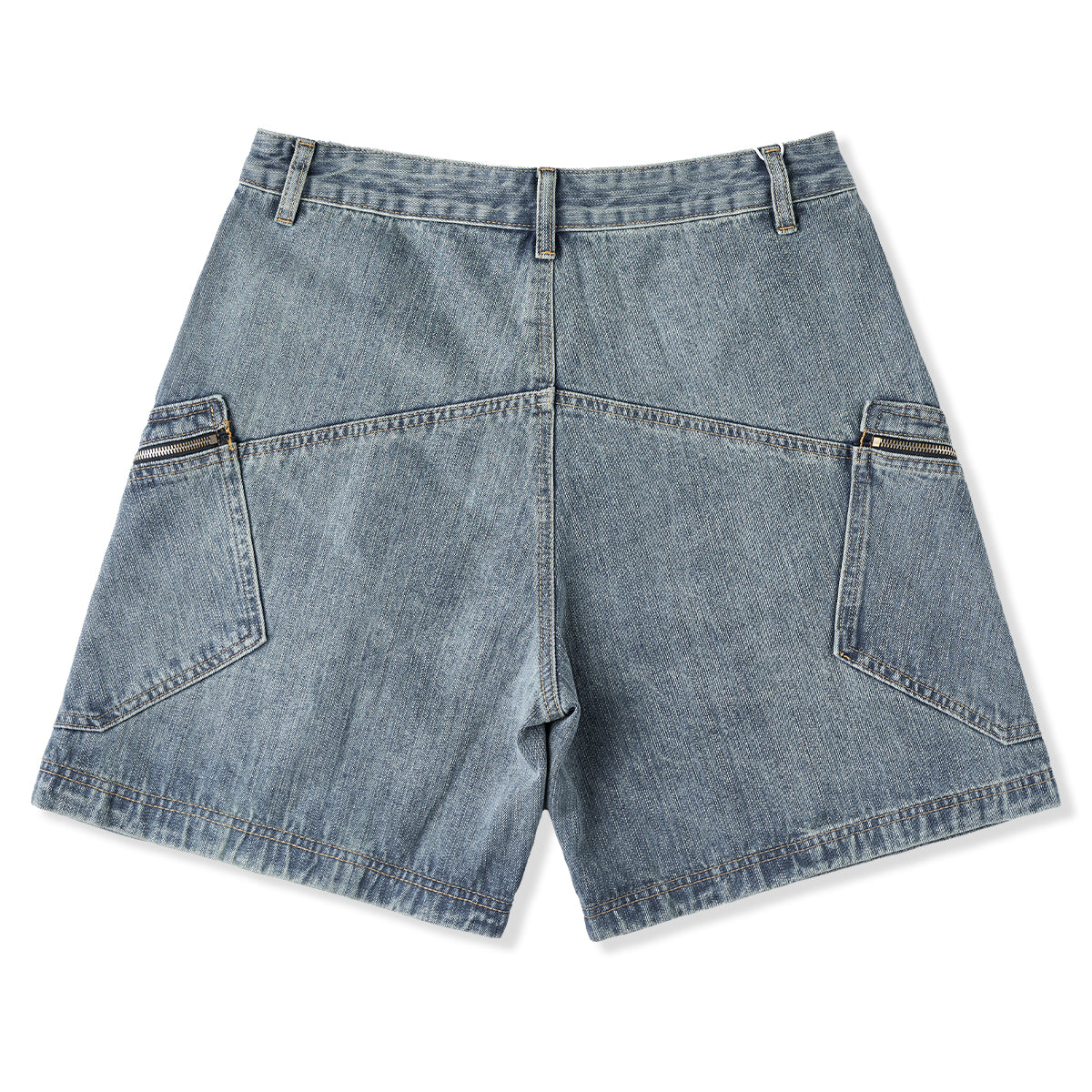 클래식한 라이트 블루 데님에 유즈드 워시 가공으로 빈티지한 매력을 살렸으며, 앞뒤 사선 포켓과 지퍼 디테일로 실용성과 독특한 디자인을 더했습니다.