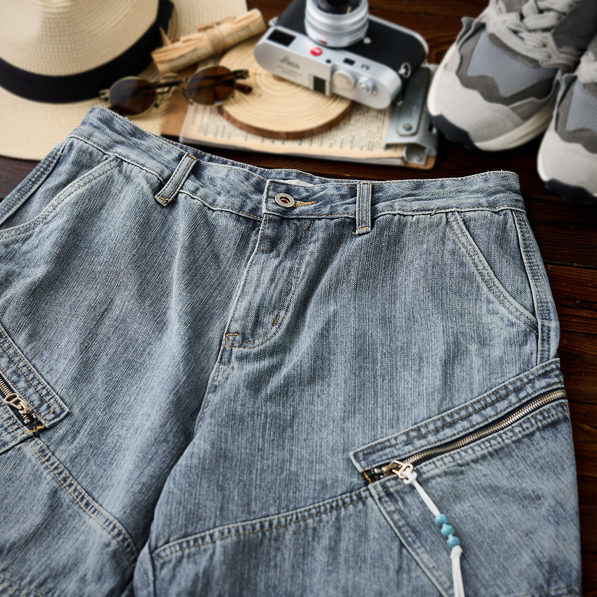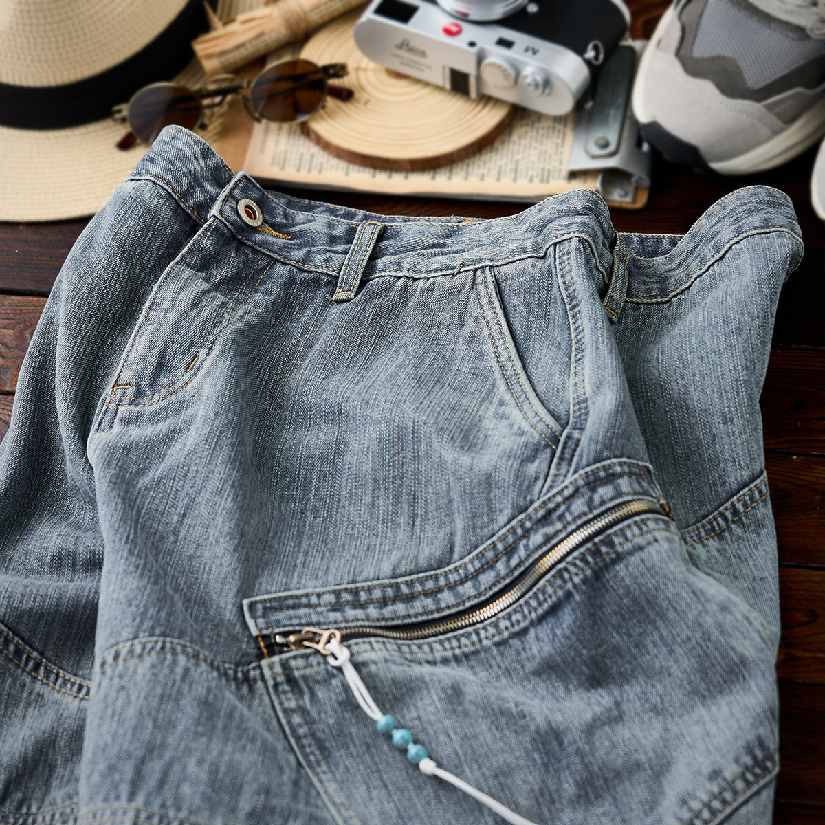 여름감성의 유즈드 워시 데님 팬츠, 실용적 지퍼 포켓과 편안한 핏으로 캐주얼·아웃도어에 적합합니다.