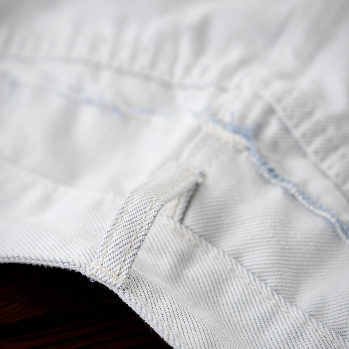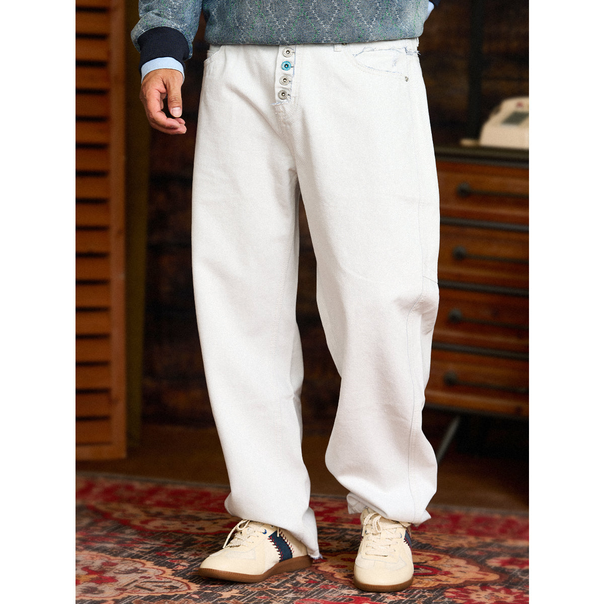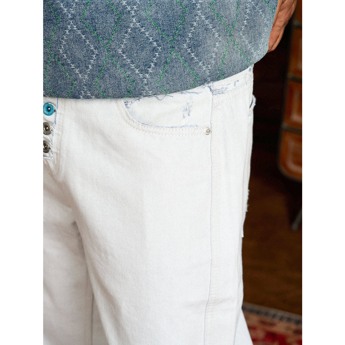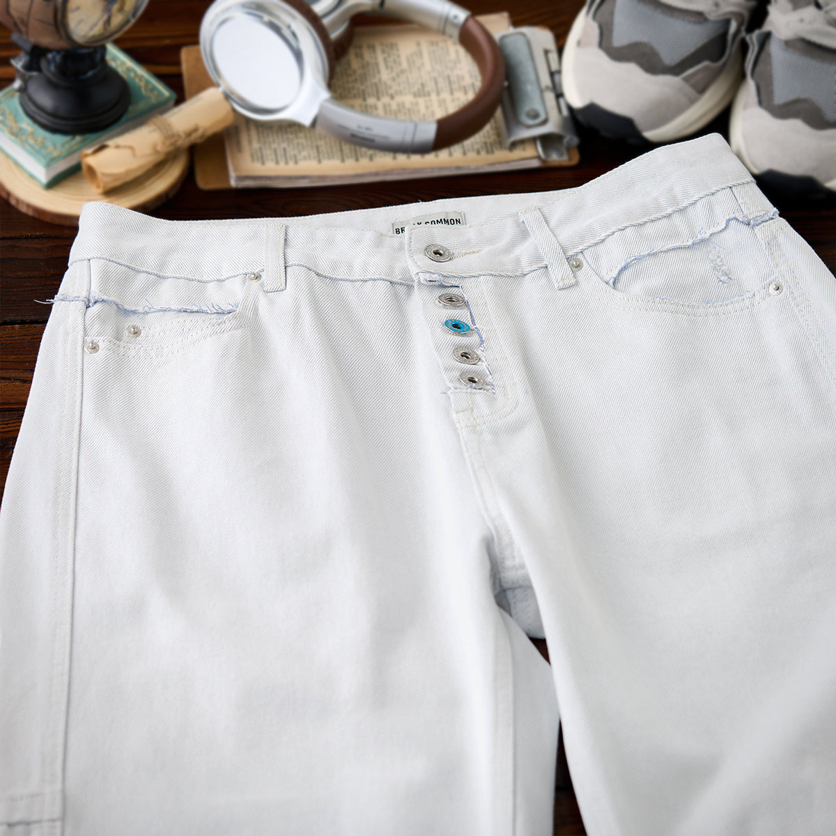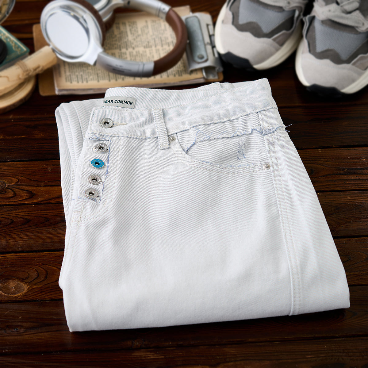 자연스러운 데미지와 프린지, 배색 버튼 플라이가 돋보이는 화이트 데님 팬츠로, 다양한 스타일에 잘 어울립니다.