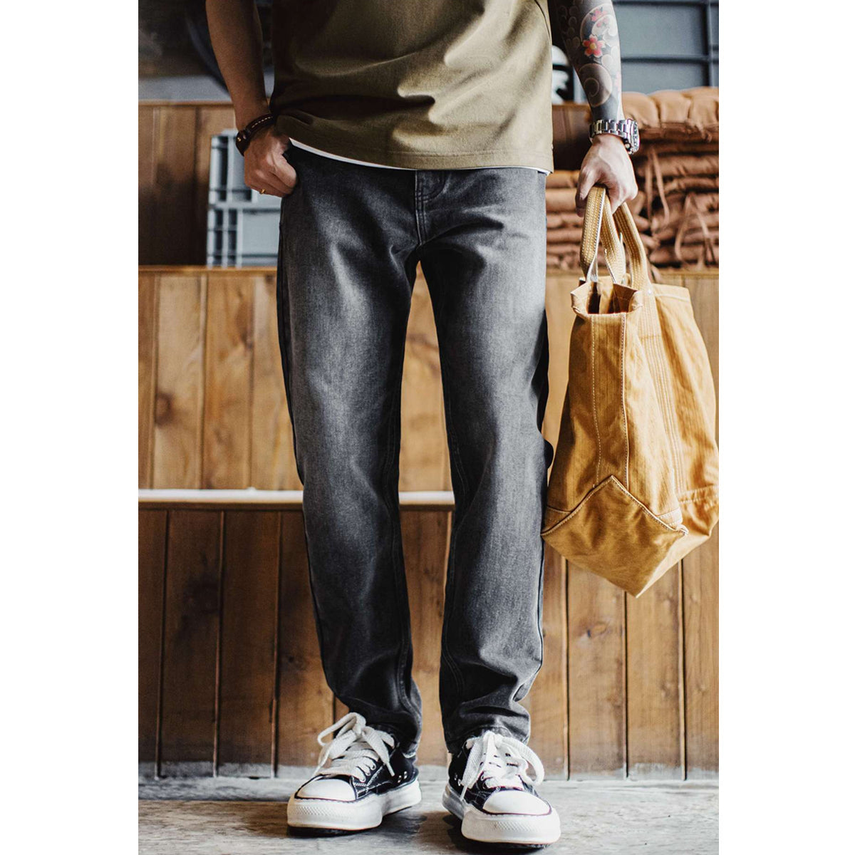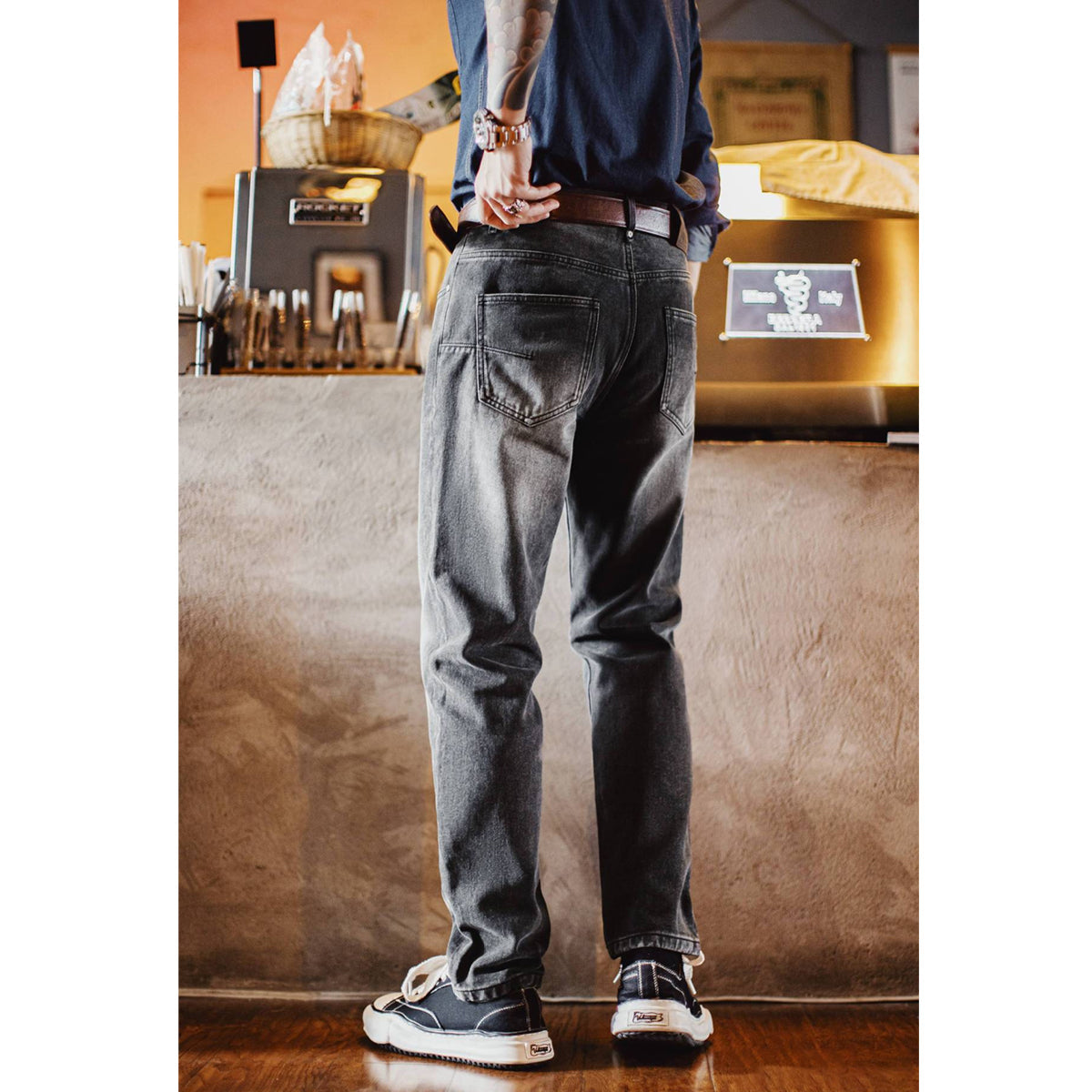 워시드 가공 테이퍼드 그레이 데님 팬츠