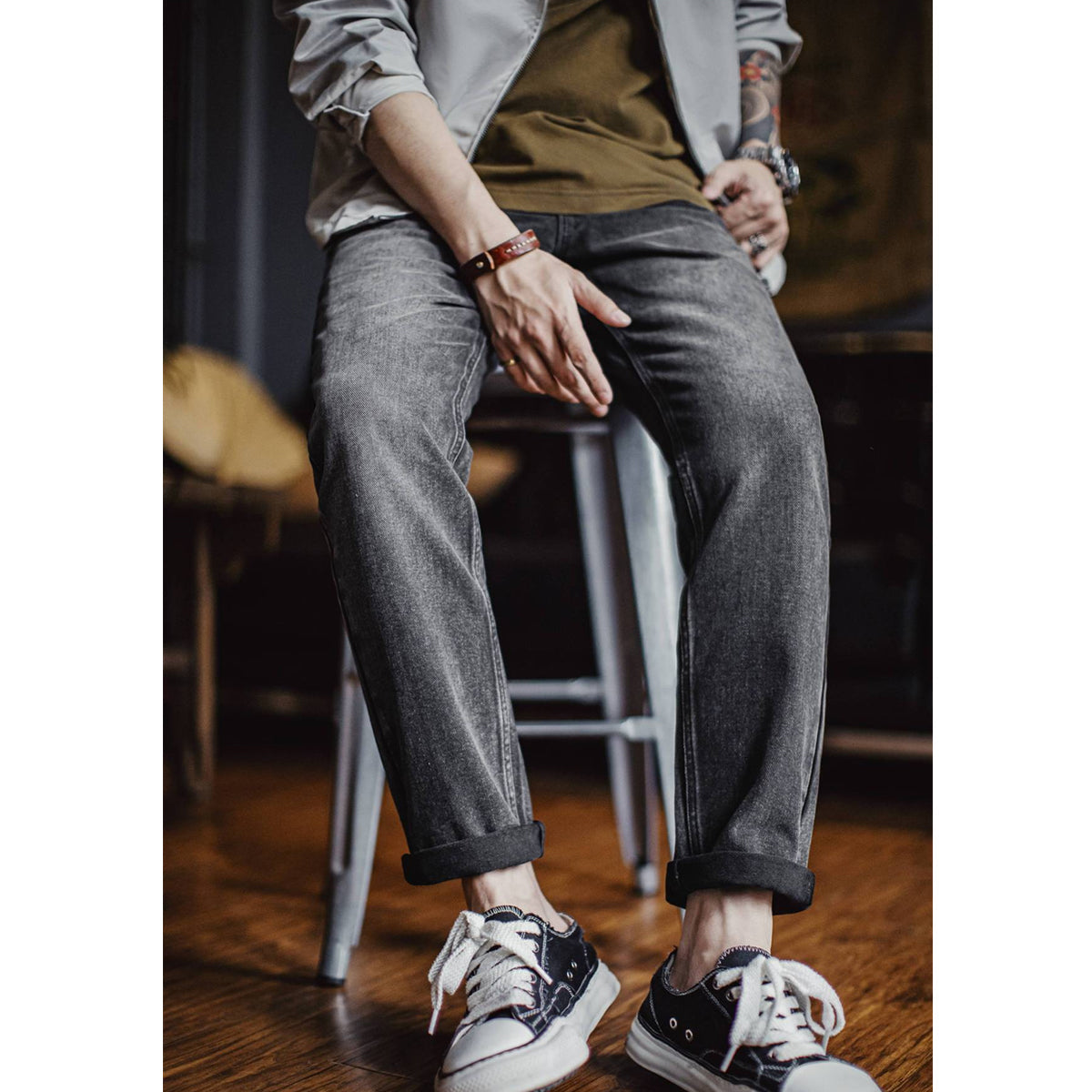 워시드 그레이 데님 팬츠로 세련된 워싱과 편안한 착용감, 다양한 스타일링이 가능한 아이템입니다.