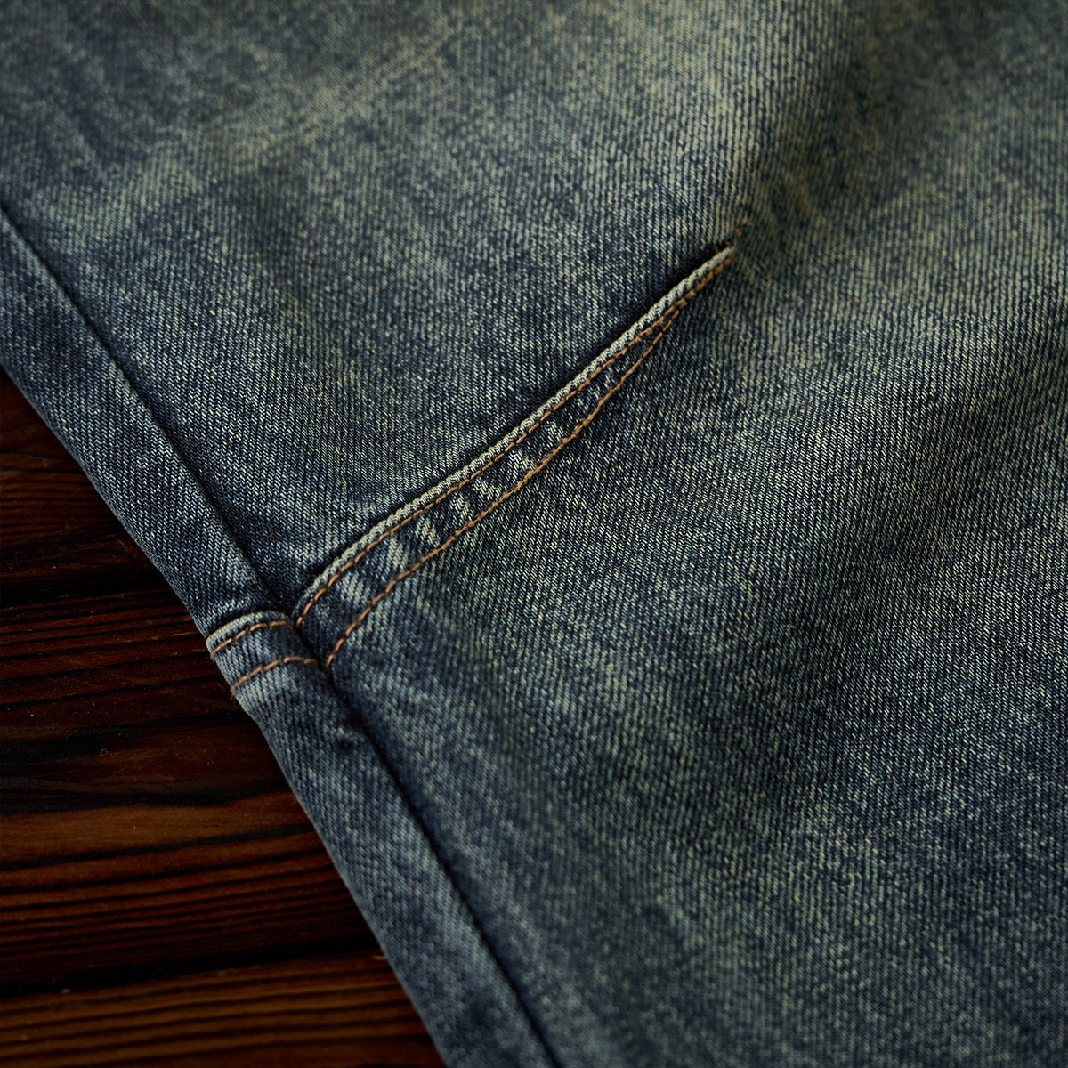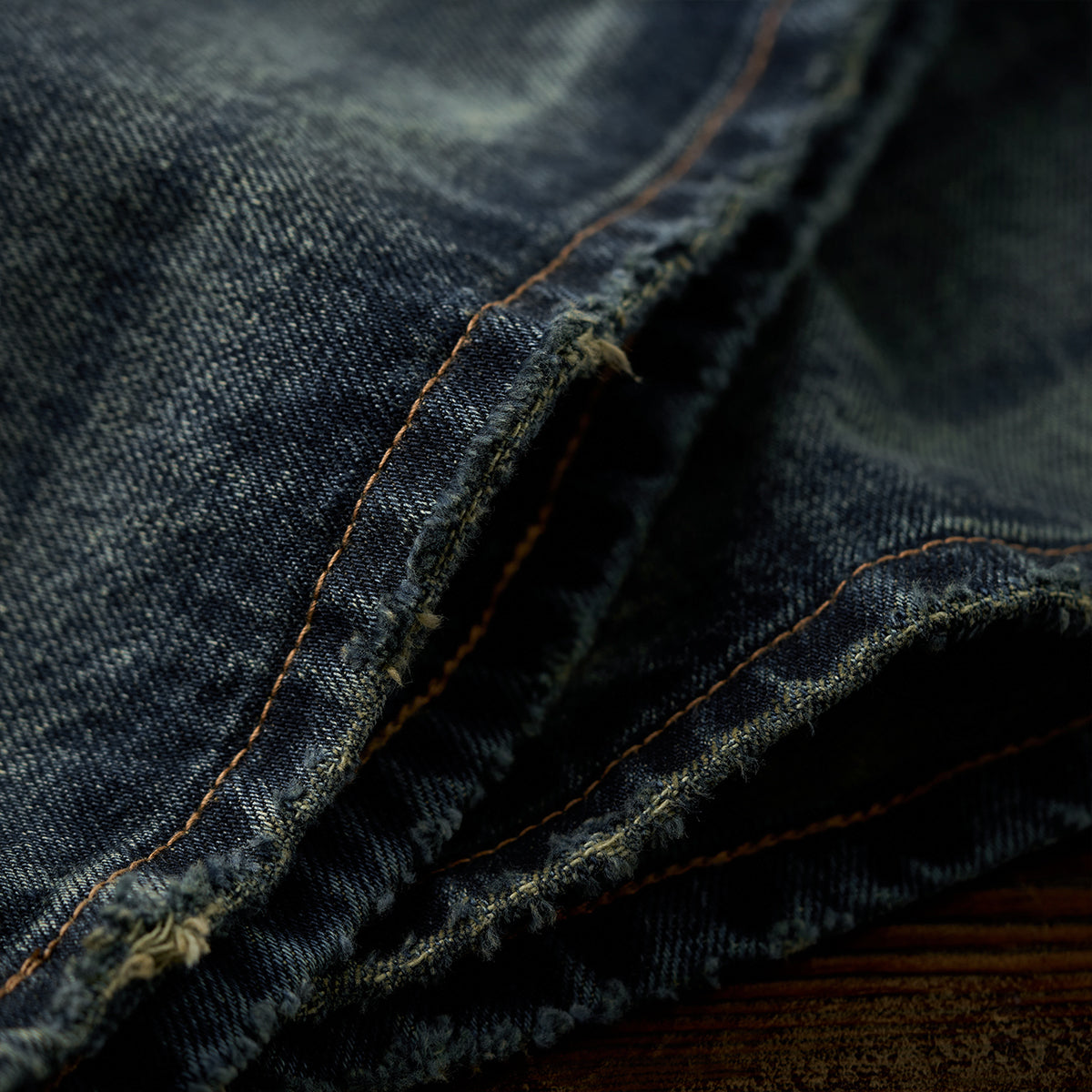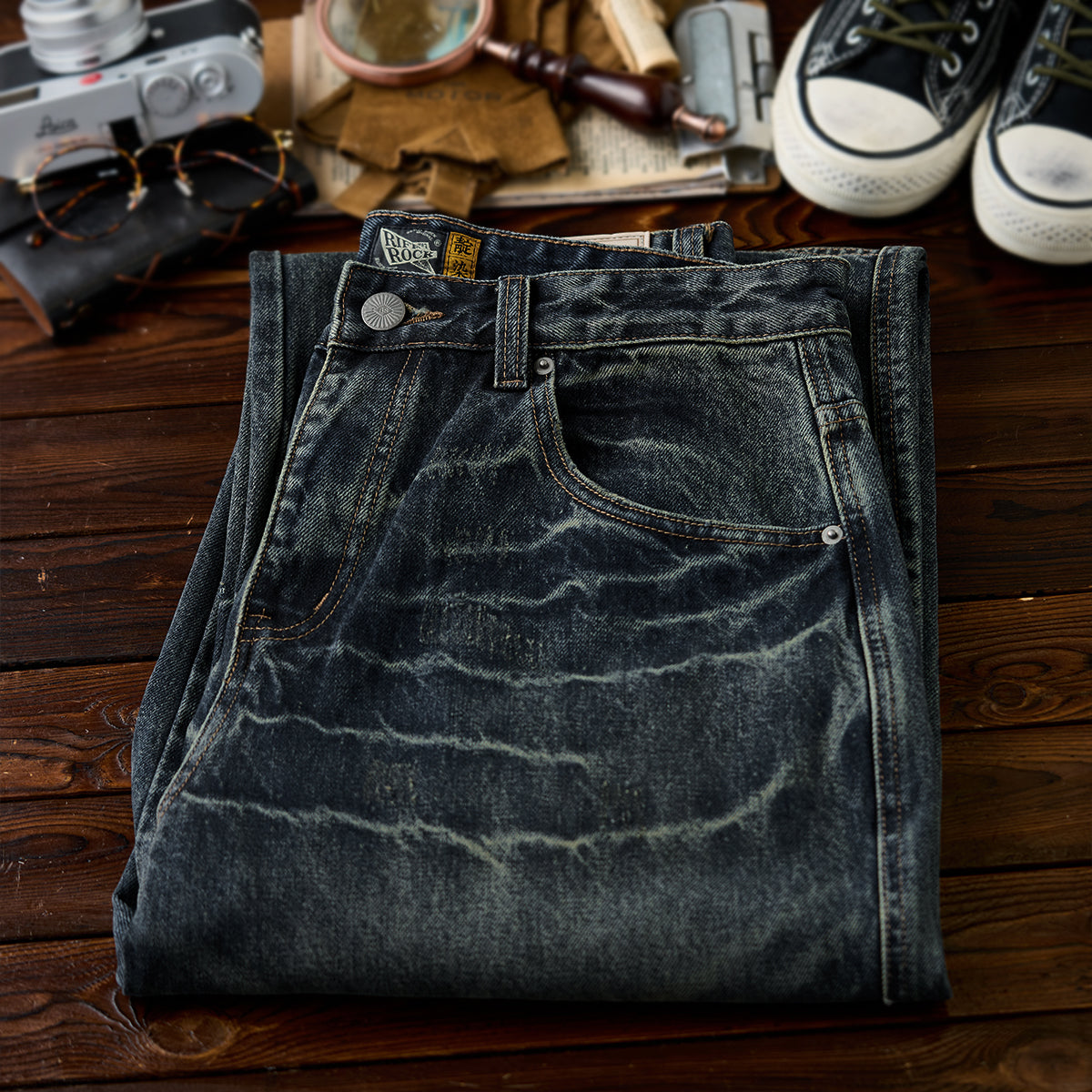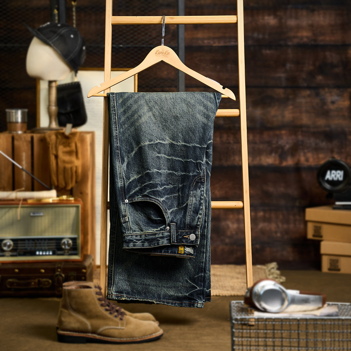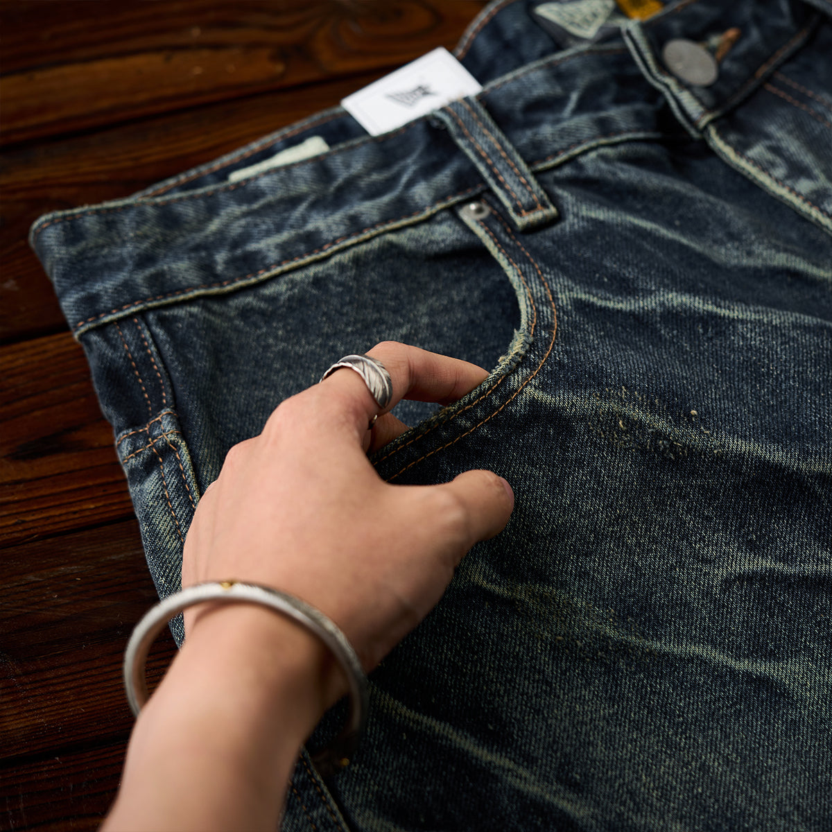 고양이 수염처럼 부분 워싱 처리된 데님 팬츠로 빈티지 효과와 자연스러운 착용감을 제공합니다.