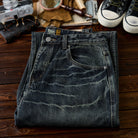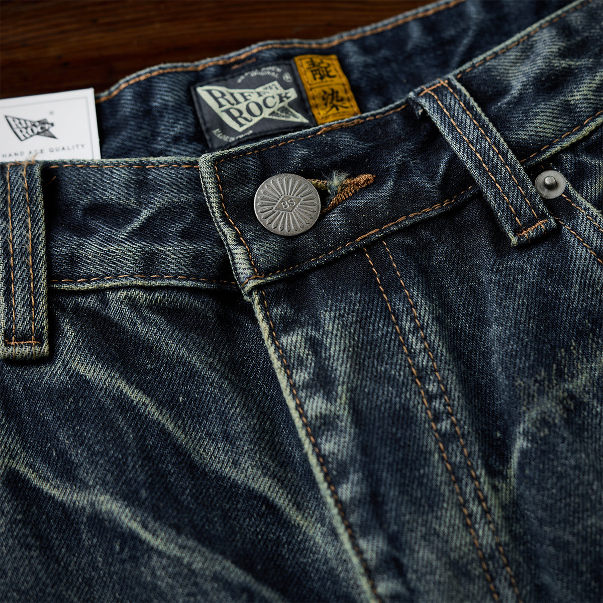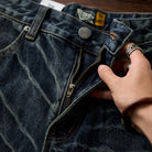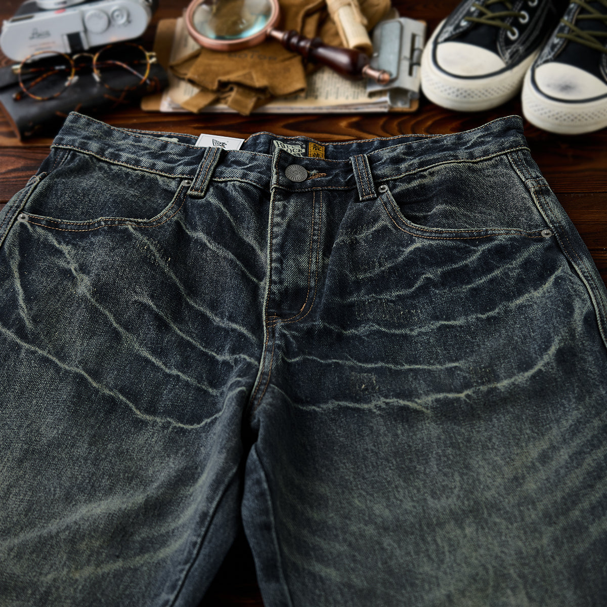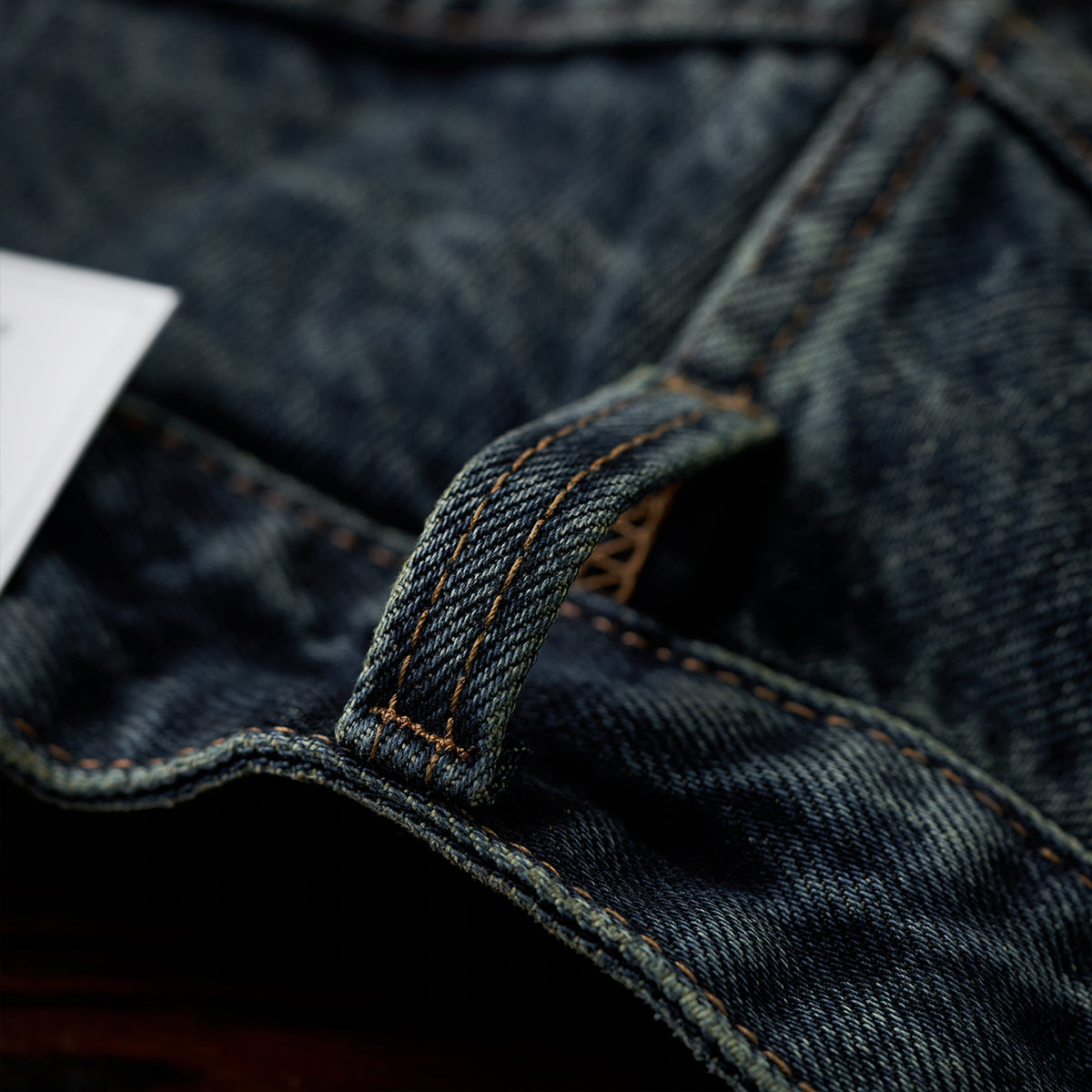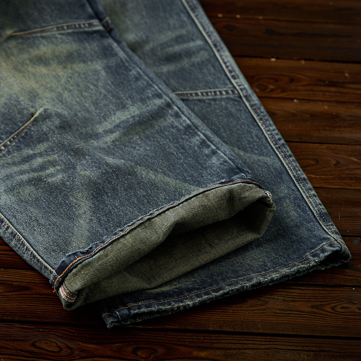 고양이 수염처럼 부분 워싱 처리된 데님 팬츠로 빈티지 효과와 자연스러운 착용감을 제공합니다.