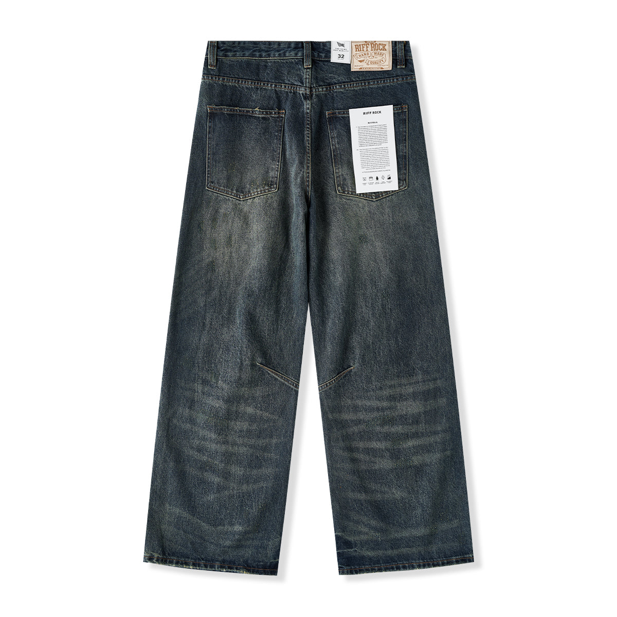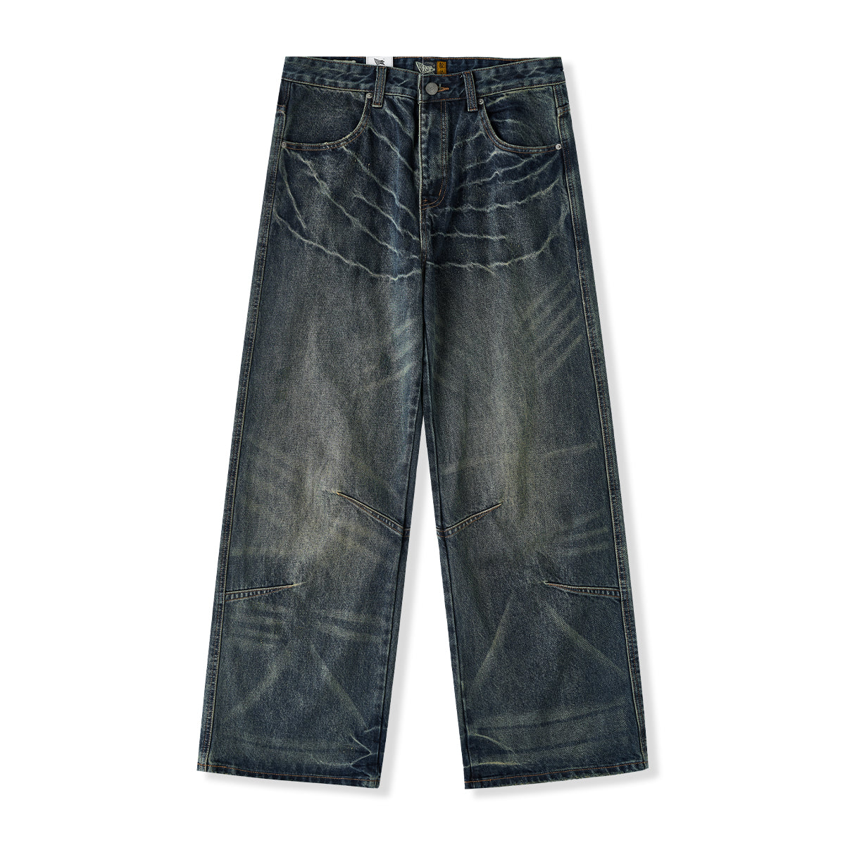 캣 워싱 가공으로 자연스러운 착용감을 주는 데님 팬츠입니다. 페이드와 그라데이션 효과, 스트레이트 와이드 실루엣이 특징이며, 무릎 부분의 절개 스티치가 포인트가 됩니다.