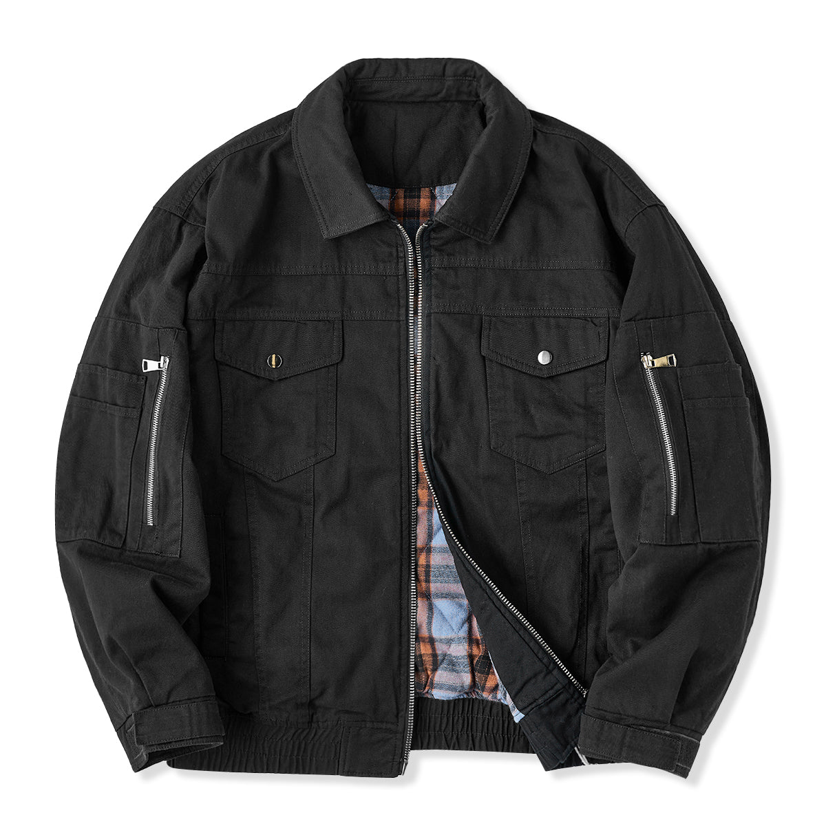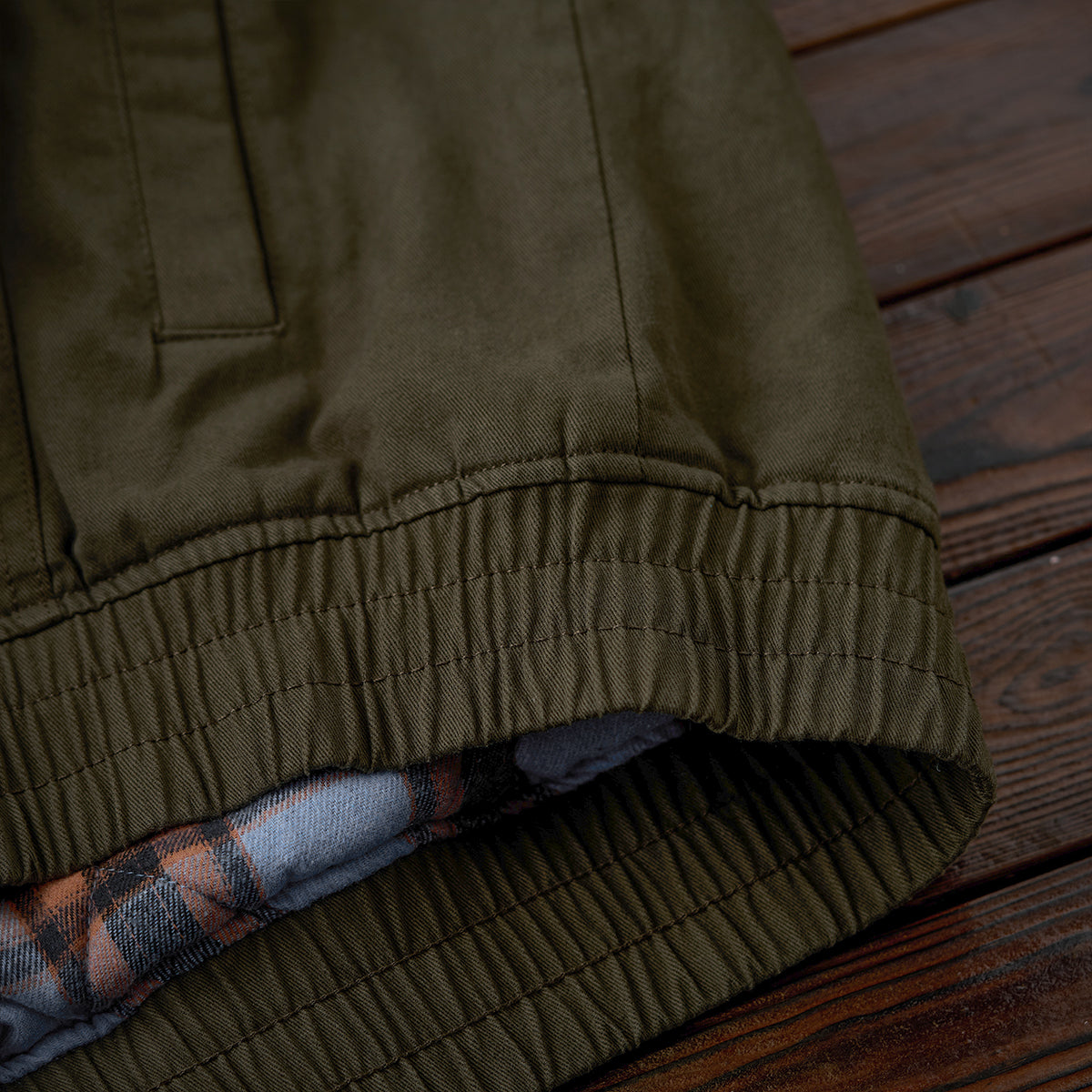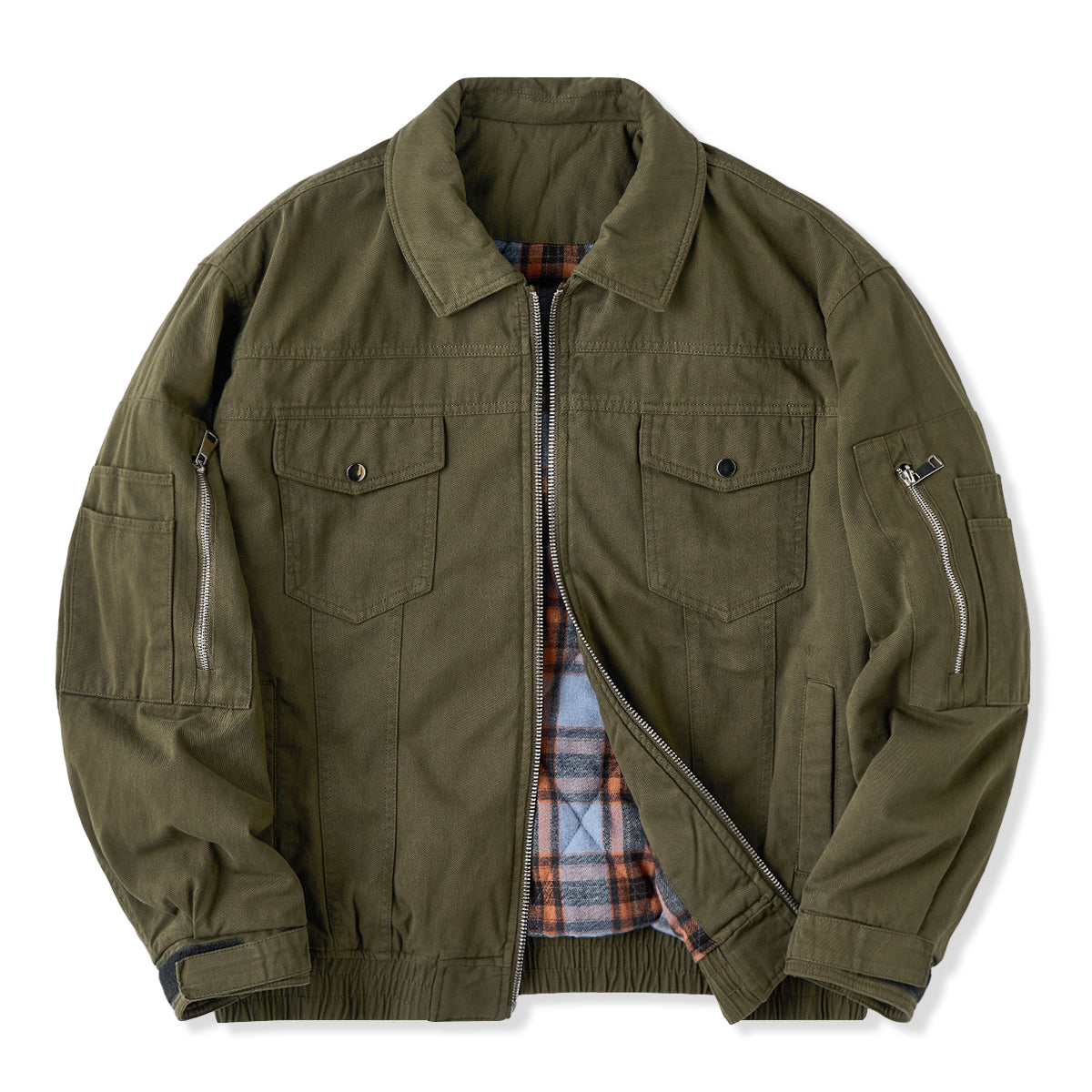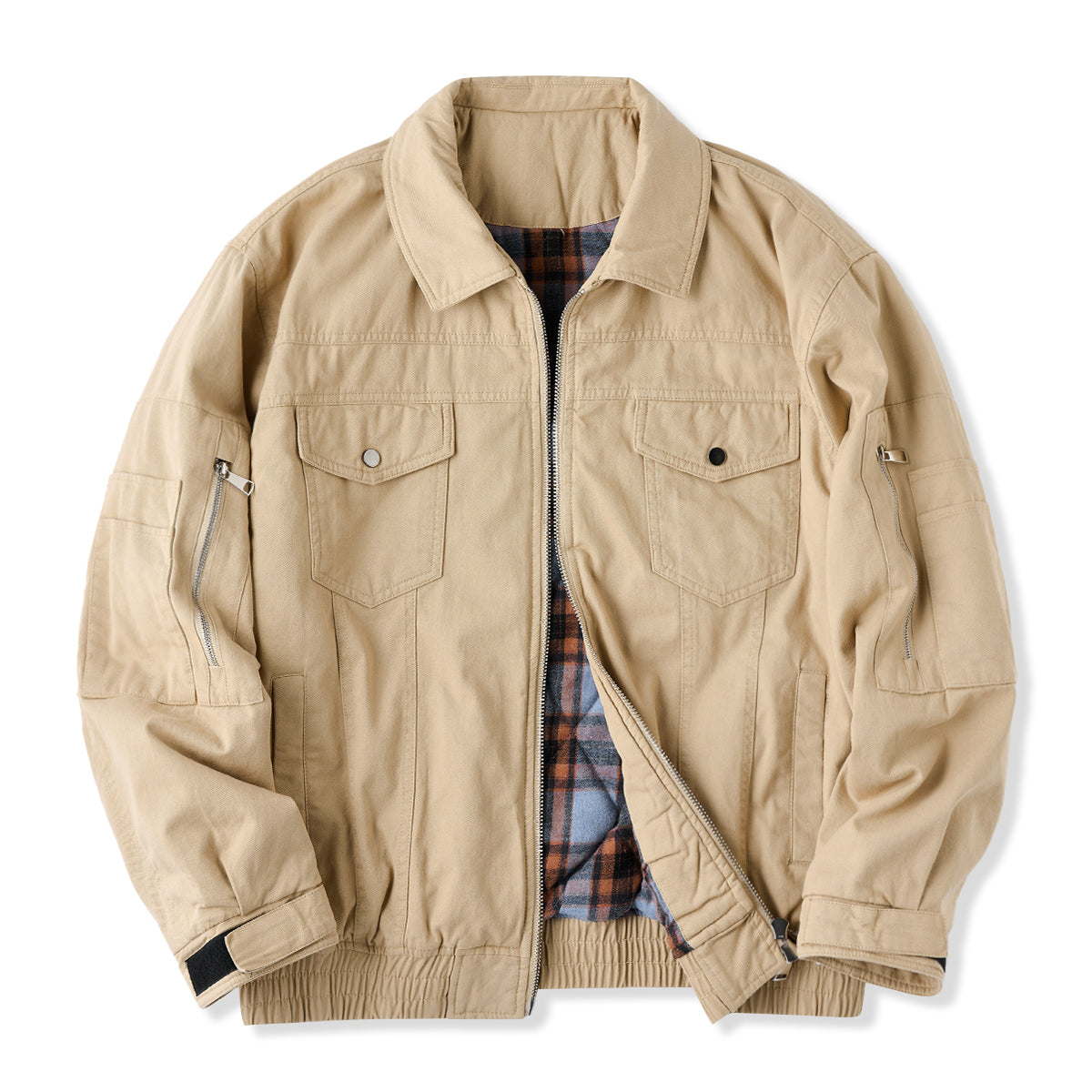 가슴 플랩 포켓과 소매 지퍼 포켓, 밑단 밴딩 처리, 체크 안감이 포인트인 솜 자켓으로, 보온성이 뛰어나 가을·겨울 시즌에 적합합니다.