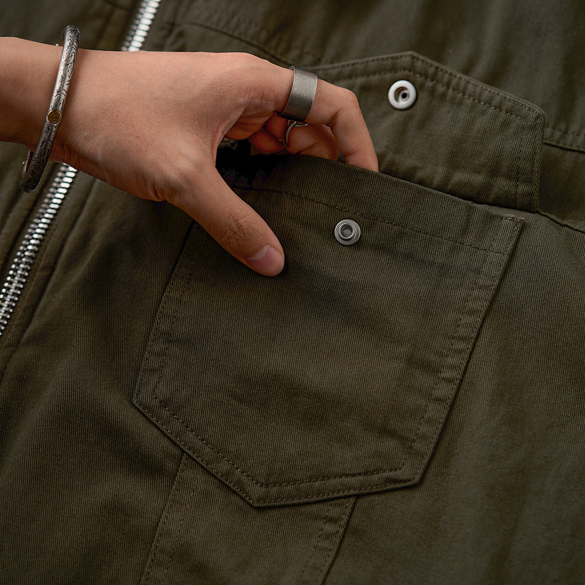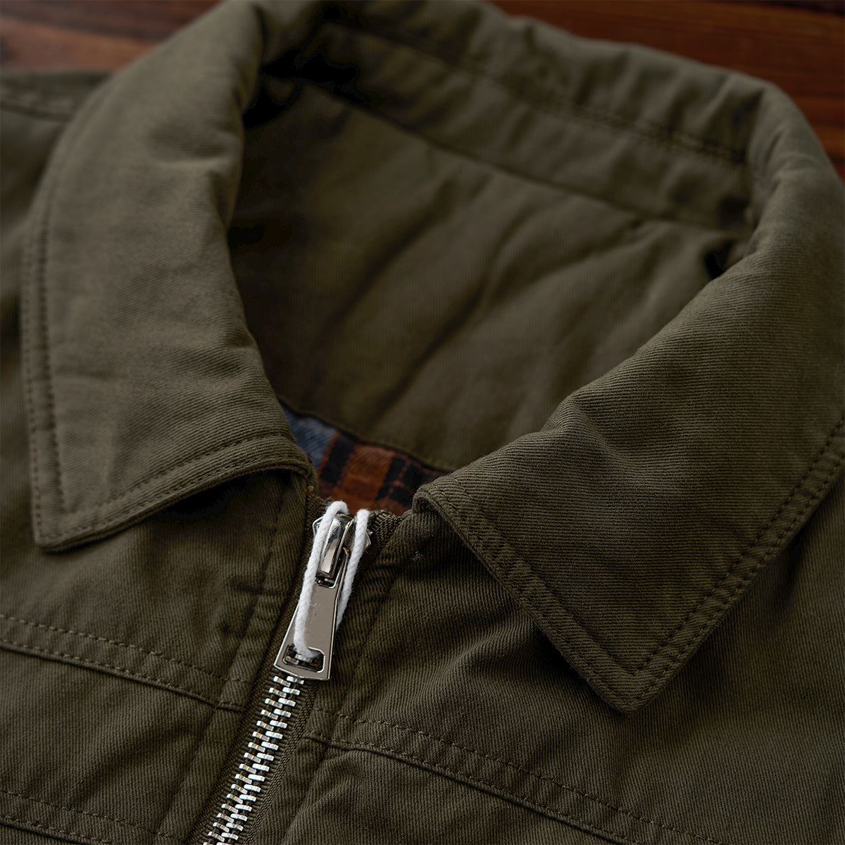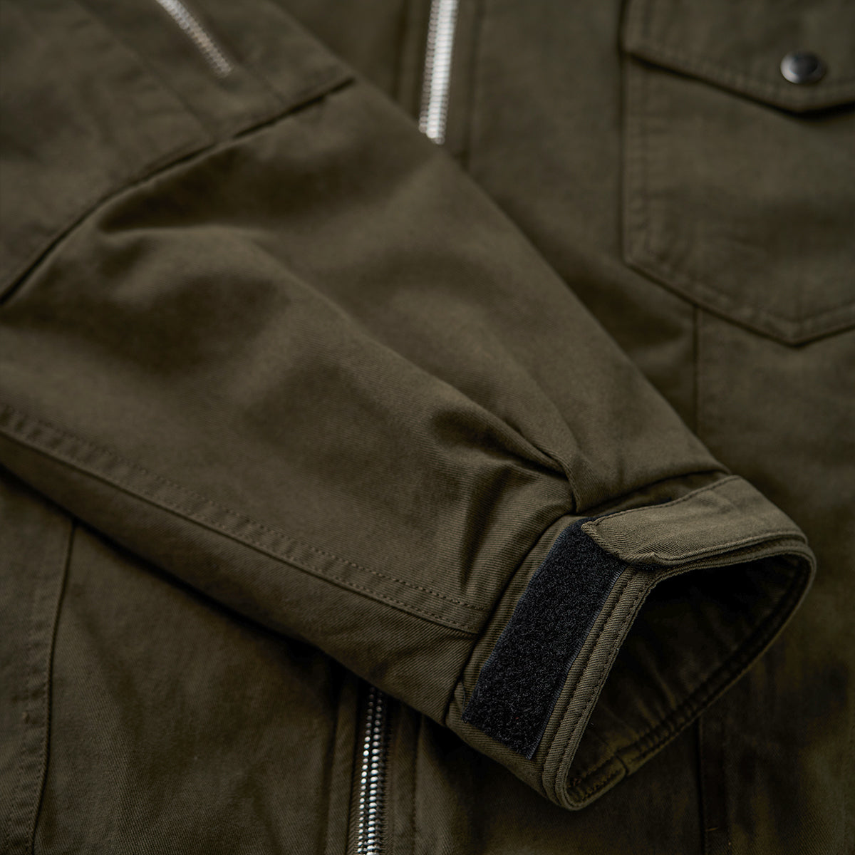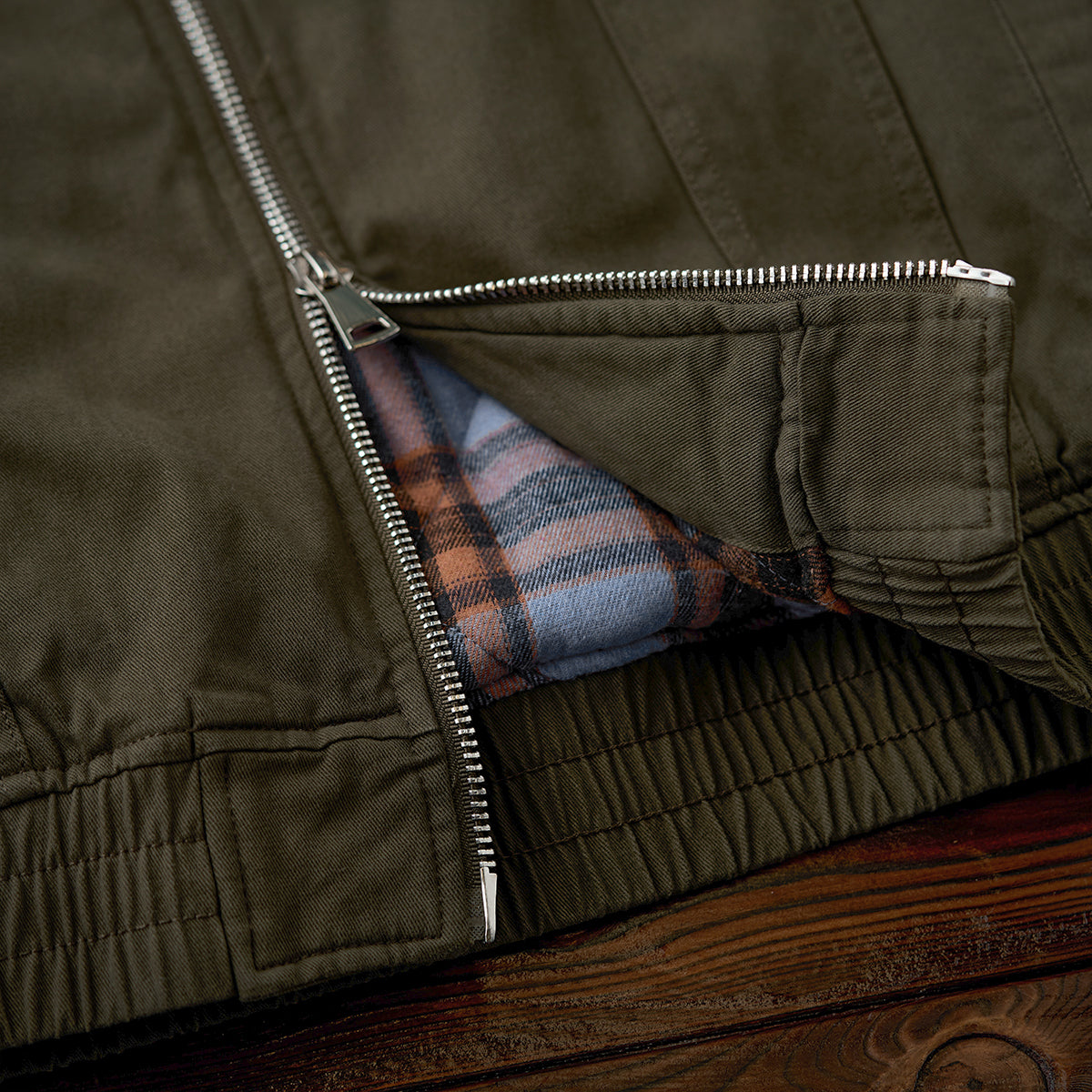 가슴 플랩 포켓과 소매 지퍼 포켓, 밑단 밴딩 처리, 체크 안감이 포인트인 솜 자켓으로, 보온성이 뛰어나 가을·겨울 시즌에 적합합니다.