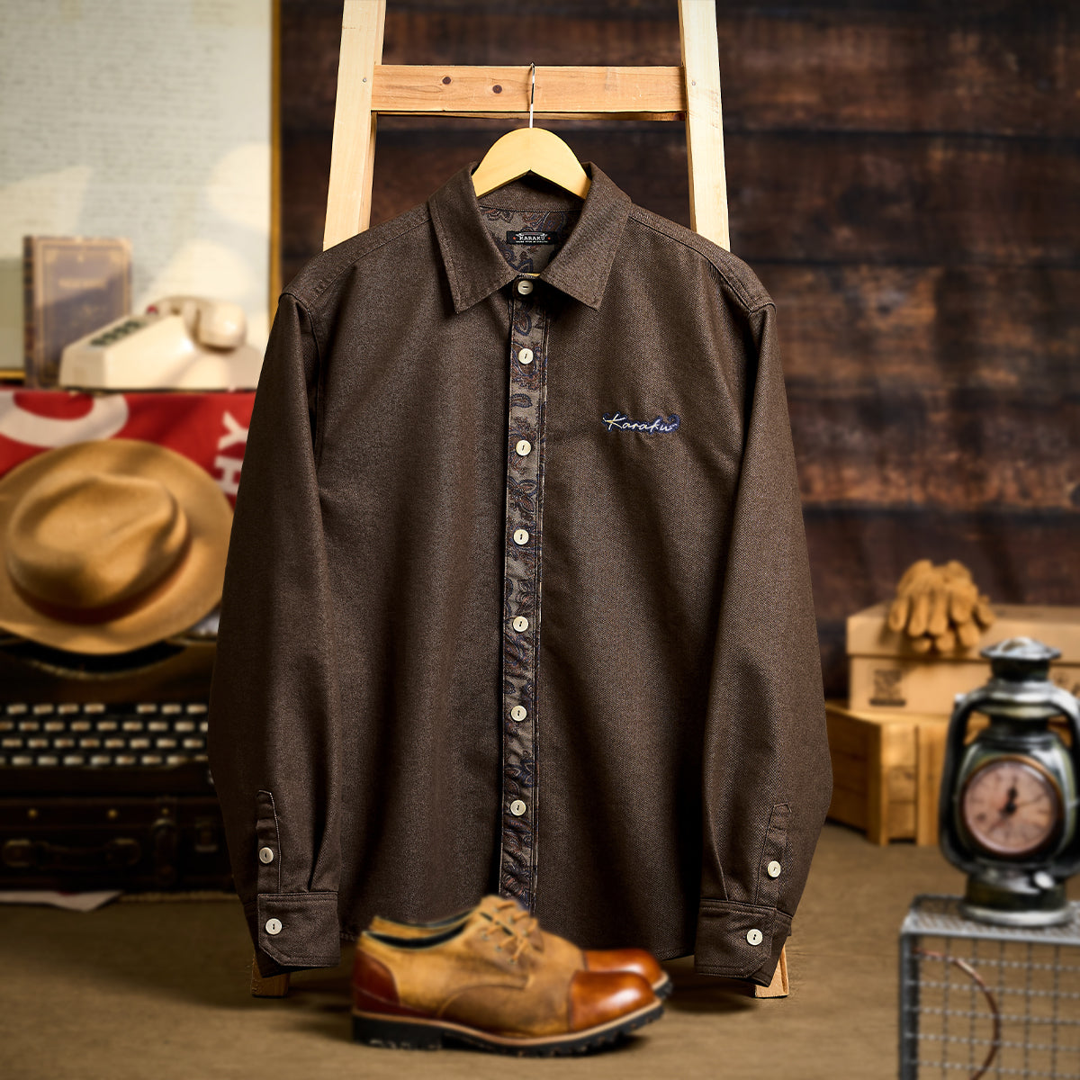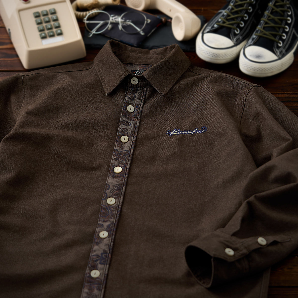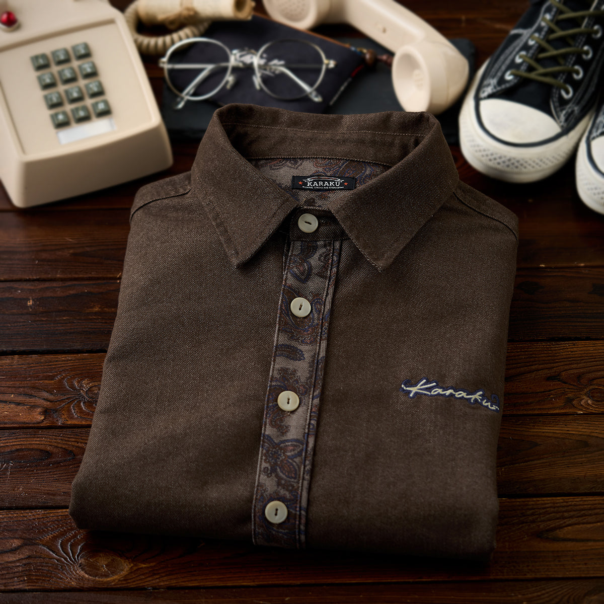 【사전예약】「Karaku」로고 자수 페이즐리 안감 데님 긴팔 셔츠
