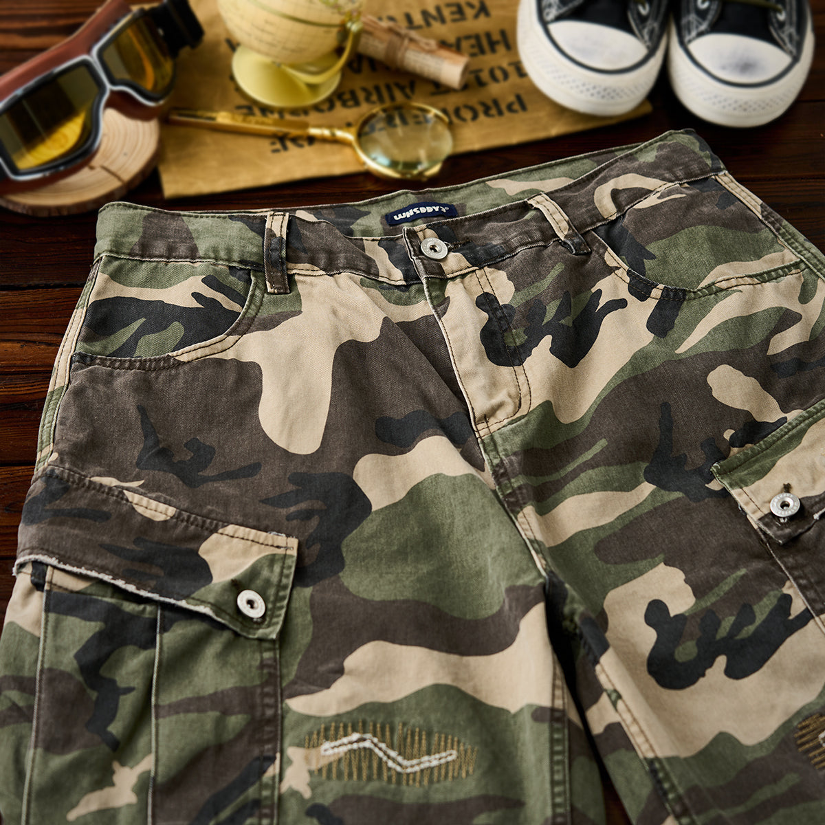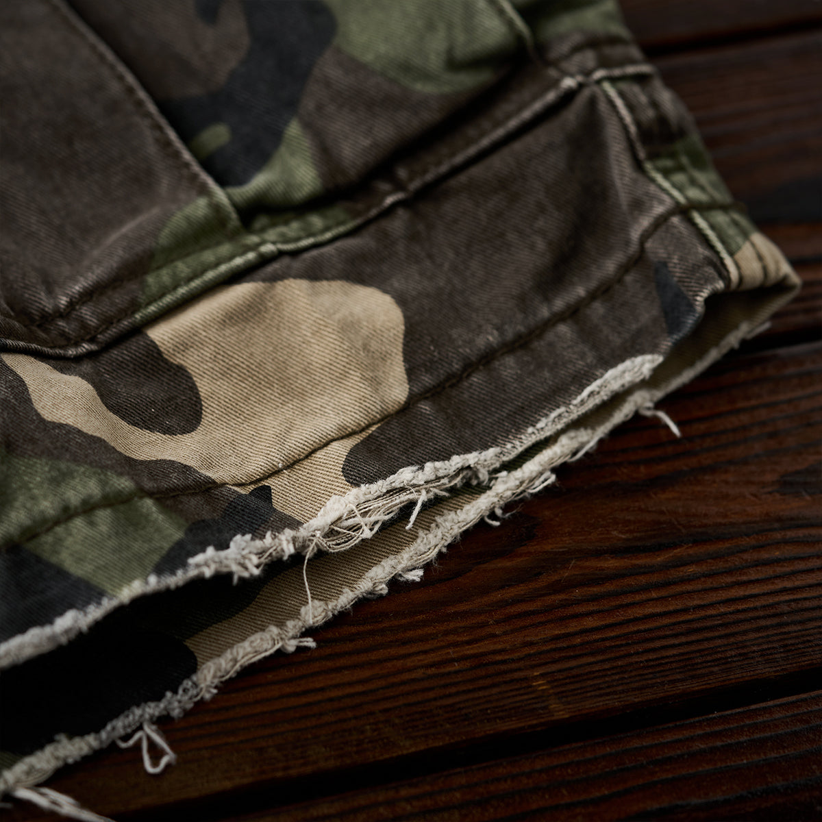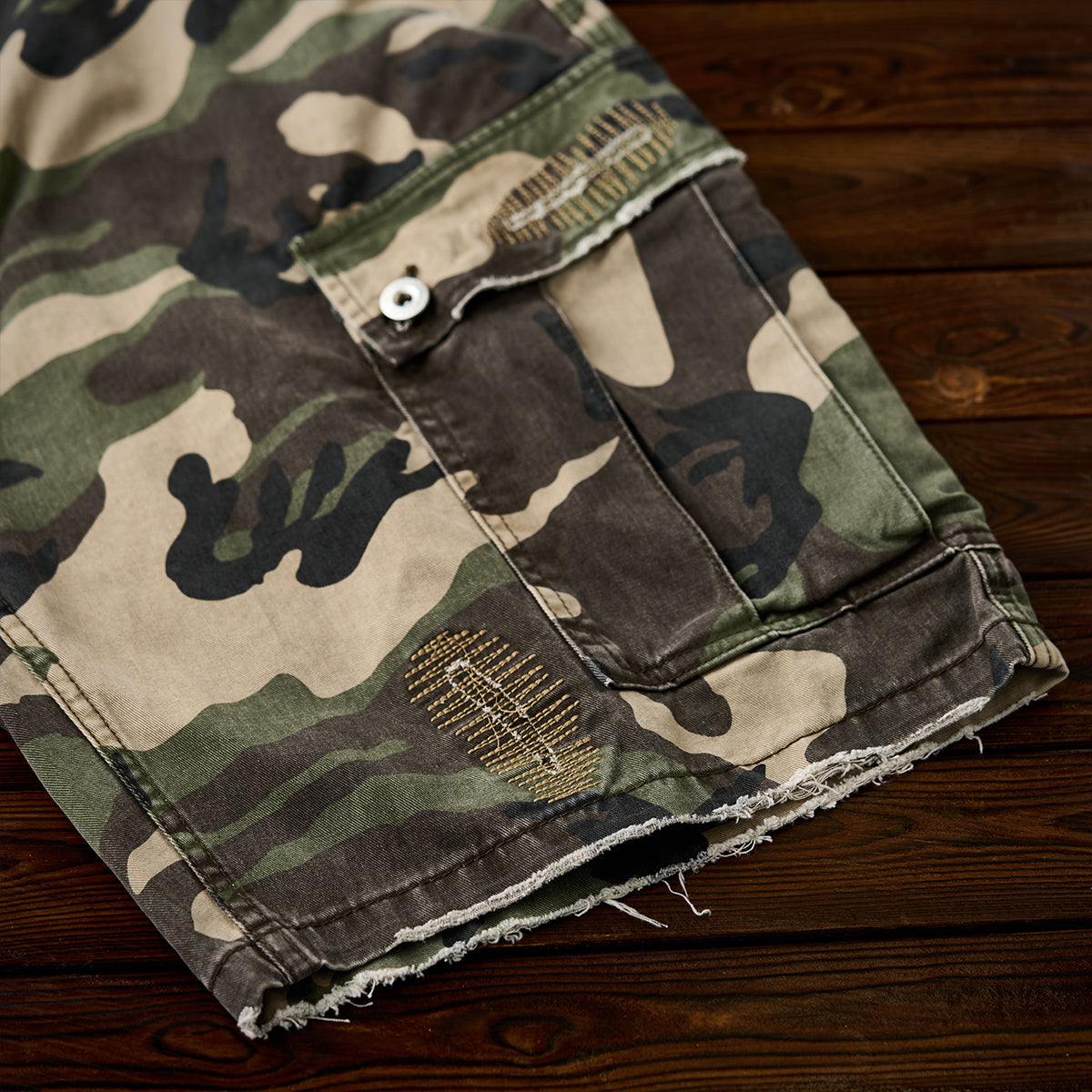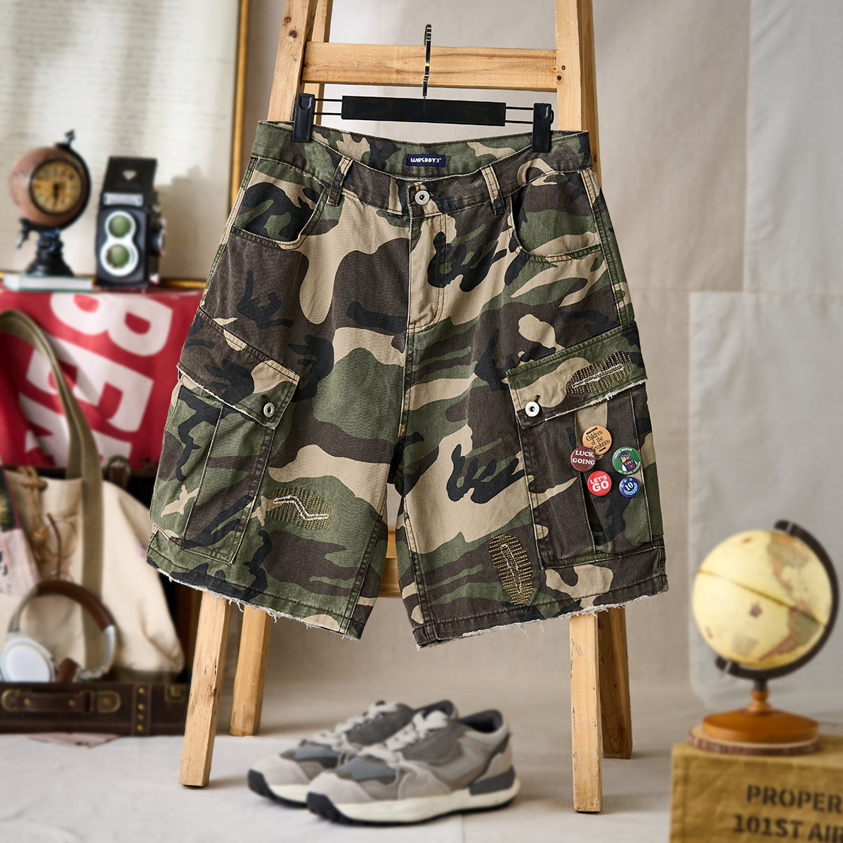 카모플라주 패턴과 레트로 배지가 돋보이는 여름용 숏 팬츠로, 부드럽고 통기성 좋은 워싱 코튼 소재와 넉넉한 카고 포켓으로 실용성과 편안함을 갖췄습니다.
