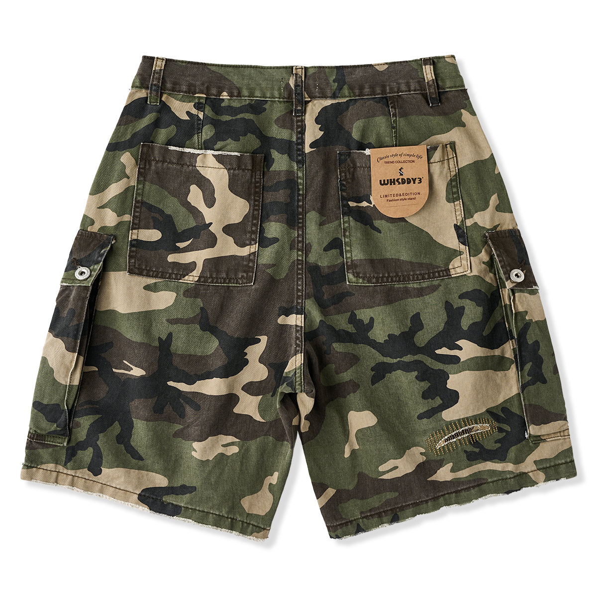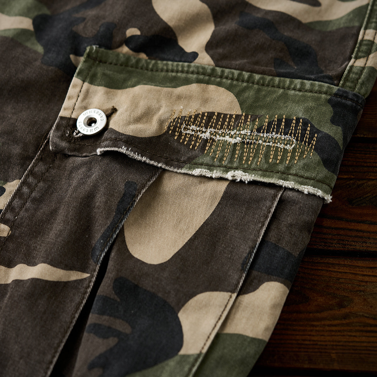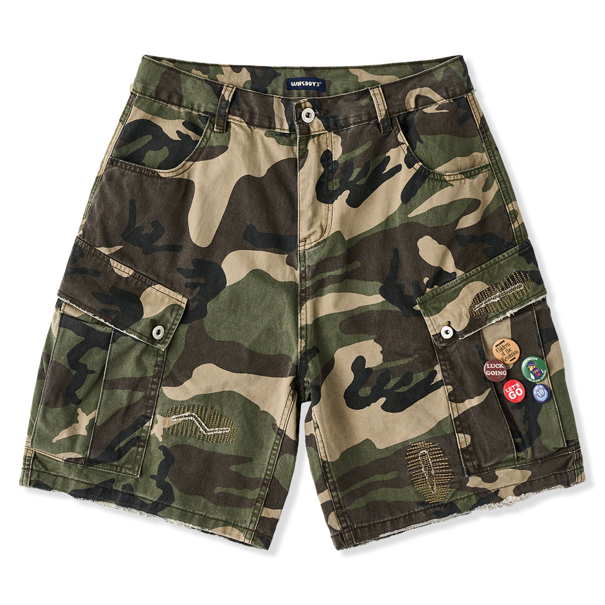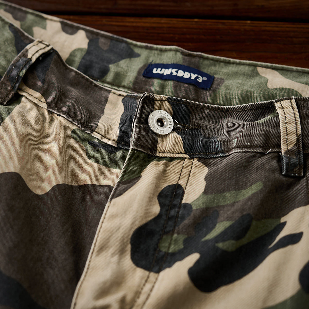 카모플라주 패턴과 레트로 배지가 돋보이는 여름용 숏 팬츠로, 부드럽고 통기성 좋은 워싱 코튼 소재와 넉넉한 카고 포켓으로 실용성과 편안함을 갖췄습니다.