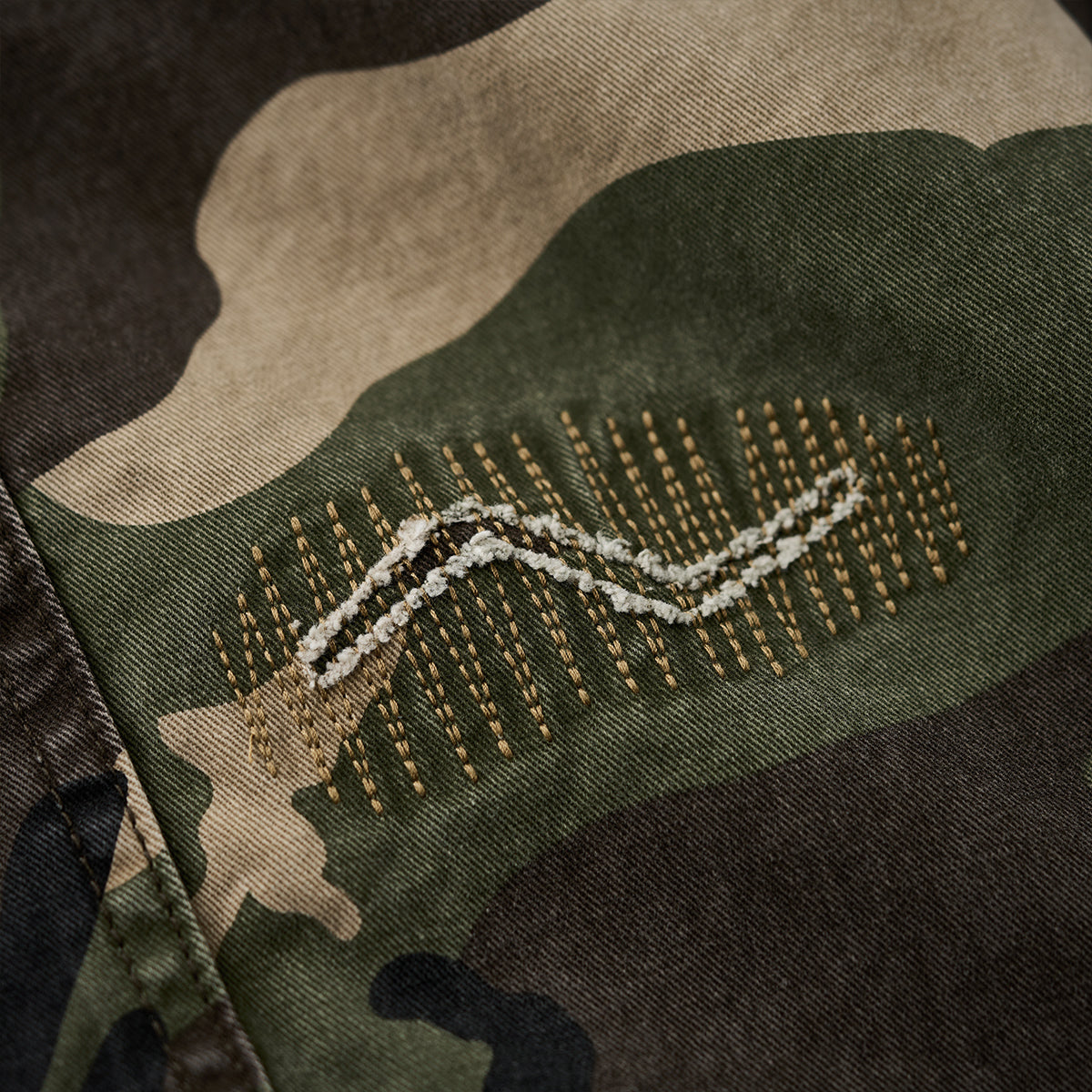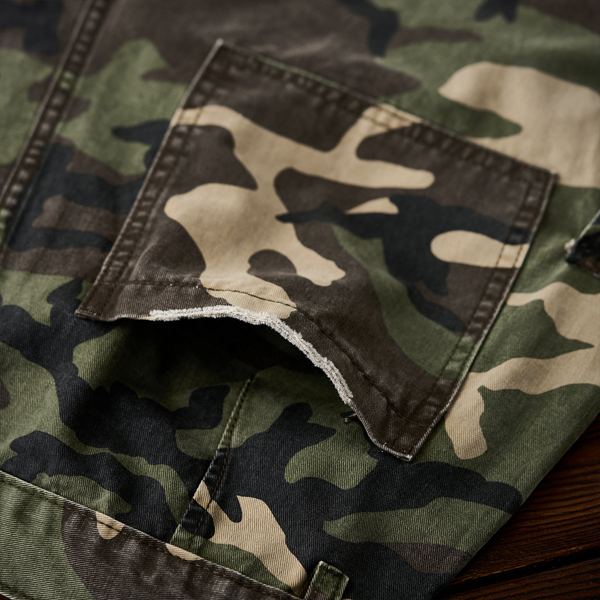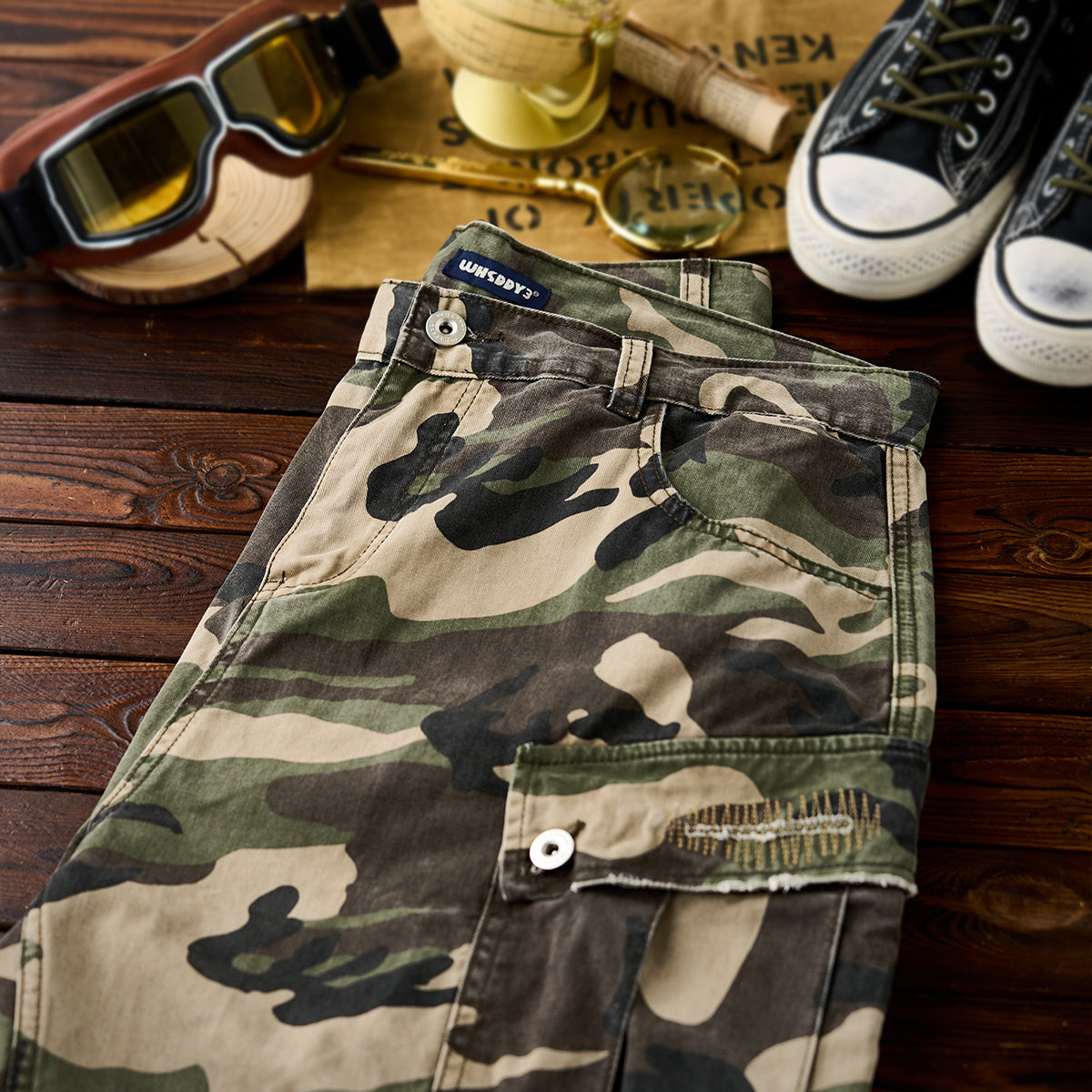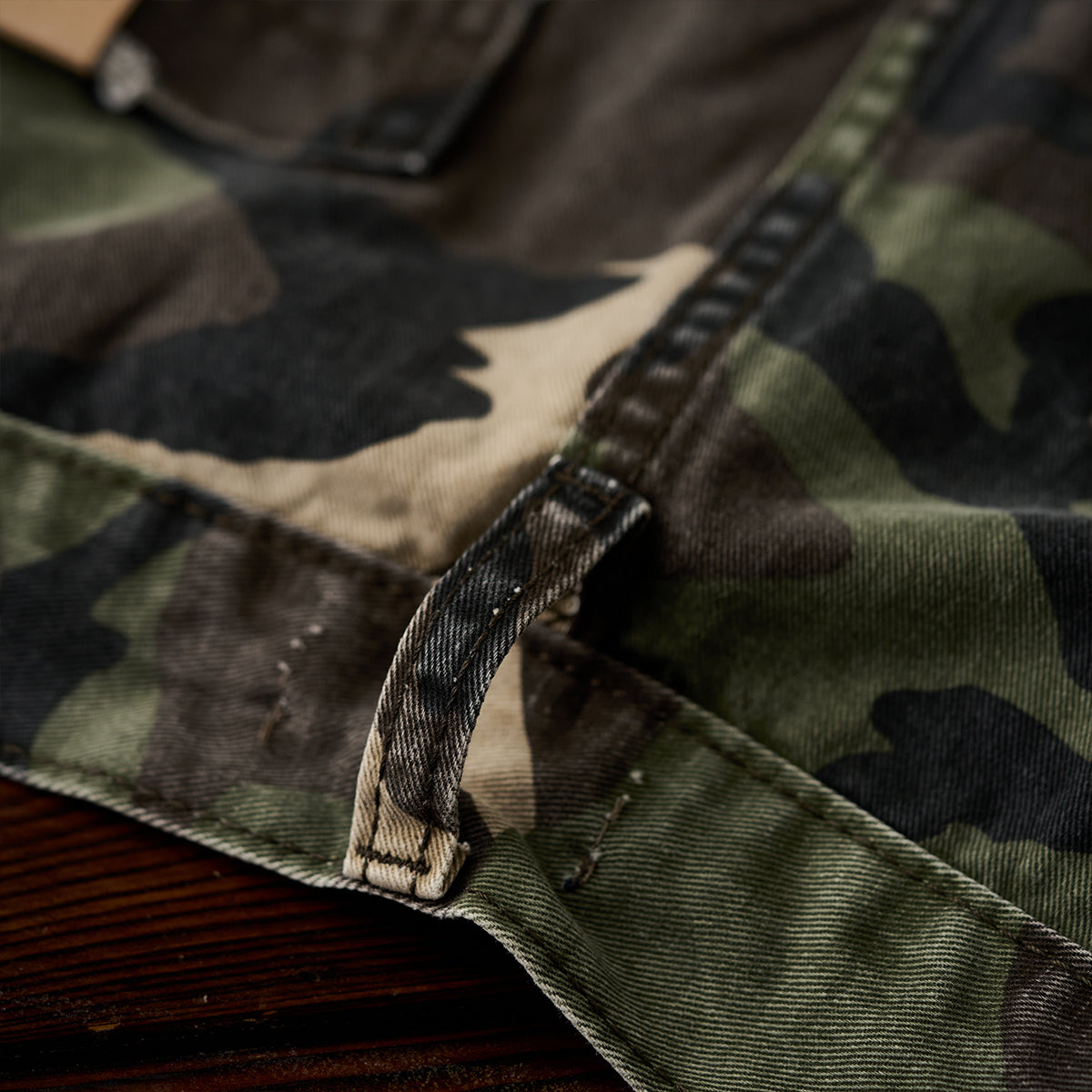 카모플라주 패턴과 레트로 배지가 돋보이는 여름용 숏 팬츠로, 부드럽고 통기성 좋은 워싱 코튼 소재와 넉넉한 카고 포켓으로 실용성과 편안함을 갖췄습니다.