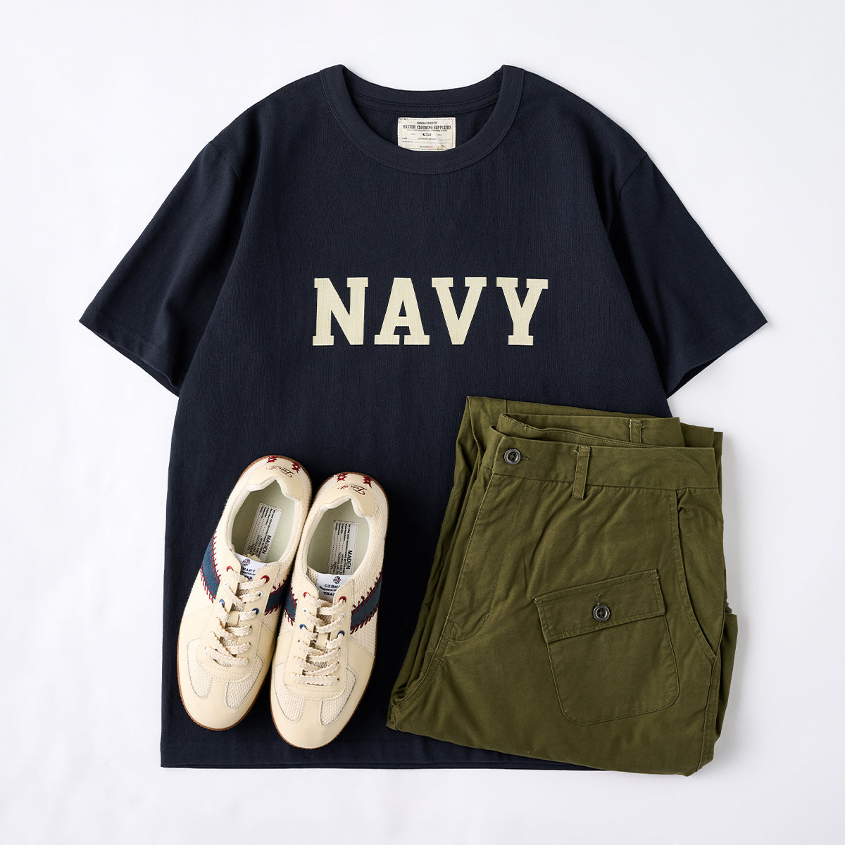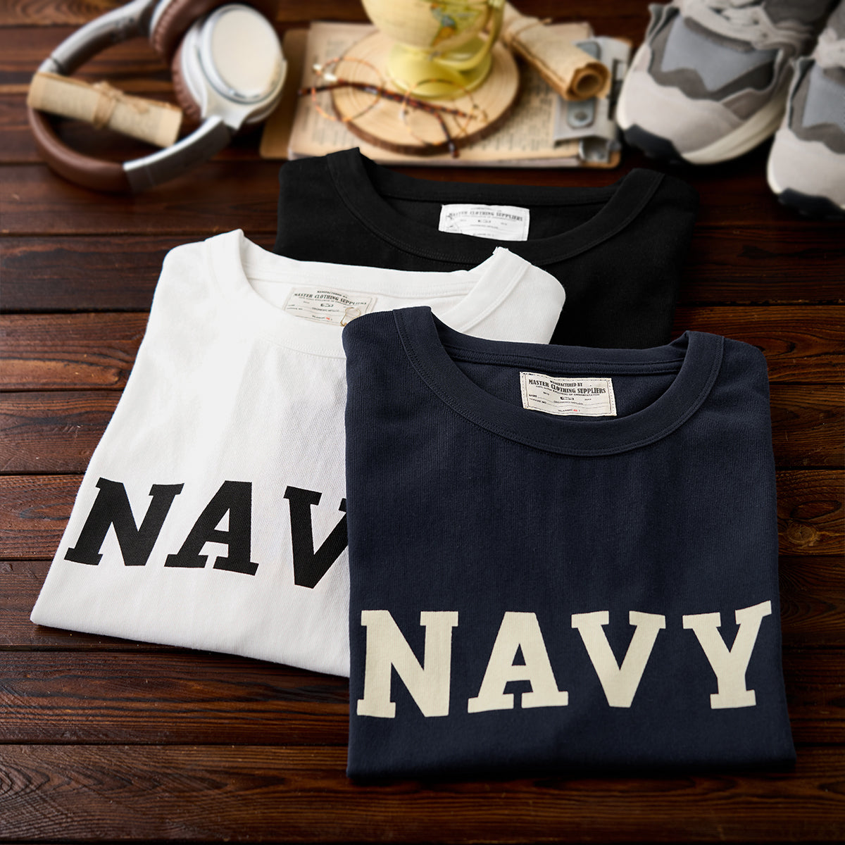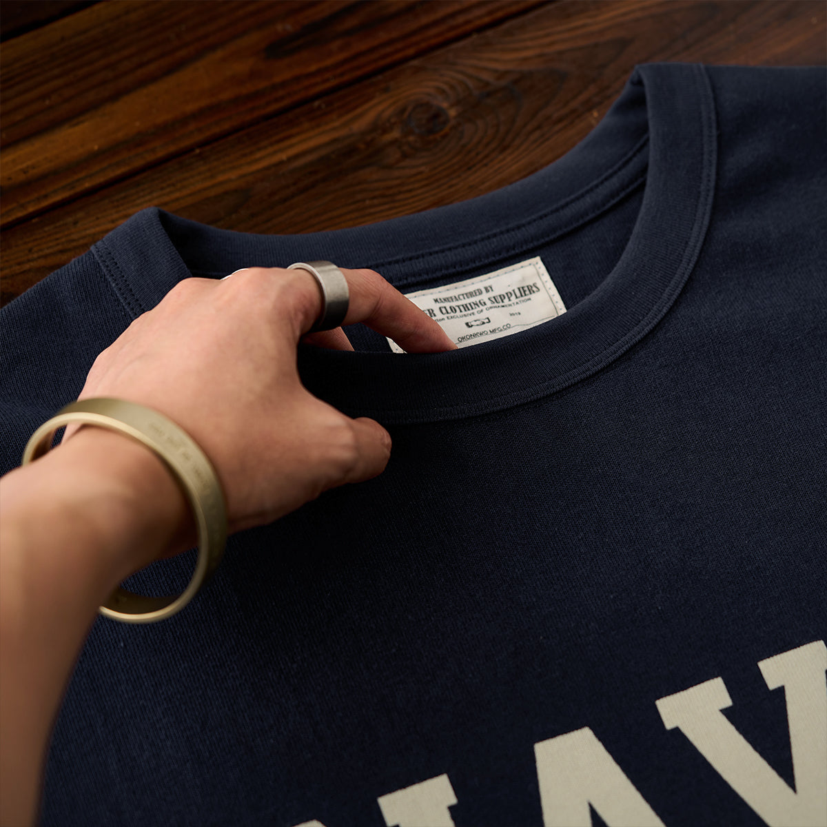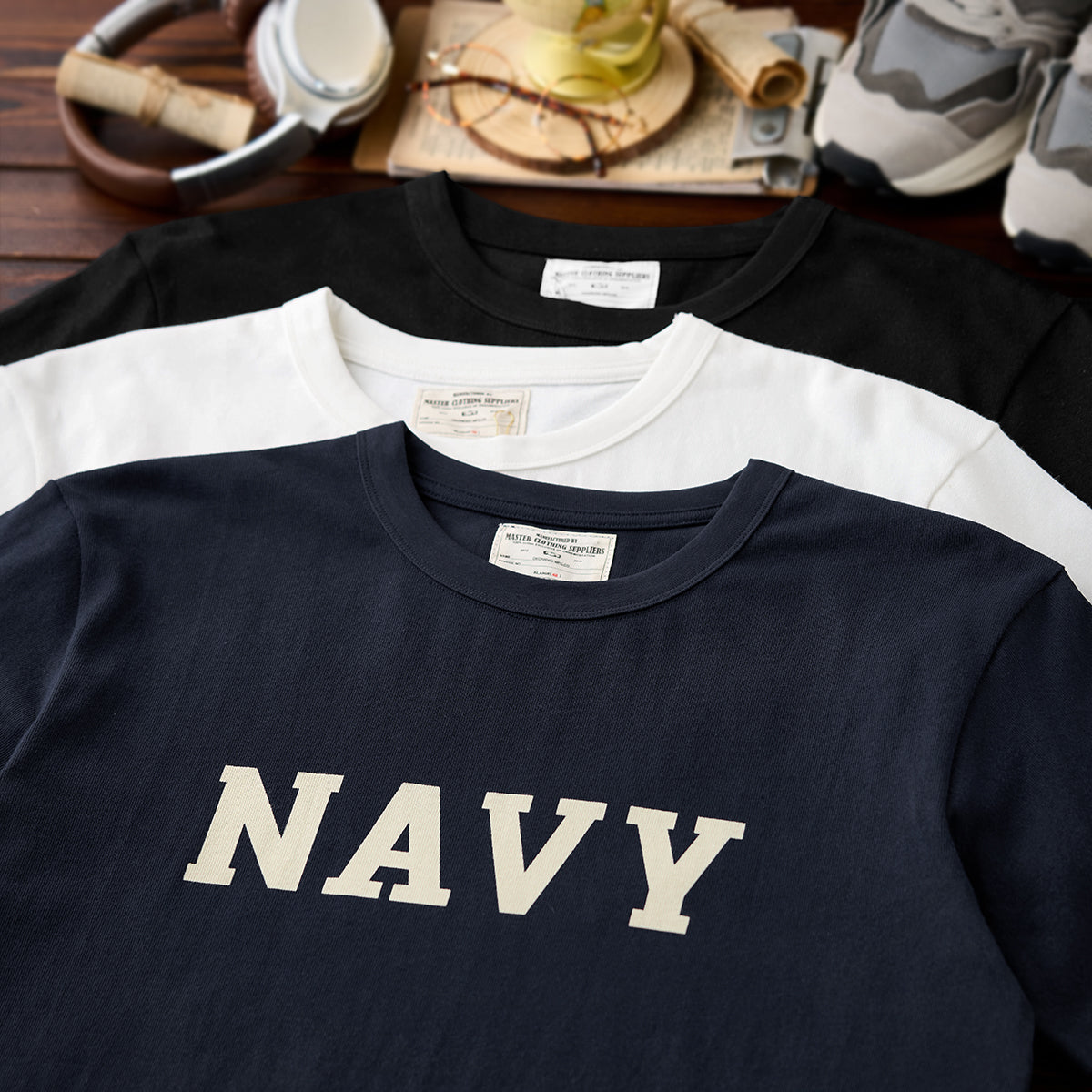 라운드넥과 넓은 봉제선으로 편안함과 내구성을 갖춘 티셔츠로, 가슴 중앙의 ‘NAVY’ 프린트가 심플하면서도 강렬한 포인트를 줍니다.