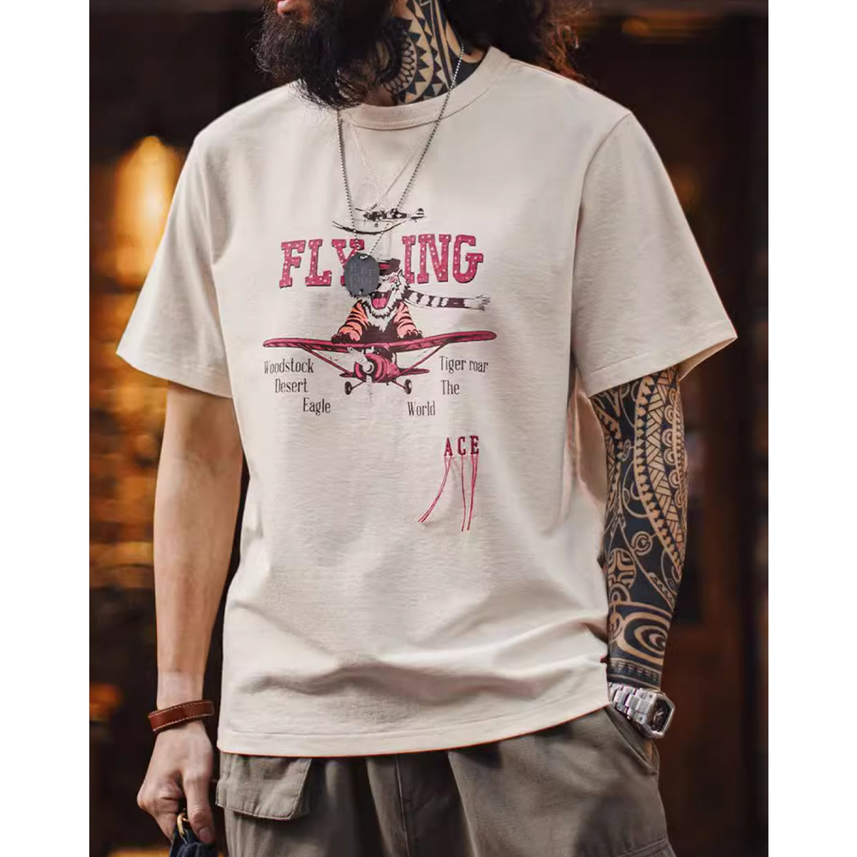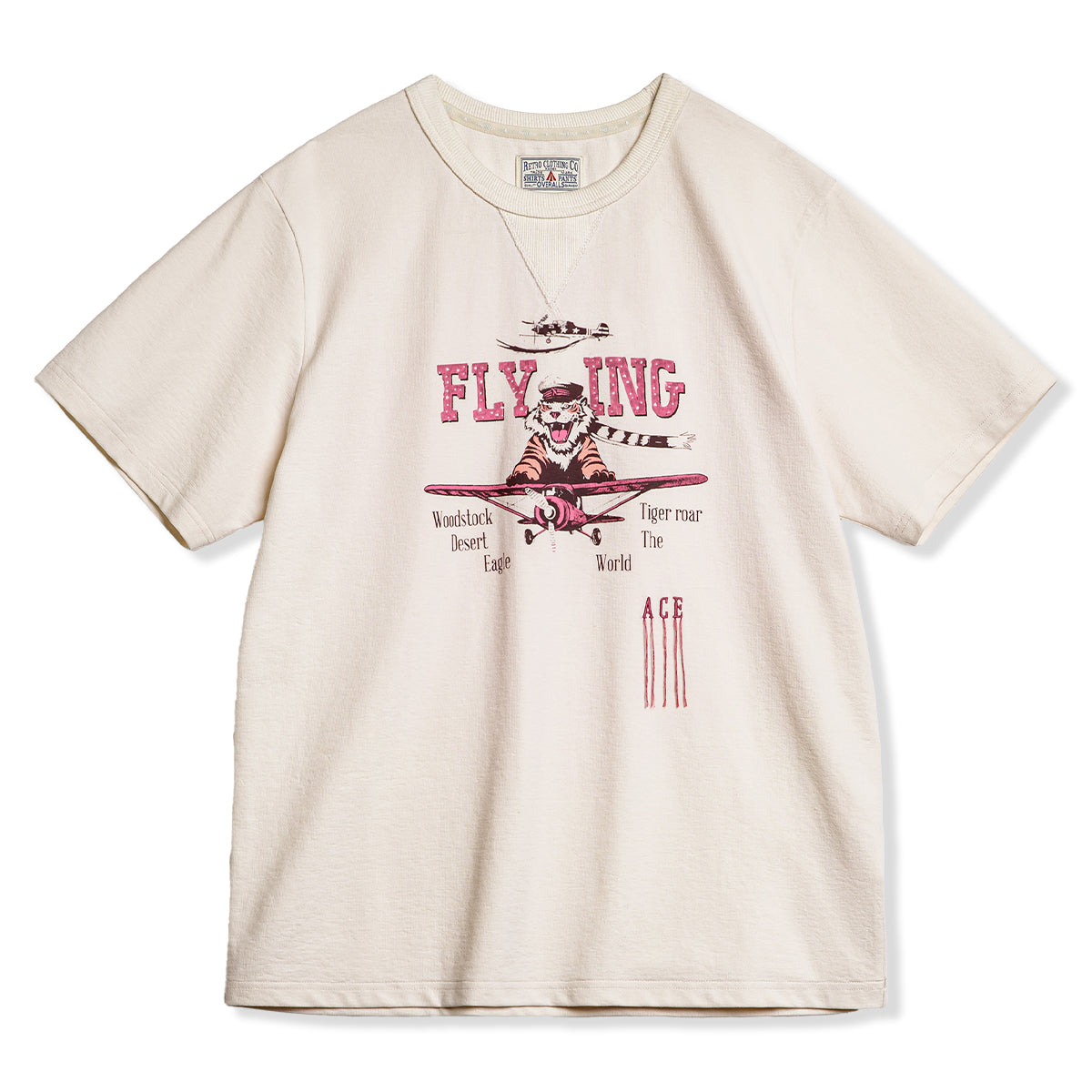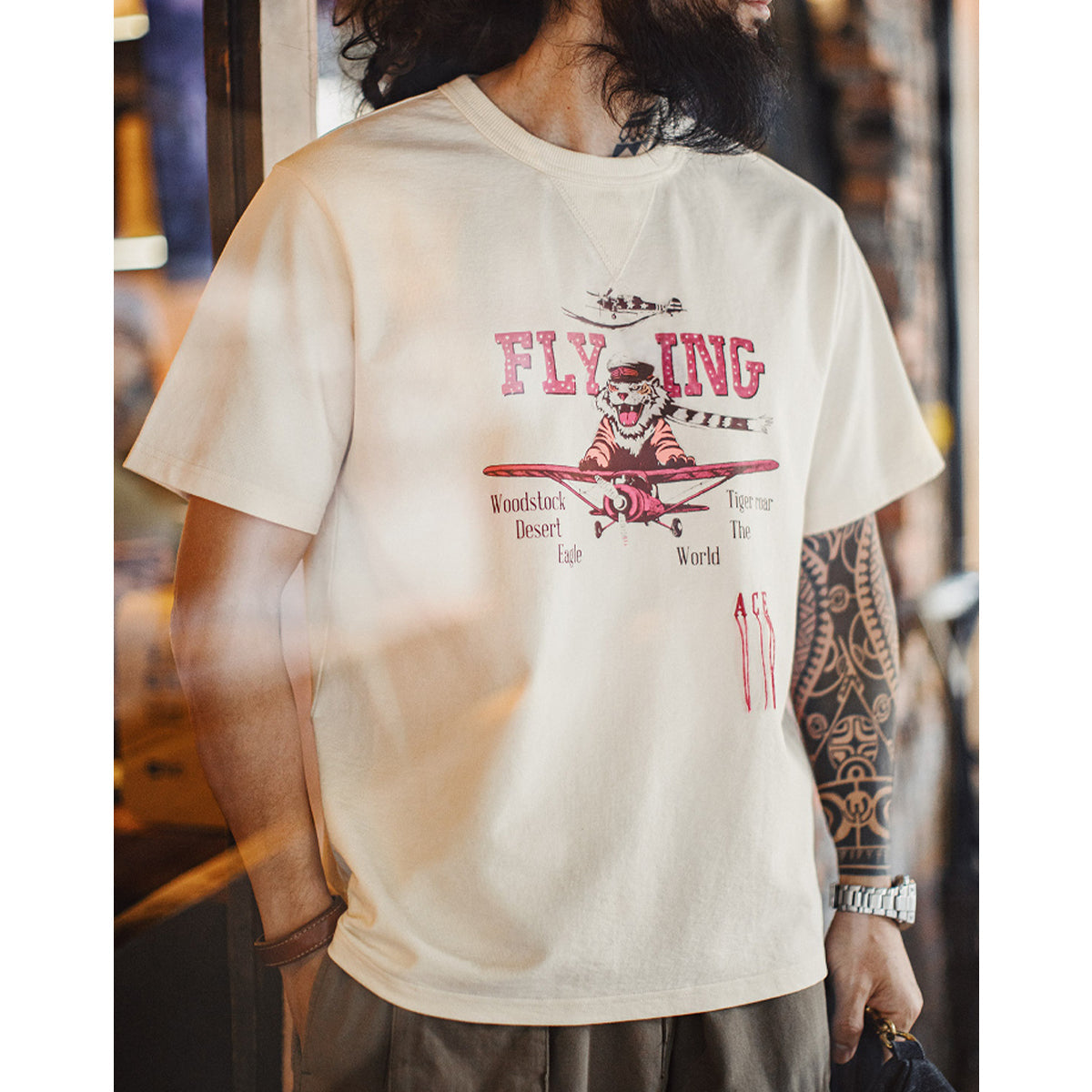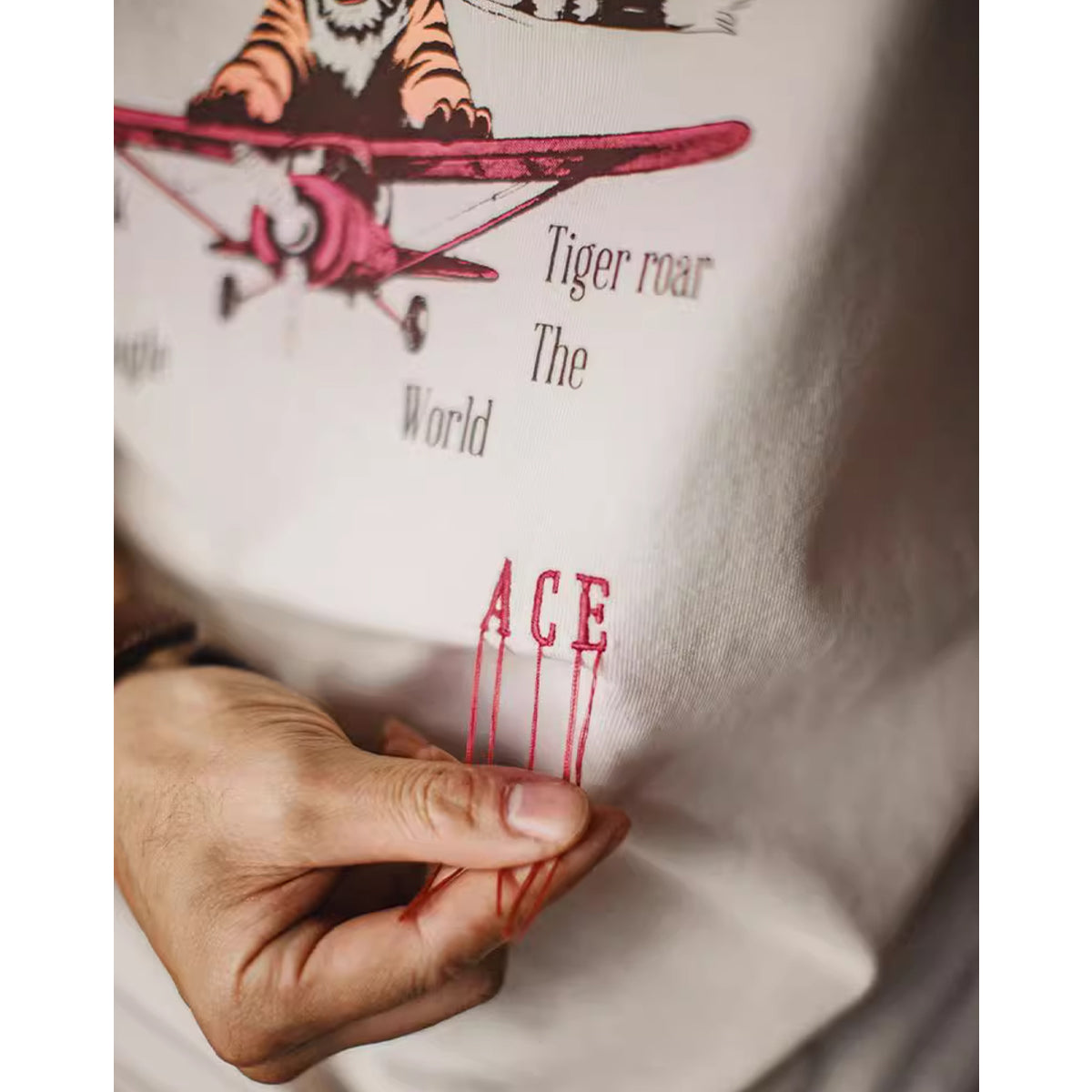 「ACE FLYING TIGER」아메카지 프린트&자수 V넥 반팔 Tee