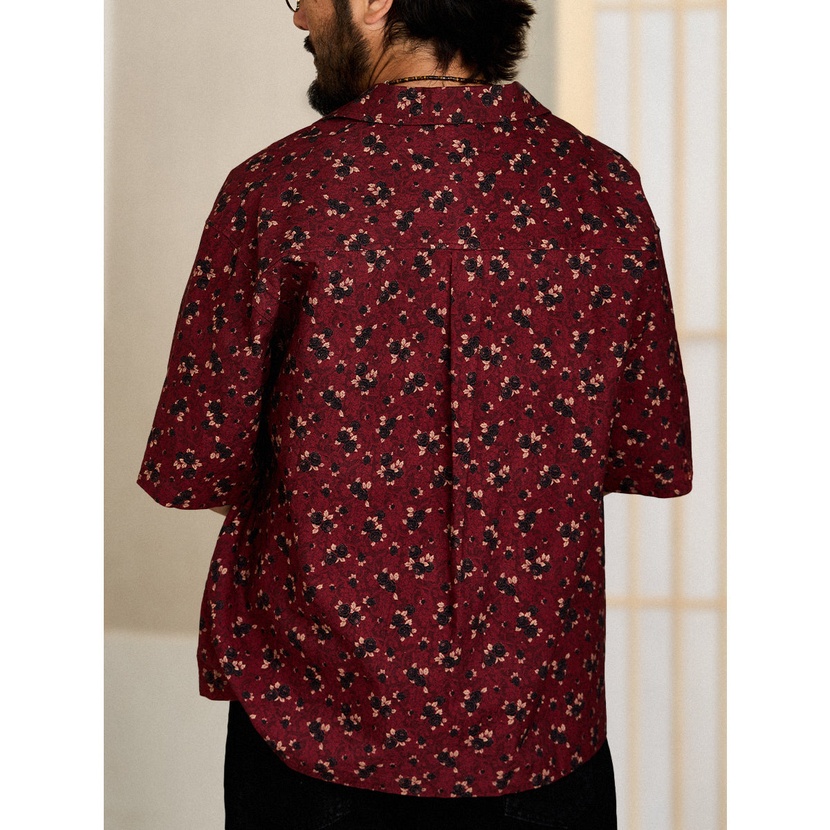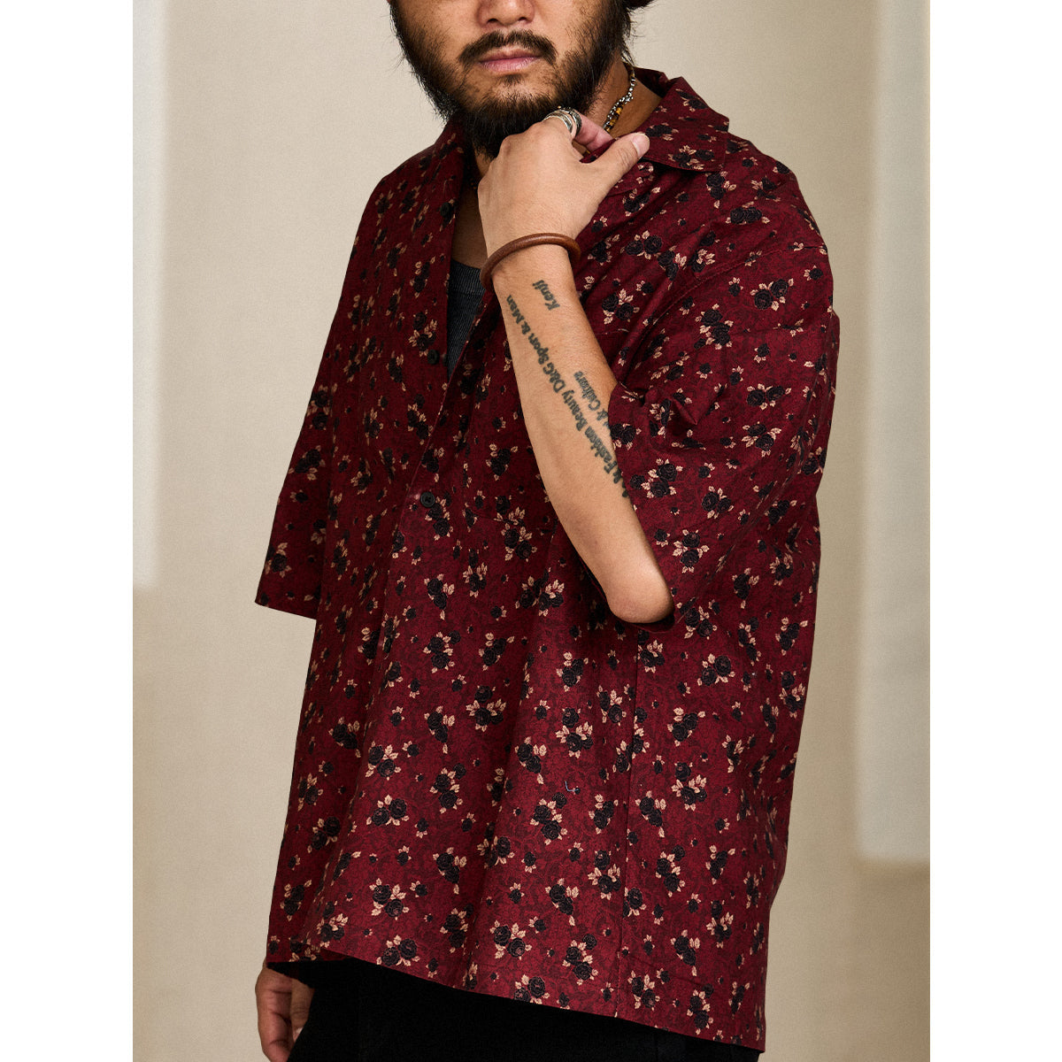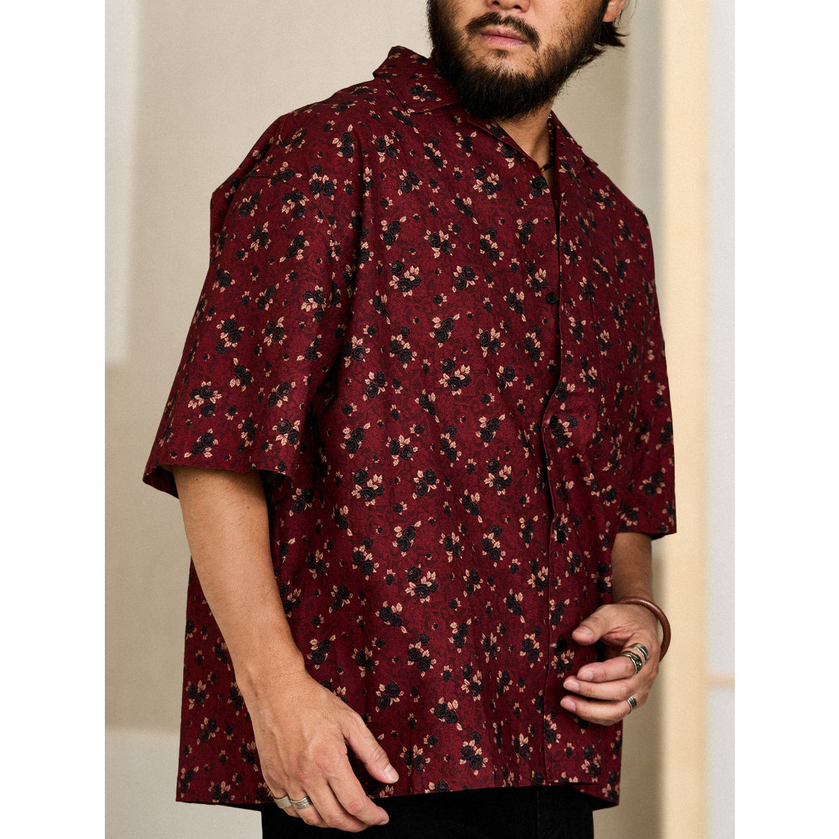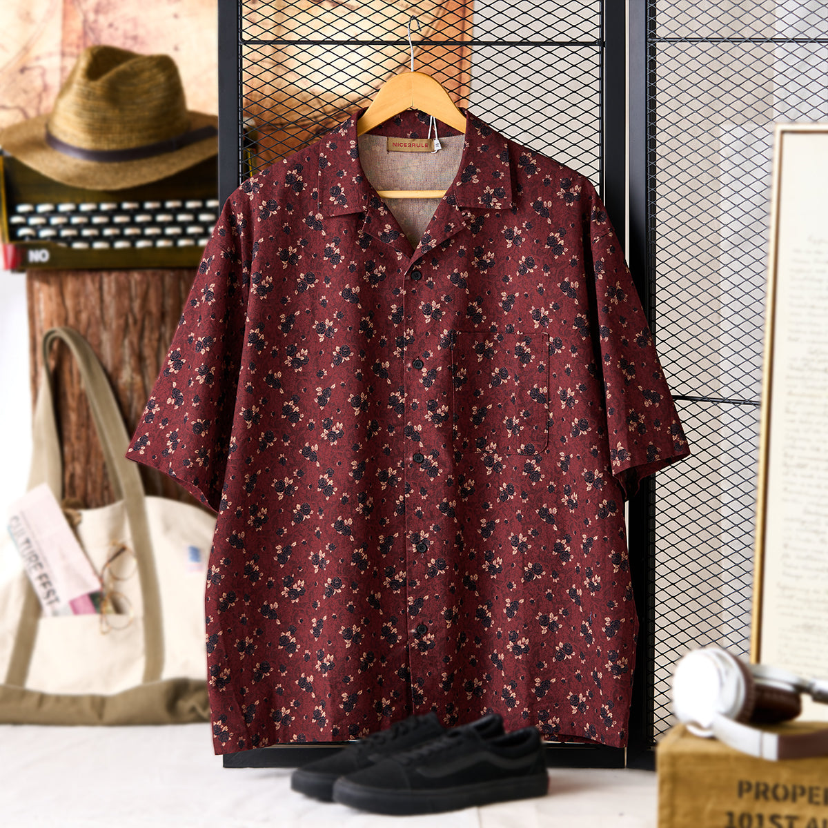 오픈 카라 디자인과 전체 패턴이 조화를 이루어 여름철 멋스러운 코디에 적합합니다.