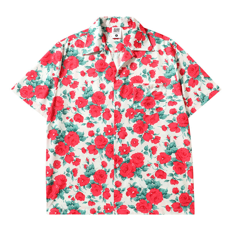 여름다운 상큼한 인상적인 알로하 셔츠입니다. 가장 눈에 띄는 것은 붉은 장미와 녹색 잎 등 전체 무늬 디자인입니다. 섬세하고 선명한 프린트 무늬의 디자인이 고급스럽기 때문에 의외로 너무 화려하지 않고 품위 있습니다. 세련된 쿠바 옷깃으로 코디의 입체감을 더합니다. 소매 부분은 여유 있기 때문에 움직이기 더욱 편안합니다. 휴가나 스트릿 TPO에도 착용하기 좋습니다. 앞으로 더워질 날씨에도 최적입니다.