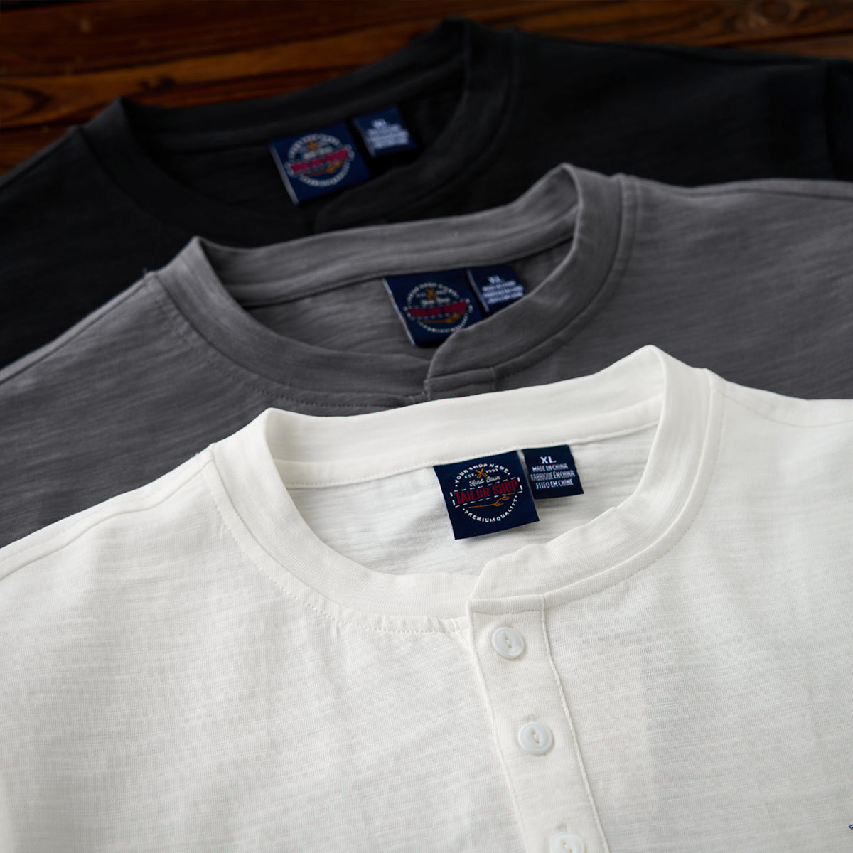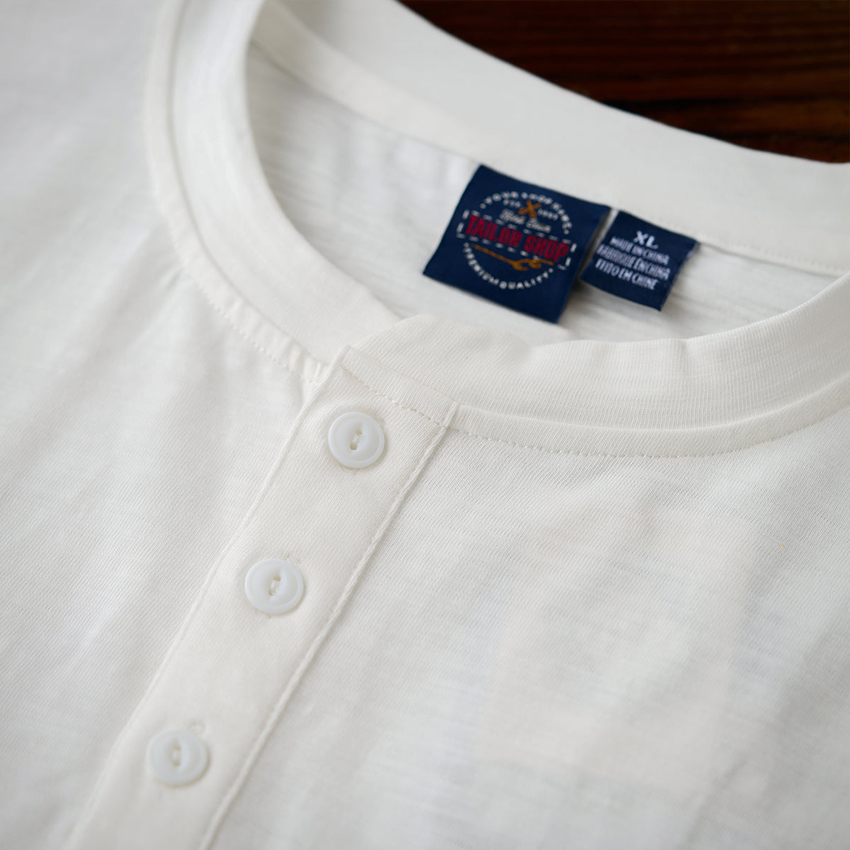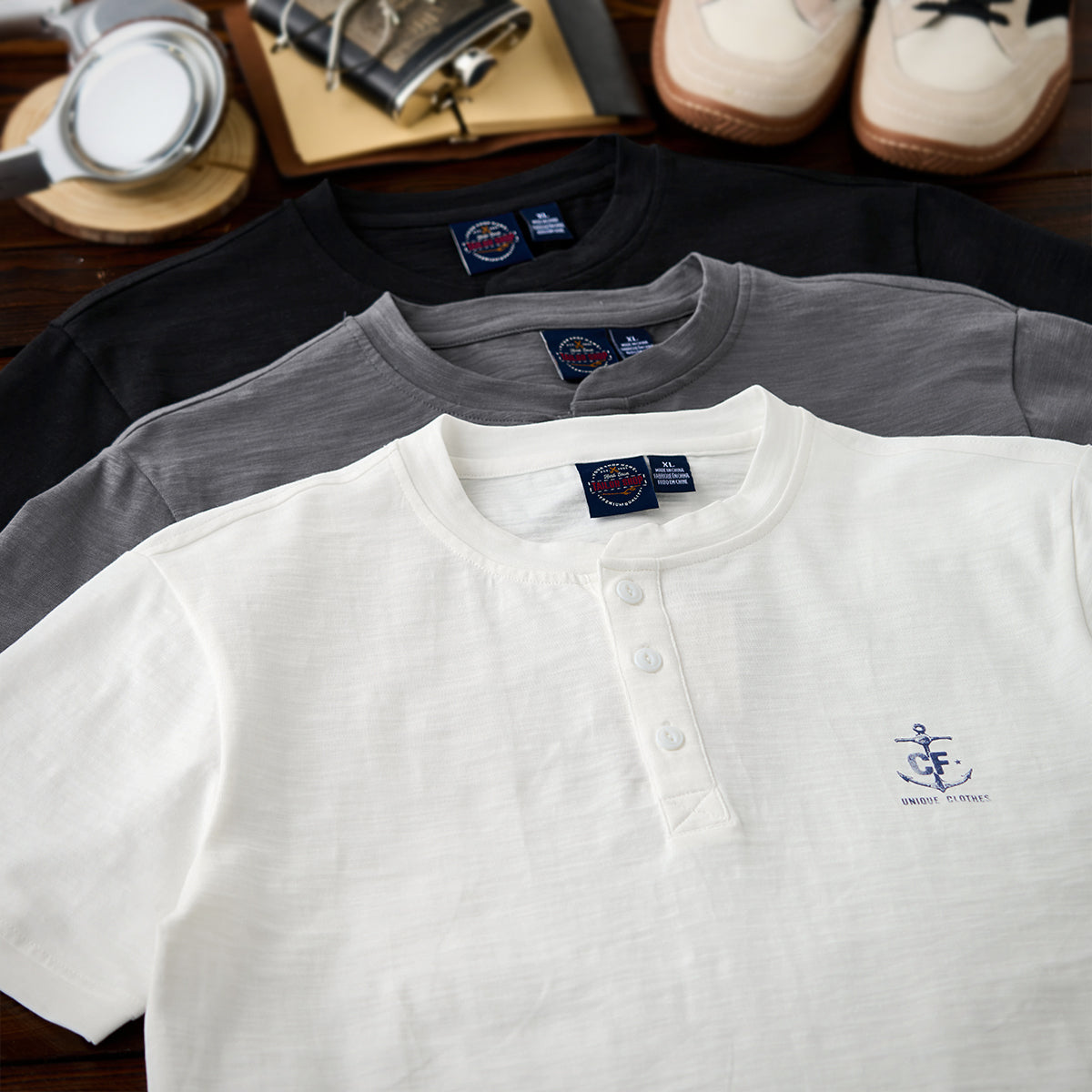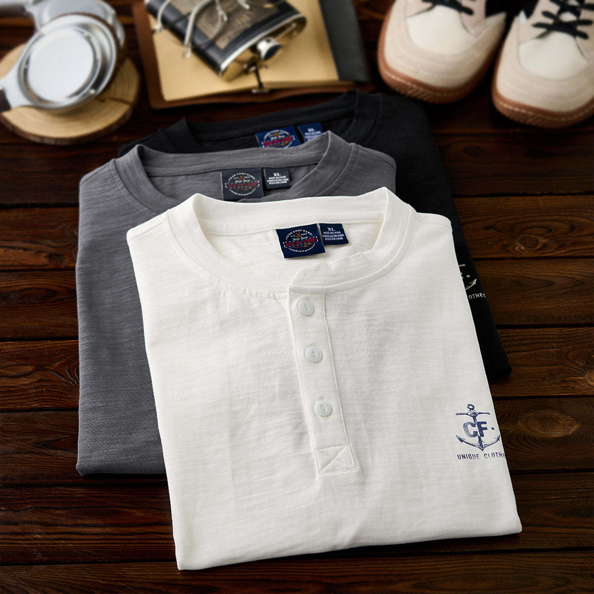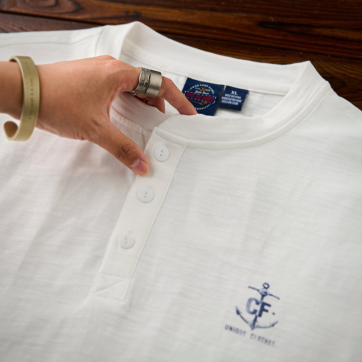 세련된 헨리넥 디자인과 닻 프린트가 돋보이는 고급 헨리넥 티셔츠입니다.