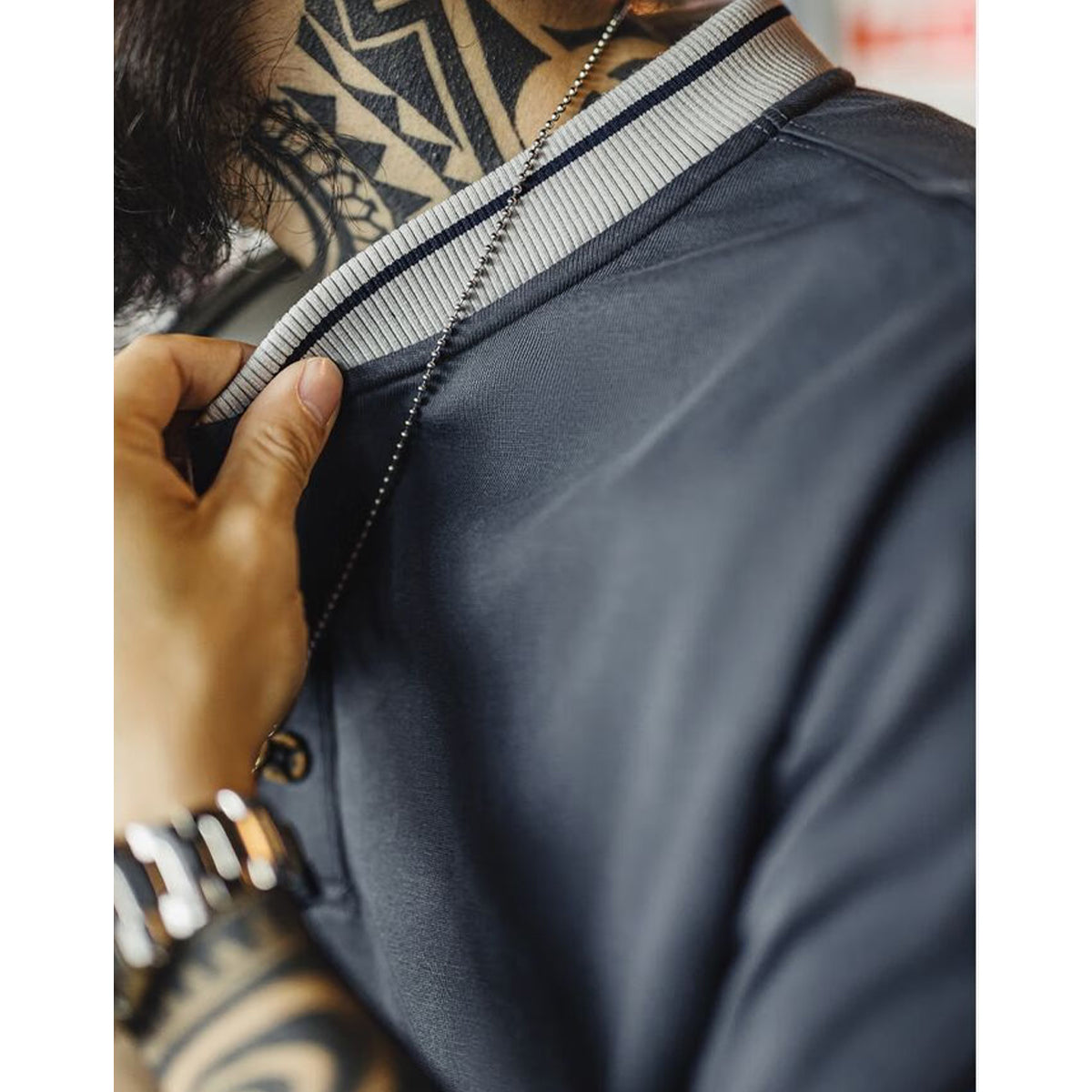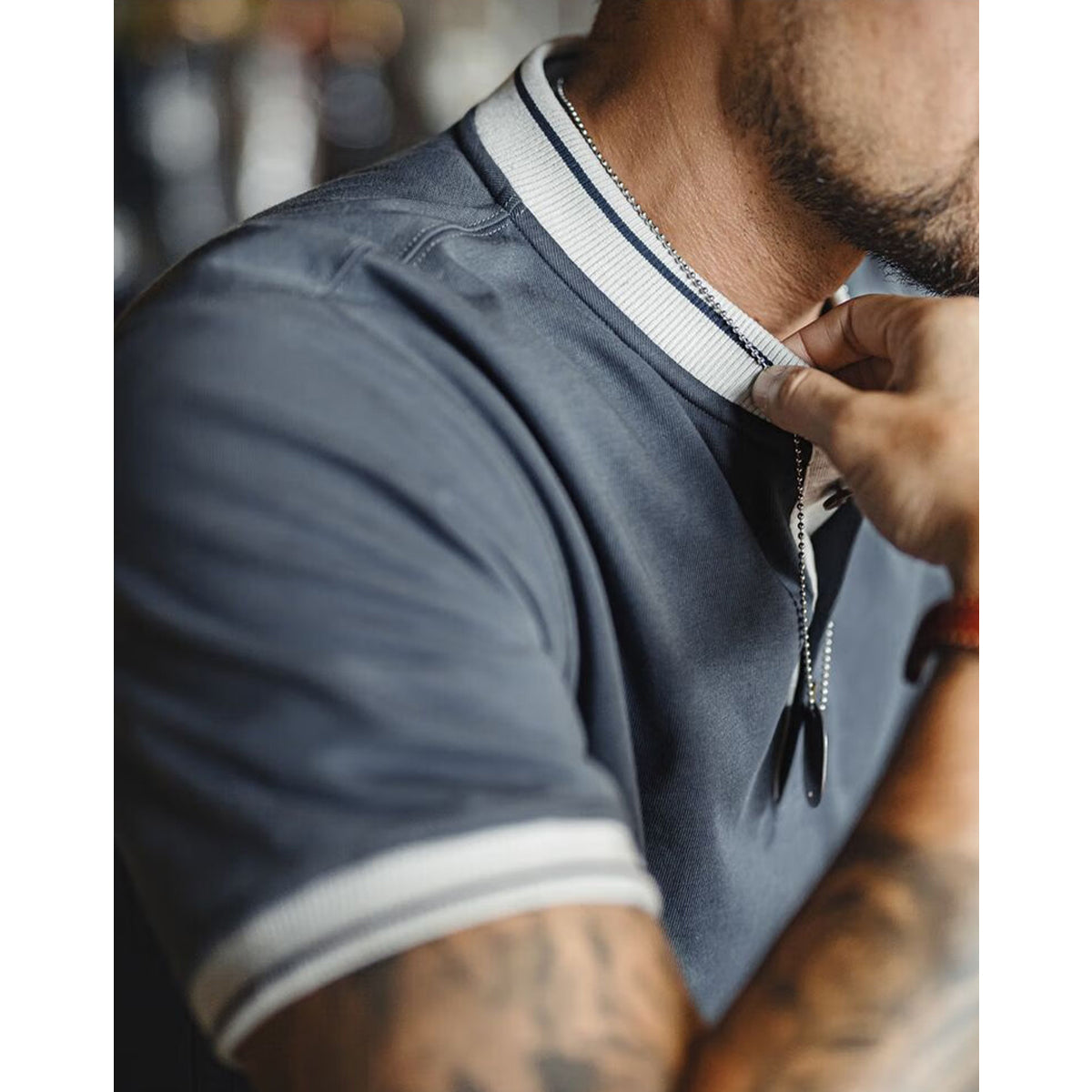 베이스볼 셔츠를 모티브로 한 헨리넥 티셔츠. 배색 시보리와 'BROOKLYN' 자수 배지가 더해져 스포티하면서도 클래식한 무드를 연출합니다.