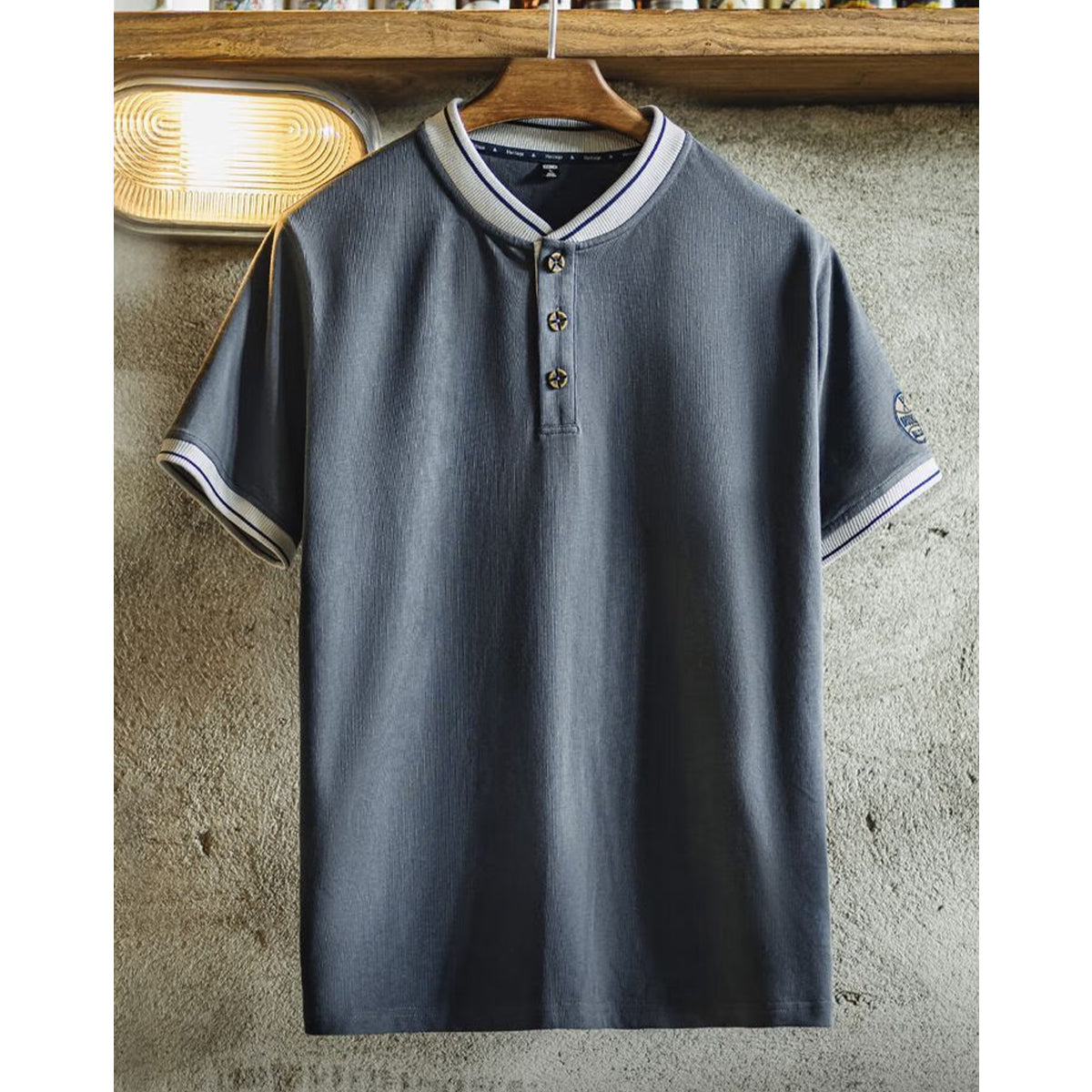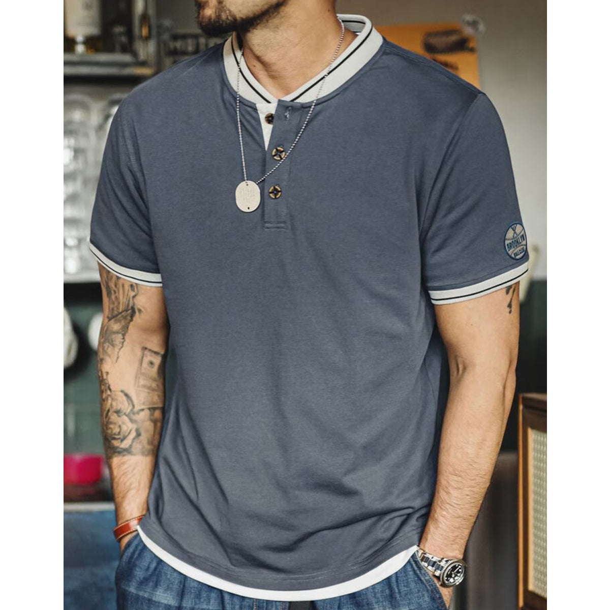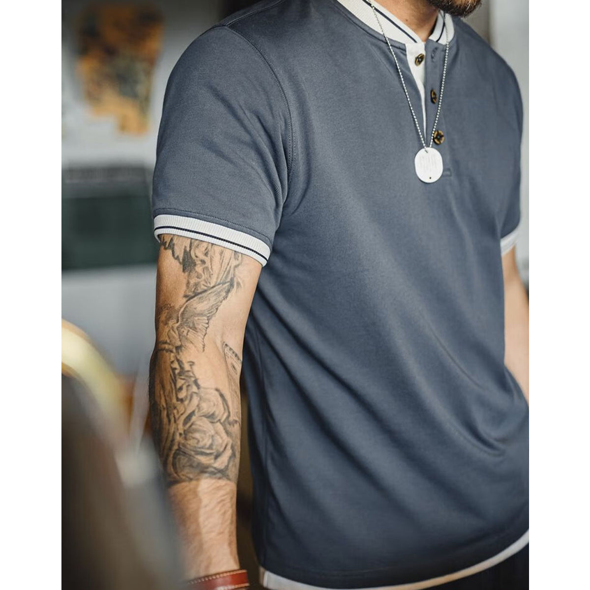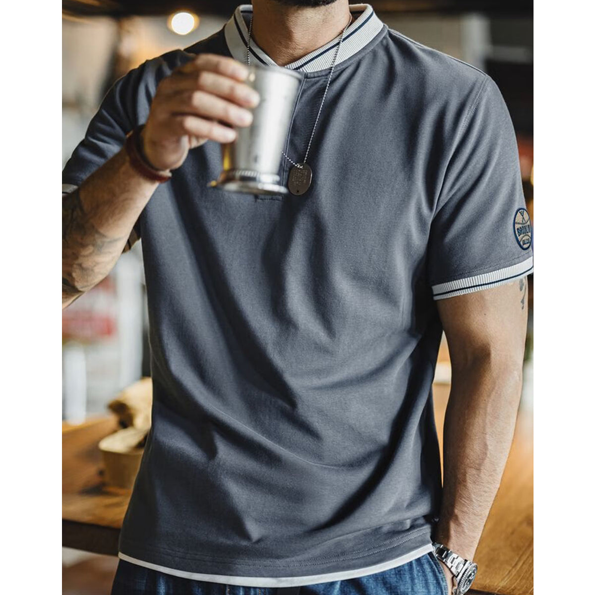 「BROOKLYN」자수 배지 & 시보리 칼라·소매 헨리 베이스볼 티셔츠