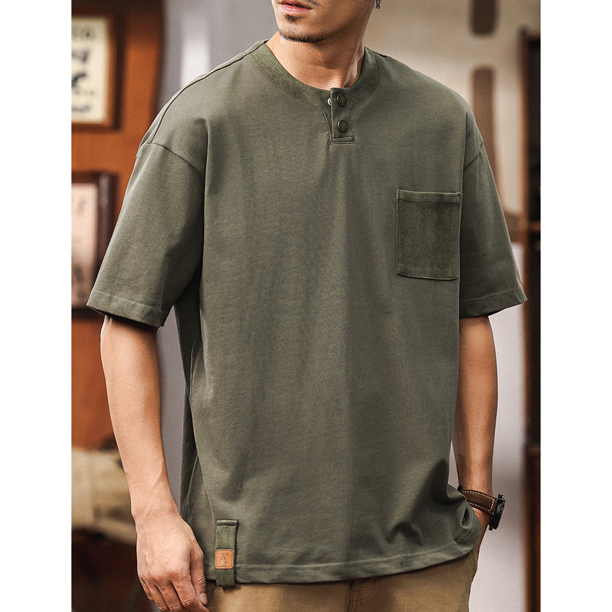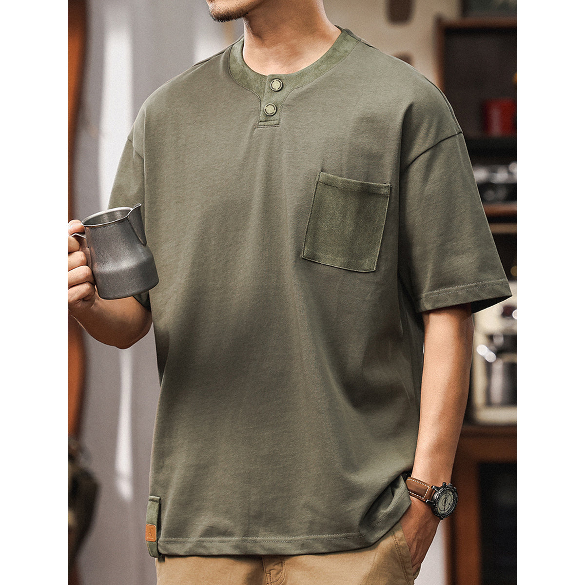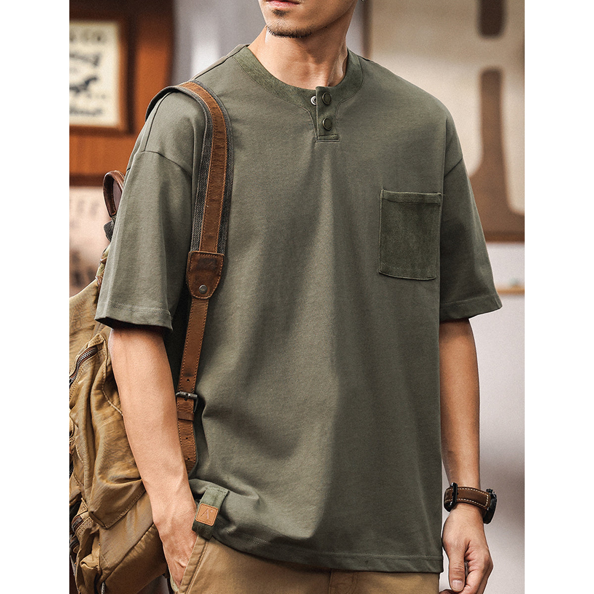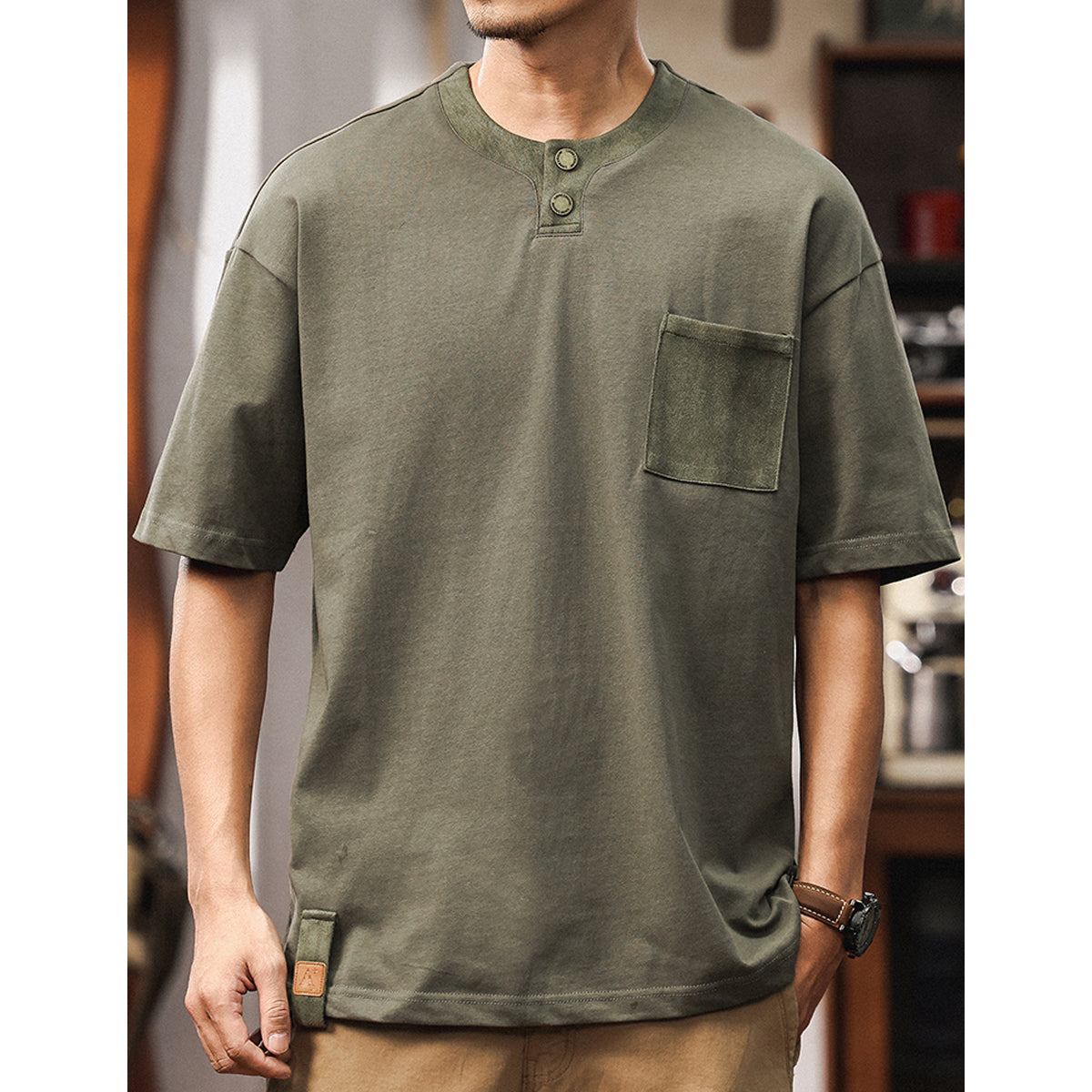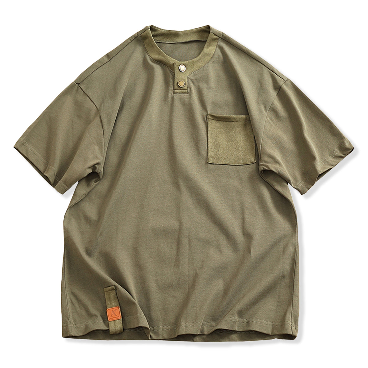 옷깃・포켓 소재콤비 헨리넥 티셔츠