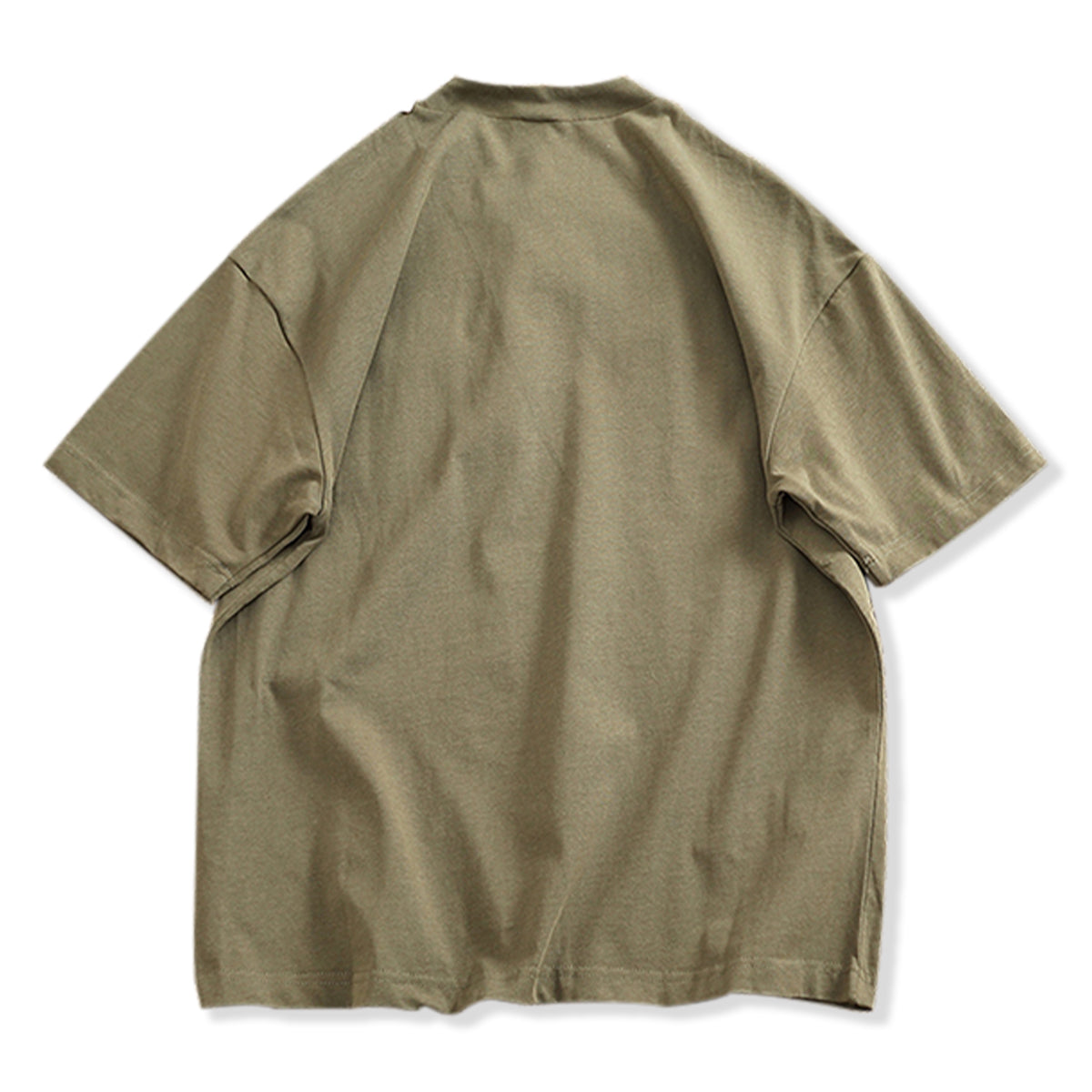 넥 부분은 헨리넥 스타일로 두 개의 버튼이 배치되어, 크루넥보다 디테일이 돋보이며 개성을 더하는 밀리터리 감성의 티셔츠입니다.