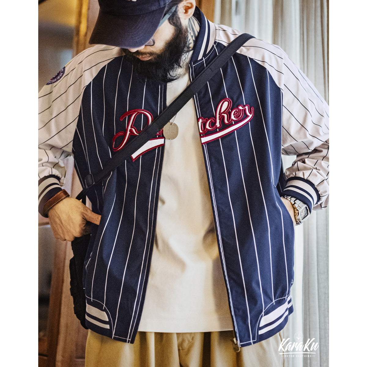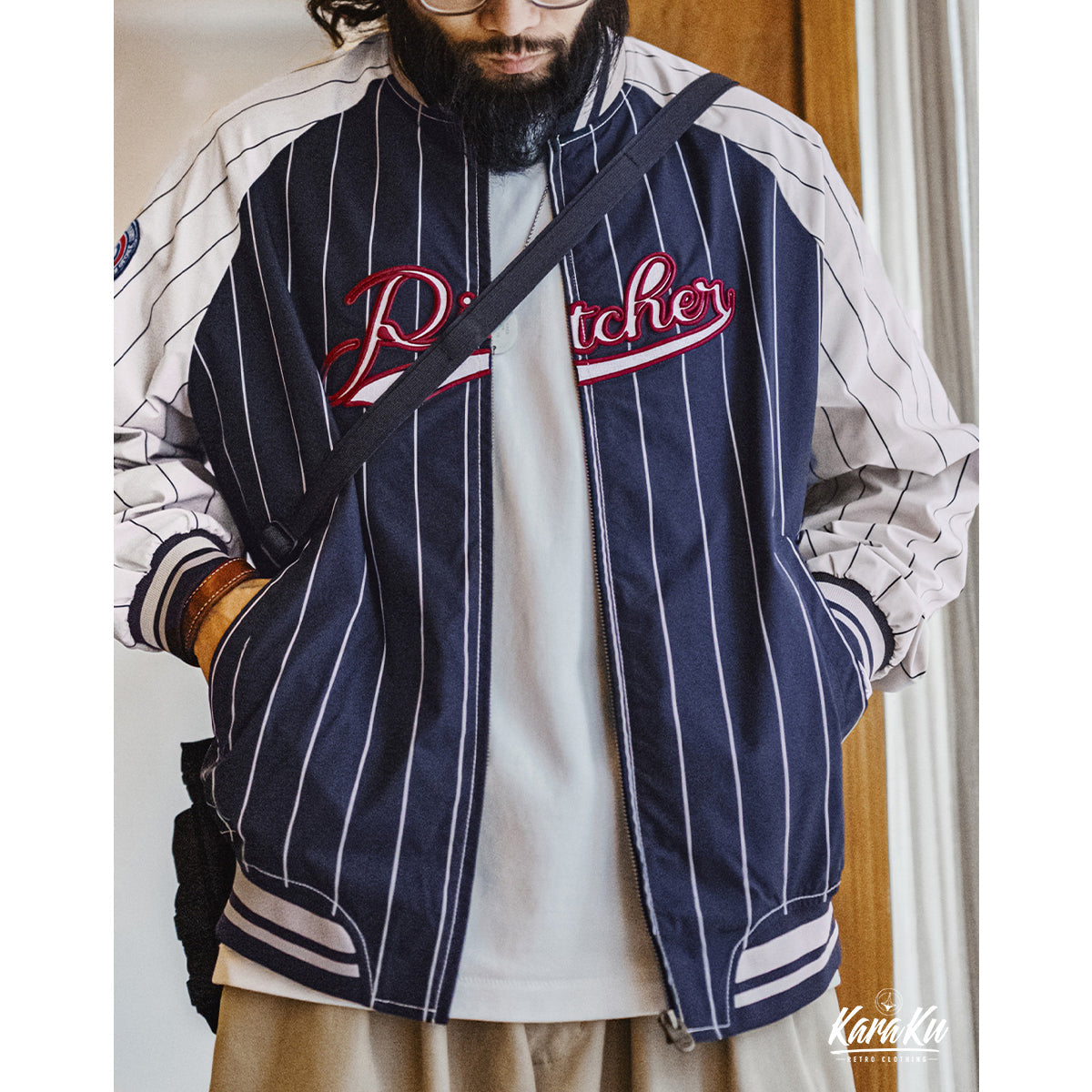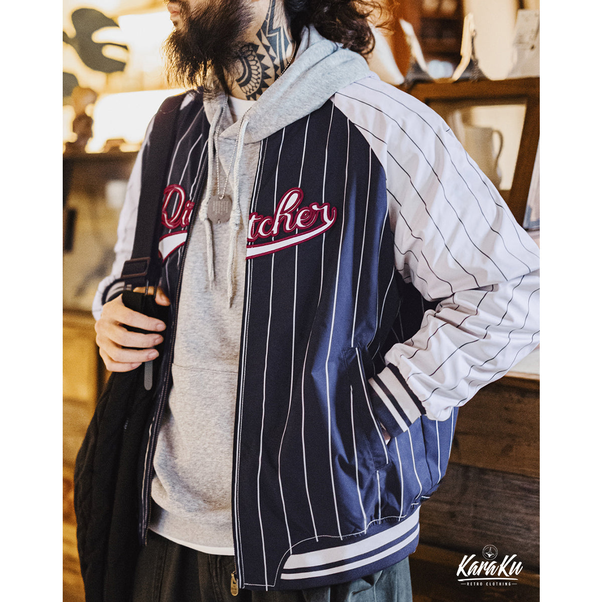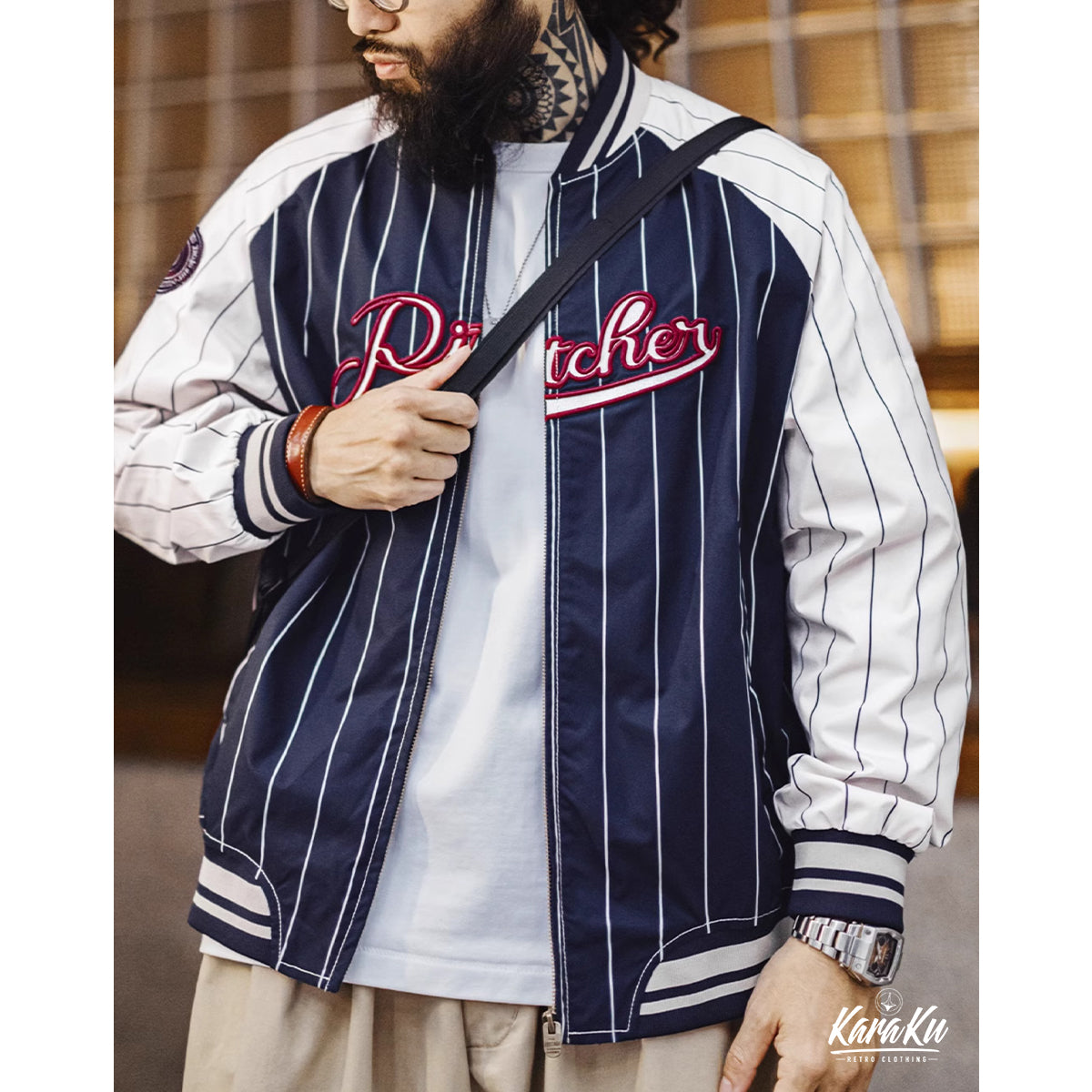 빈티지한 무드에 스포티한 요소를 더한 아우터. 레트로 스트라이프 패턴이 전체적인 포인트가 되며, 컬러 블록 디자인이 한층 더 스타일을 돋보이게 합니다.