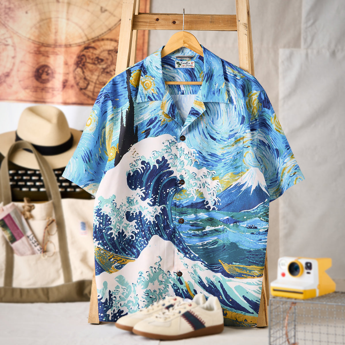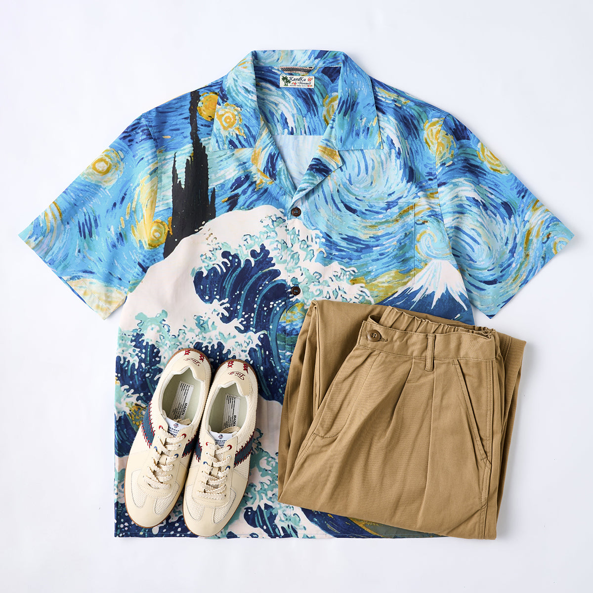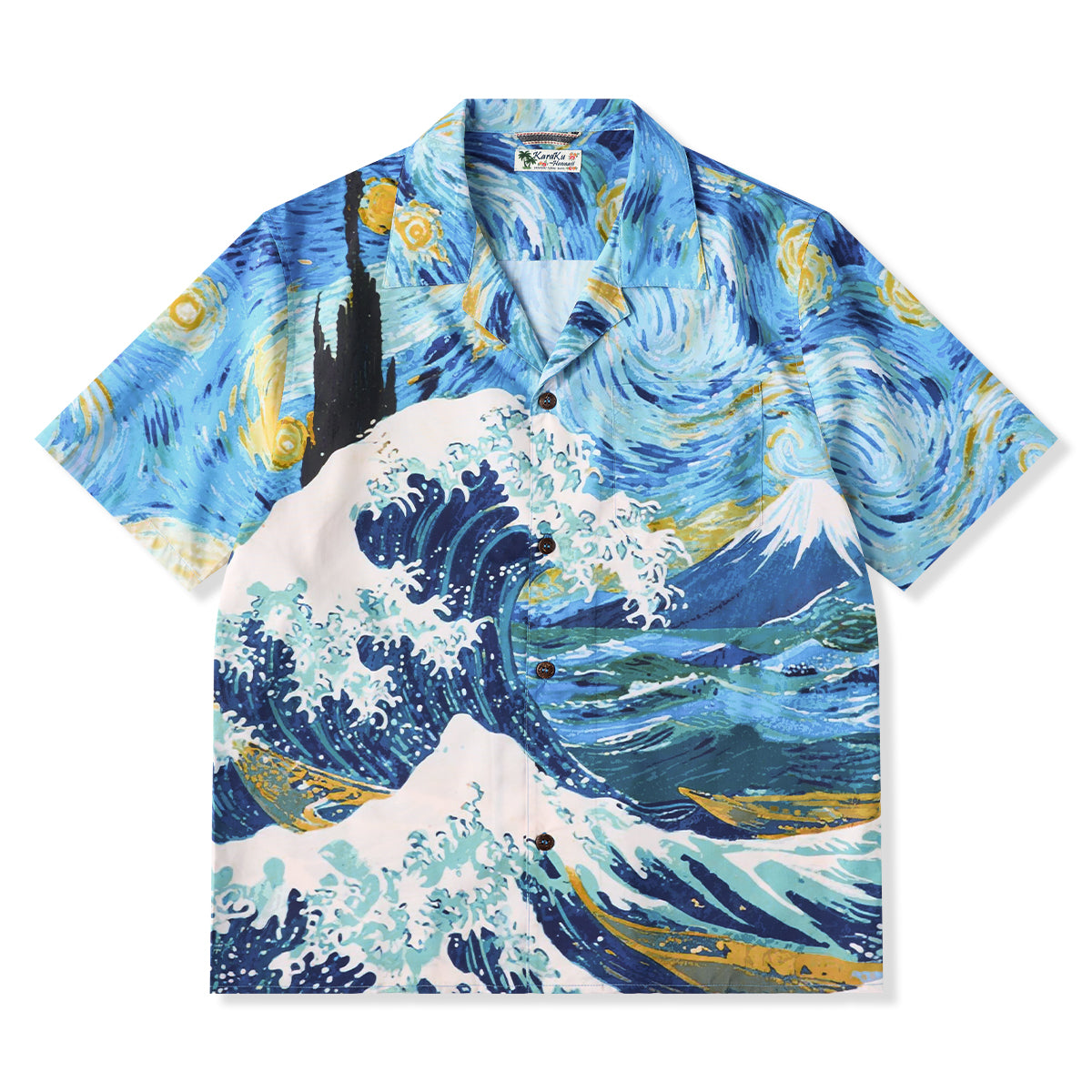 하와이안 셔츠는 셔츠의 한 종류로 알로하 셔츠(Aloha shirt)라고도 불리며 하와이와 같은 바다 배경에 어울리는 화려한 셔츠를 말합니다. 일반적으로 하와이안 셔츠는 꽃문양이나 야자수 등 식물 문양으로 디자인하지만 KaraKu는 하와이안 셔츠를 좀 더 다양한 문양을 선택하여 디자인하였습니다.