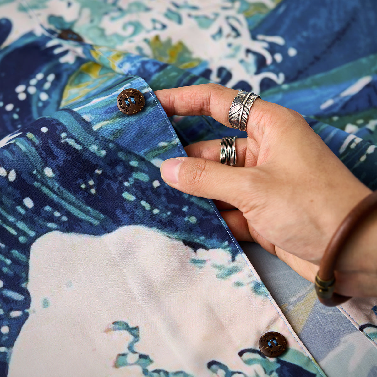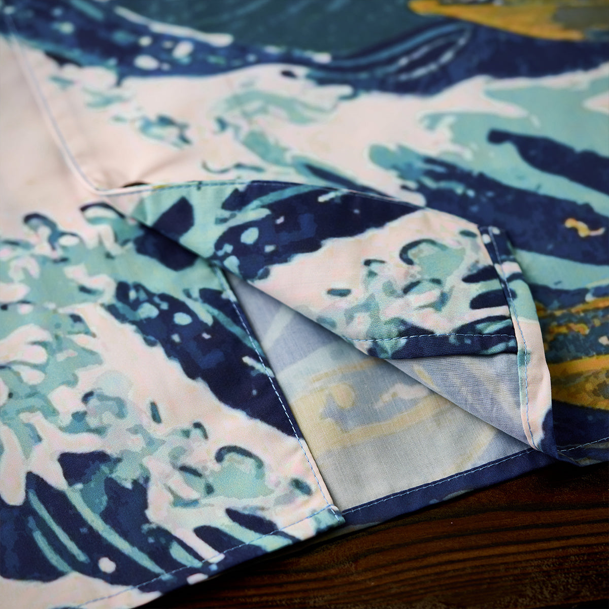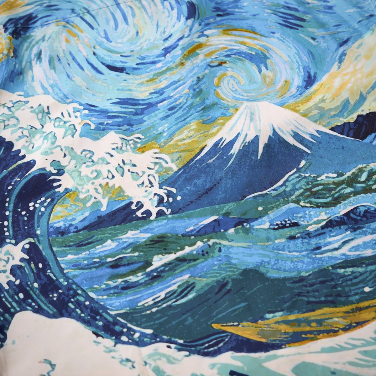 「여름 만화경」무늬 알로하 셔츠와 메이지시대(明治時代)의 고양이 무늬 우키요에(浮世絵)풍 알로하셔츠입니다. 두 아이템 모두 전체적으로 원형과 사각형를 기본 포인트로 사용하고 있습니다. 여름 만화경 셔츠는 다양한 원형 무늬로 통해 만화경의 오색찬란한 문양을 돋보이게 하는 반면에 메이지시대(明治時代)의 고양이 알로하셔츠는 일본풍이 가득한 메이지시대의 고양이로 셔츠의 전, 후면을 채웠습니다.