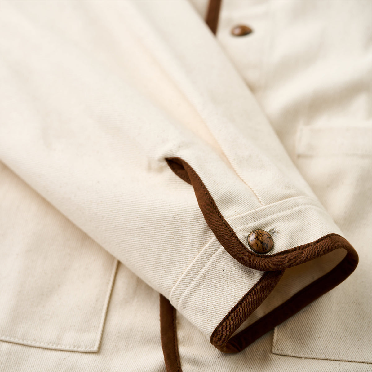 적당한 두께감과 탄탄한 내구성으로, 통기성이 좋고 오래 입어도 형태가 유지되는 코튼 트윌 소재입니다.