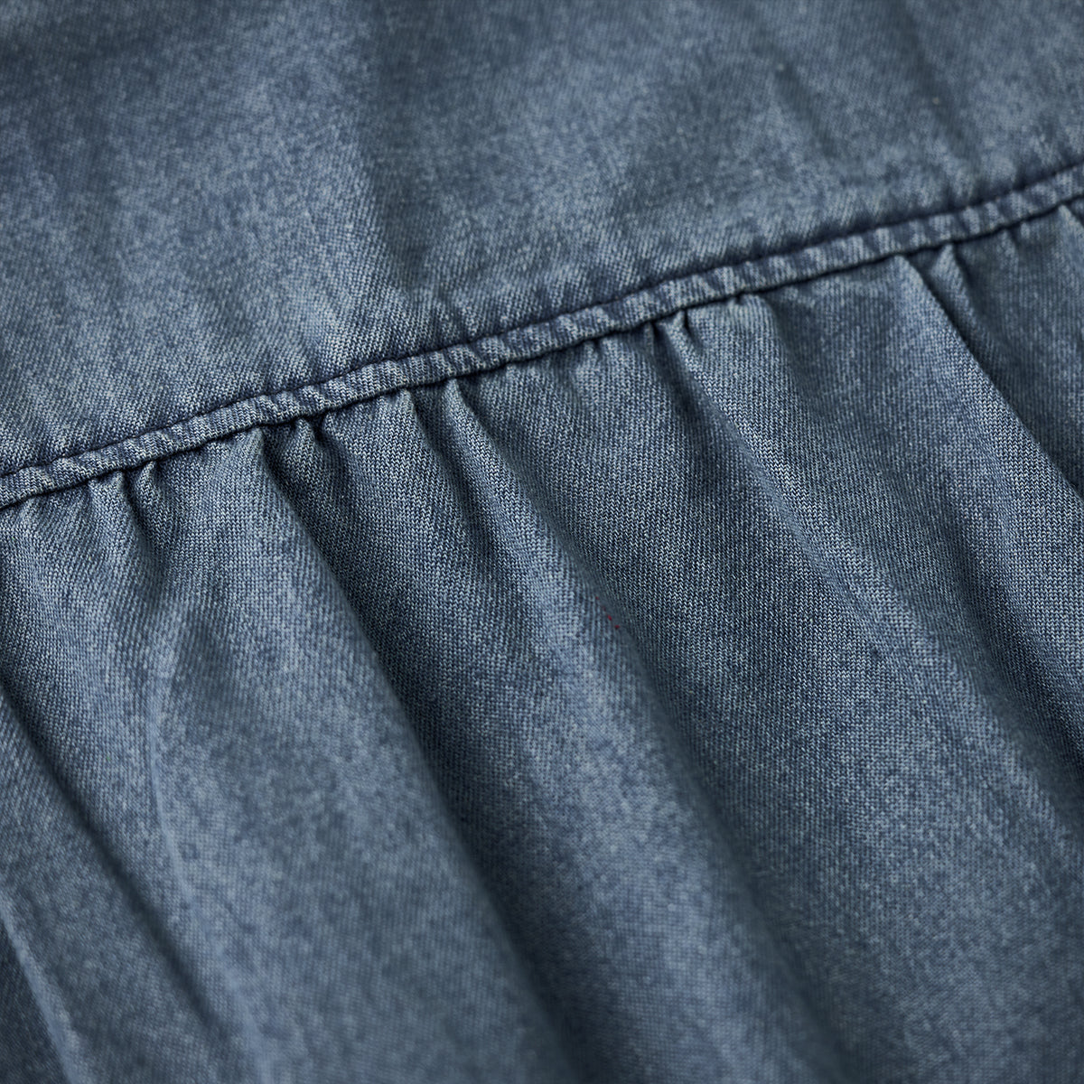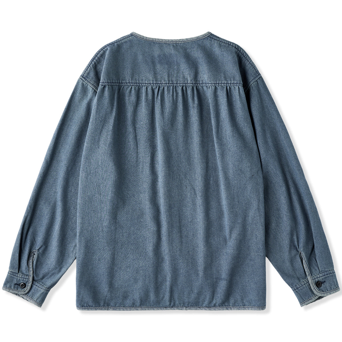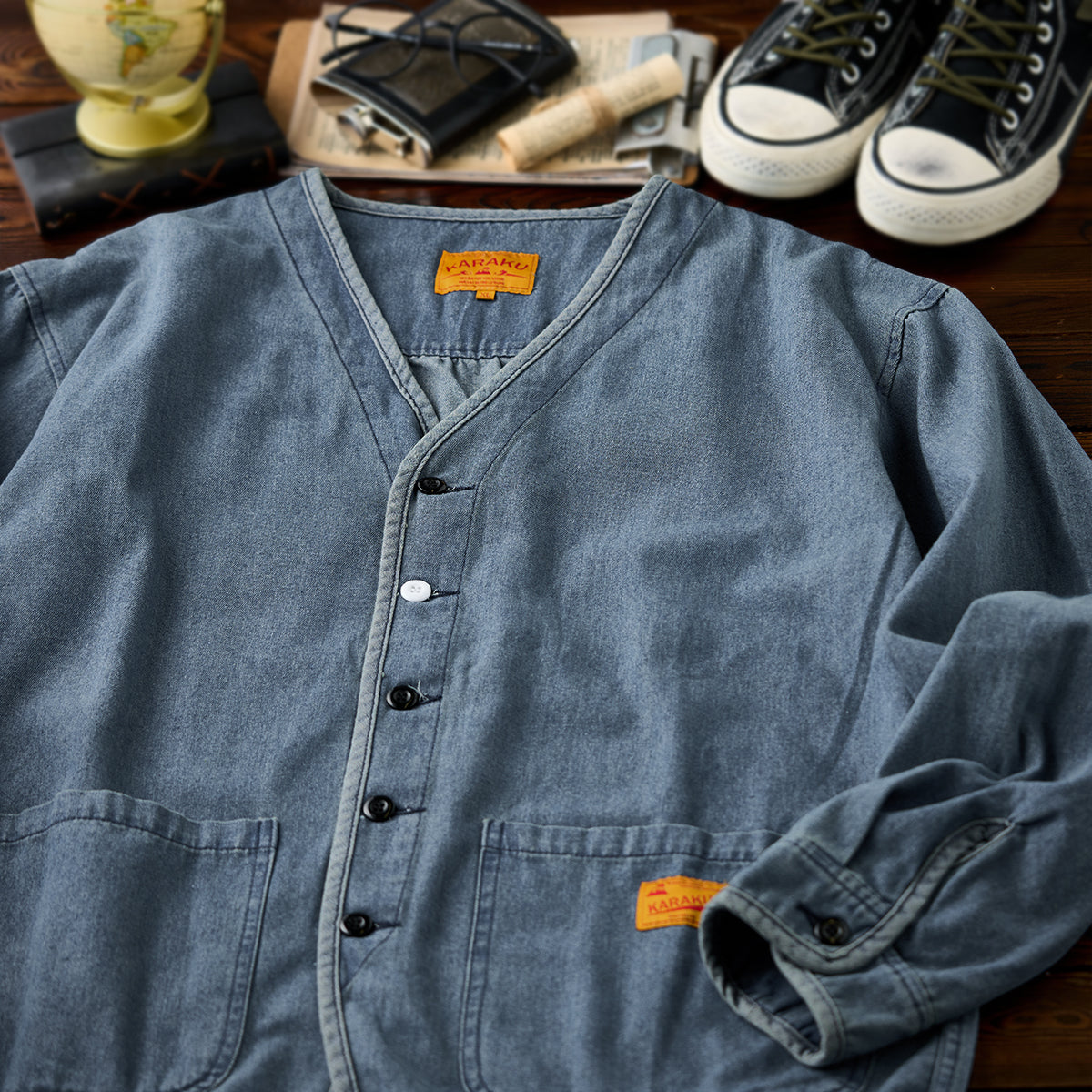「KARAKU」로고 자수 워시드 데님 긴팔 셔츠