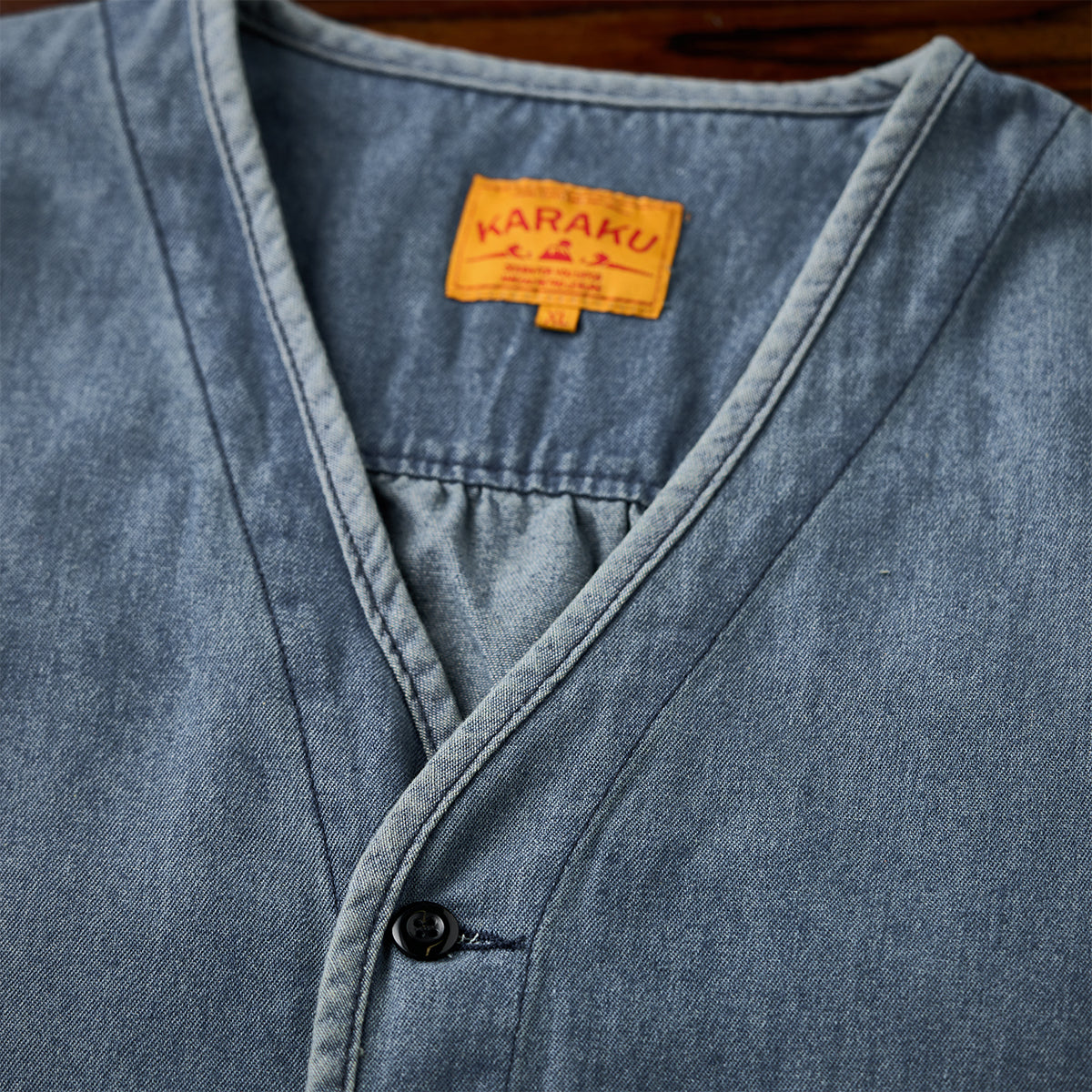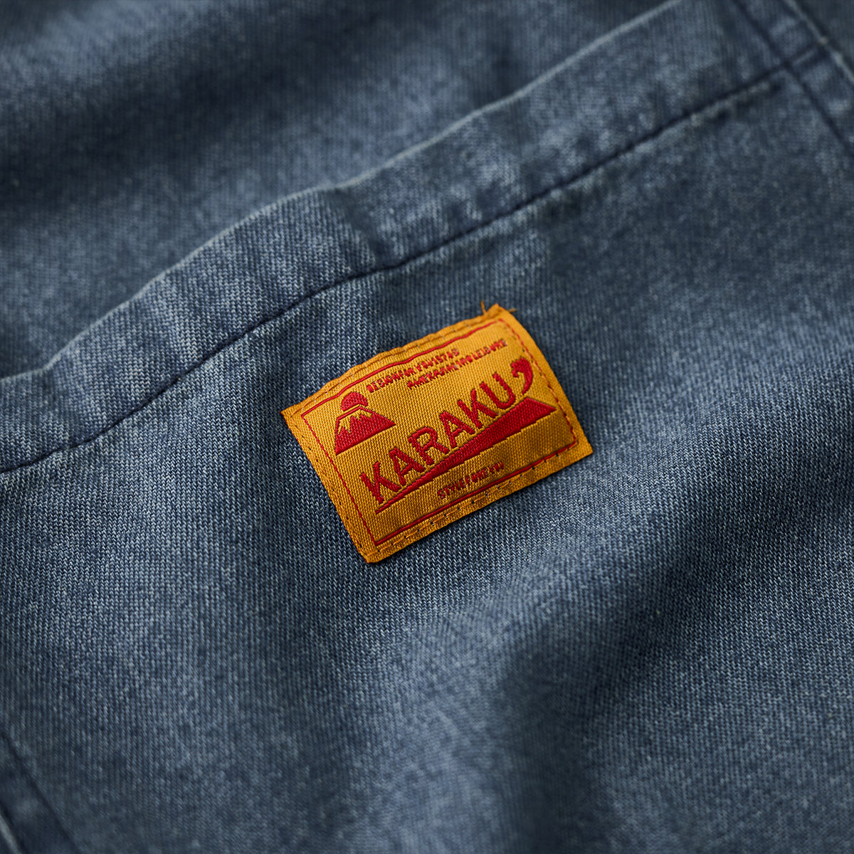 【사전예약】「Karaku」자수 로고 에스닉 패턴 안감 데님 오픈칼라 셔츠