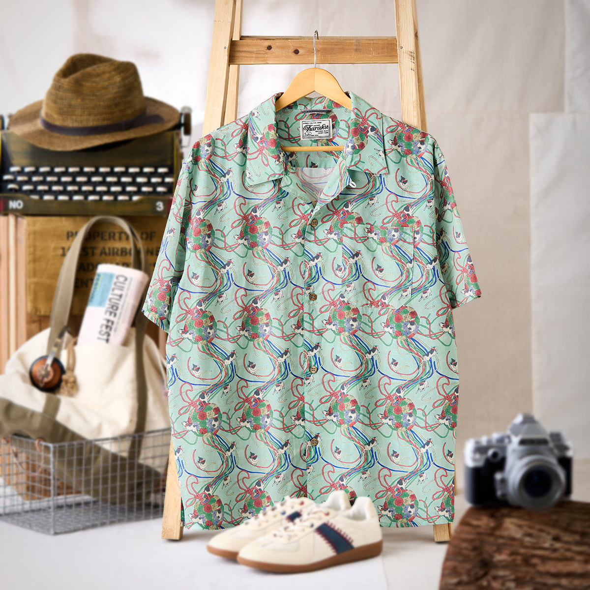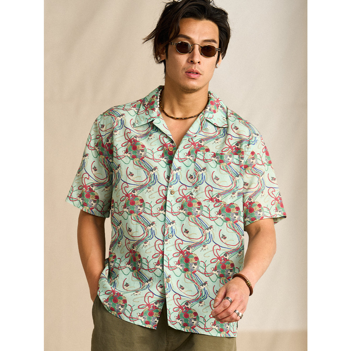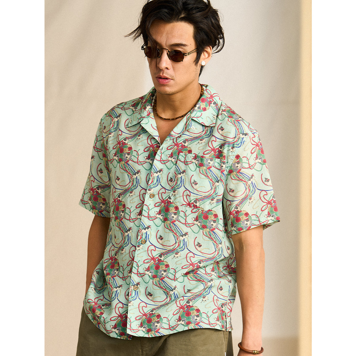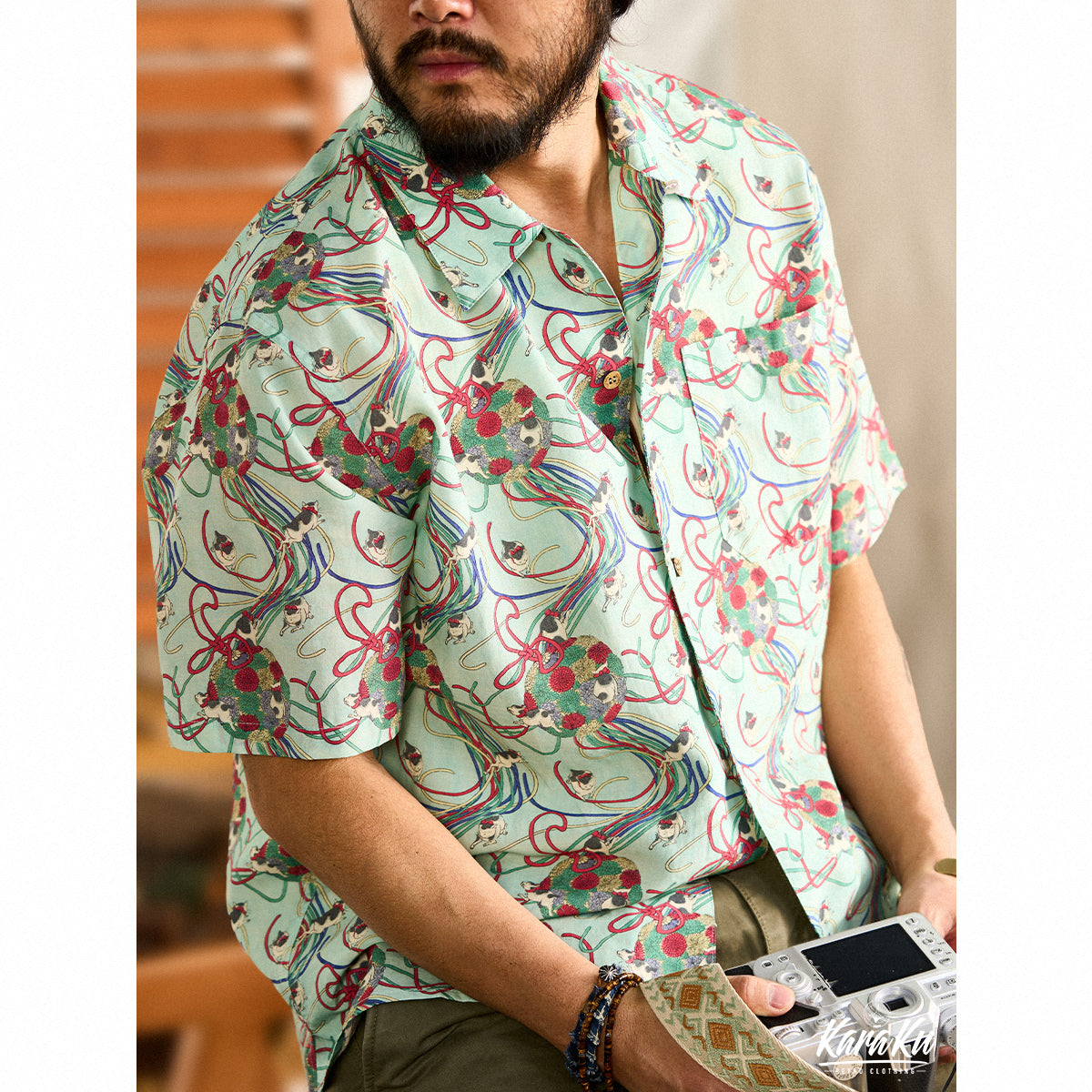메이지 시대의 그림을 모티브로 하여, 우키요에 특유의 감성을 담아낸 아로하 셔츠입니다. 전통적인 일본의 아름다움을 현대적인 스타일로 재해석했습니다.