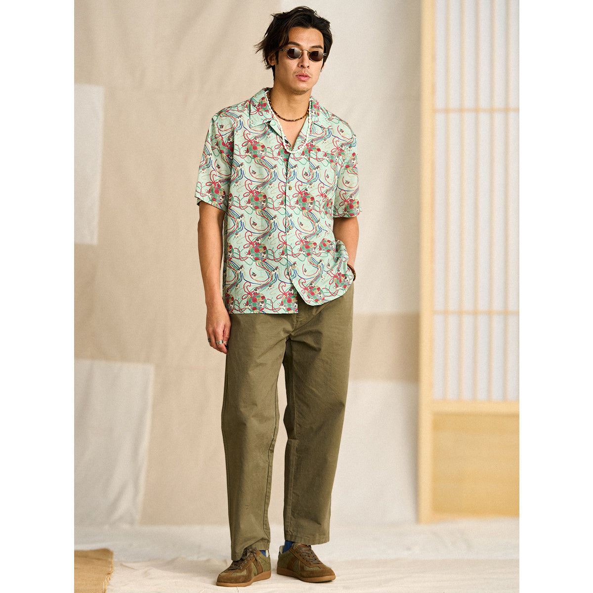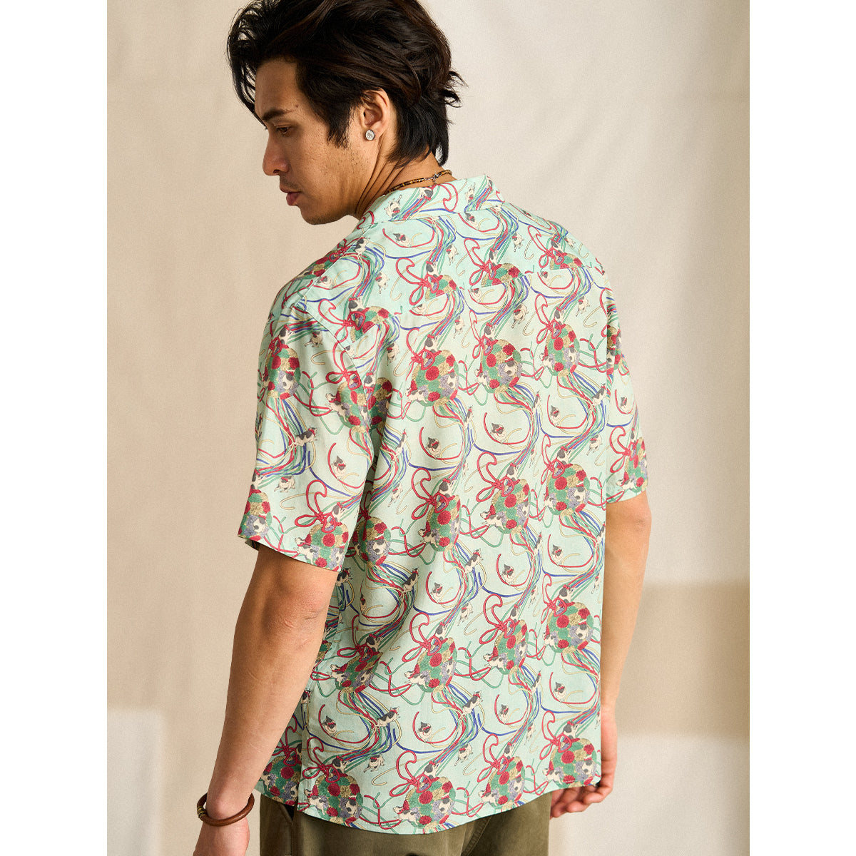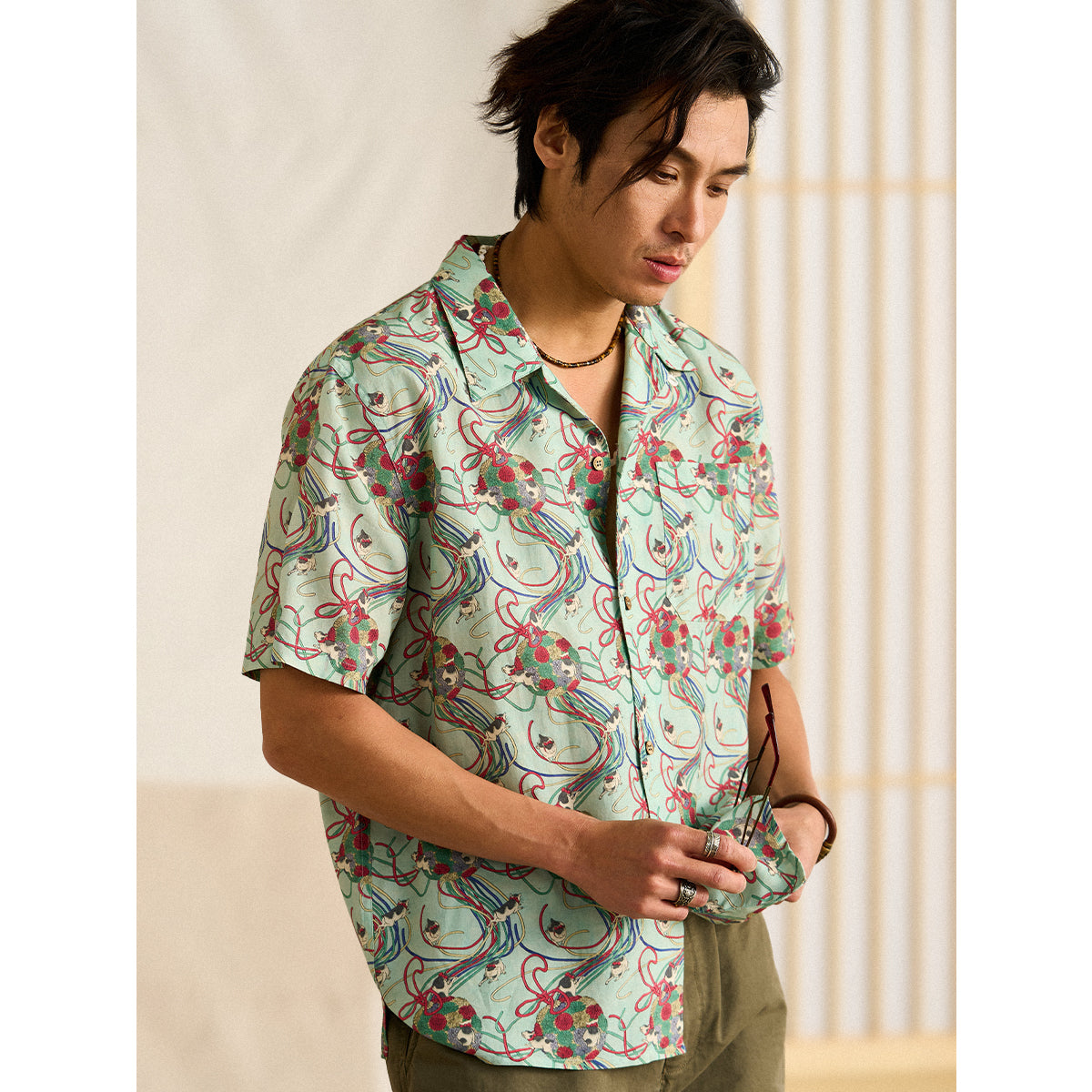 메이지 시대의 그림을 모티브로 하여, 우키요에 특유의 감성을 담아낸 아로하 셔츠입니다. 전통적인 일본의 아름다움을 현대적인 스타일로 재해석했습니다.