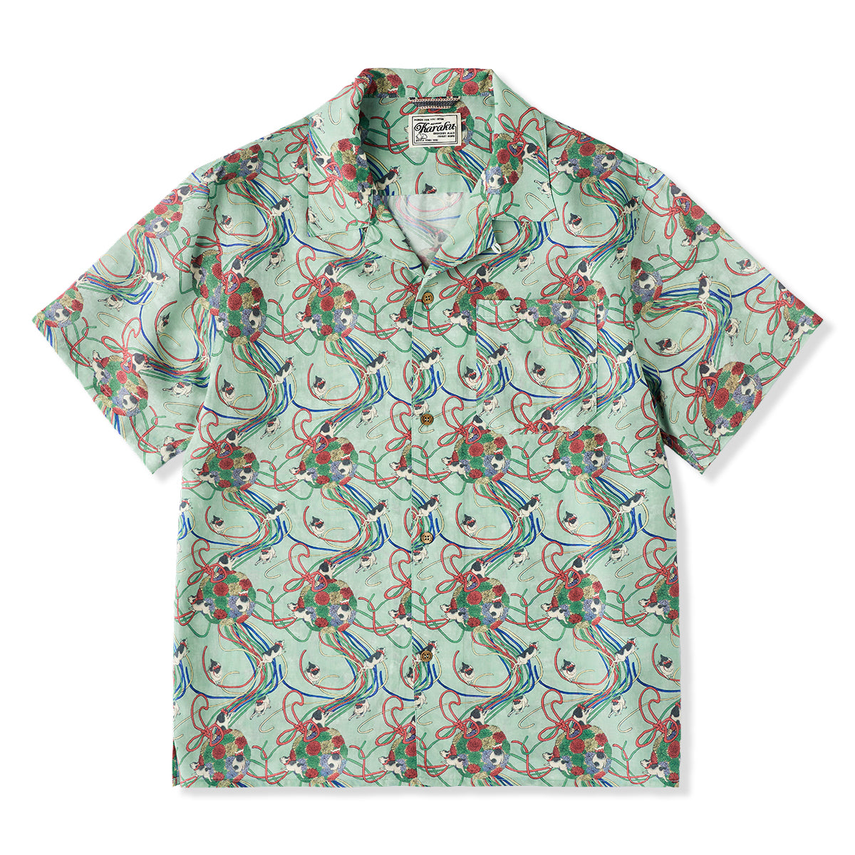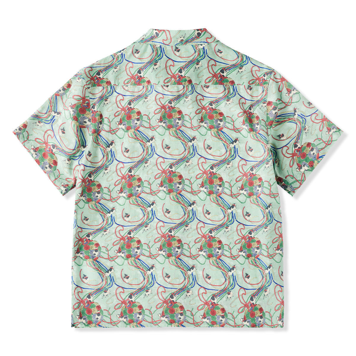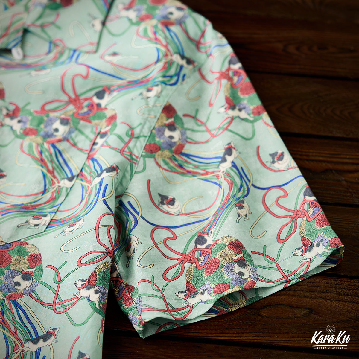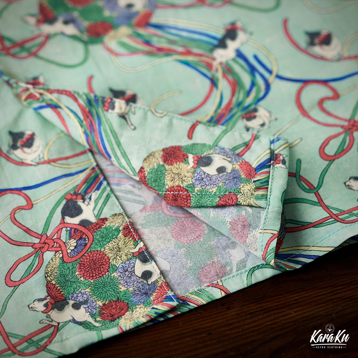 메이지 시대「고양이・리본・국화」우키요에 텐셀 알로하 셔츠