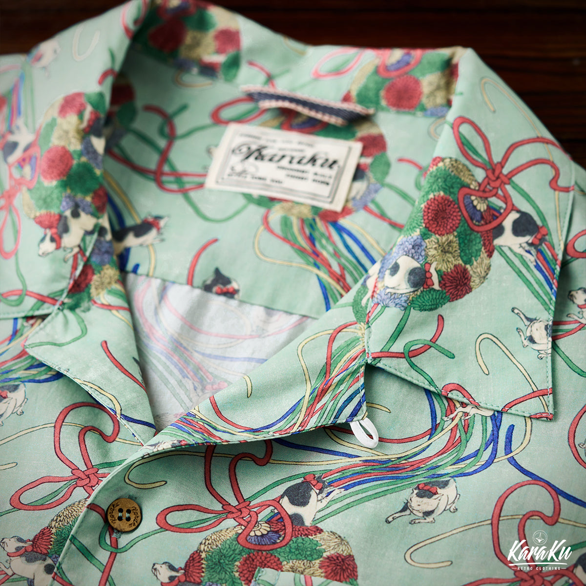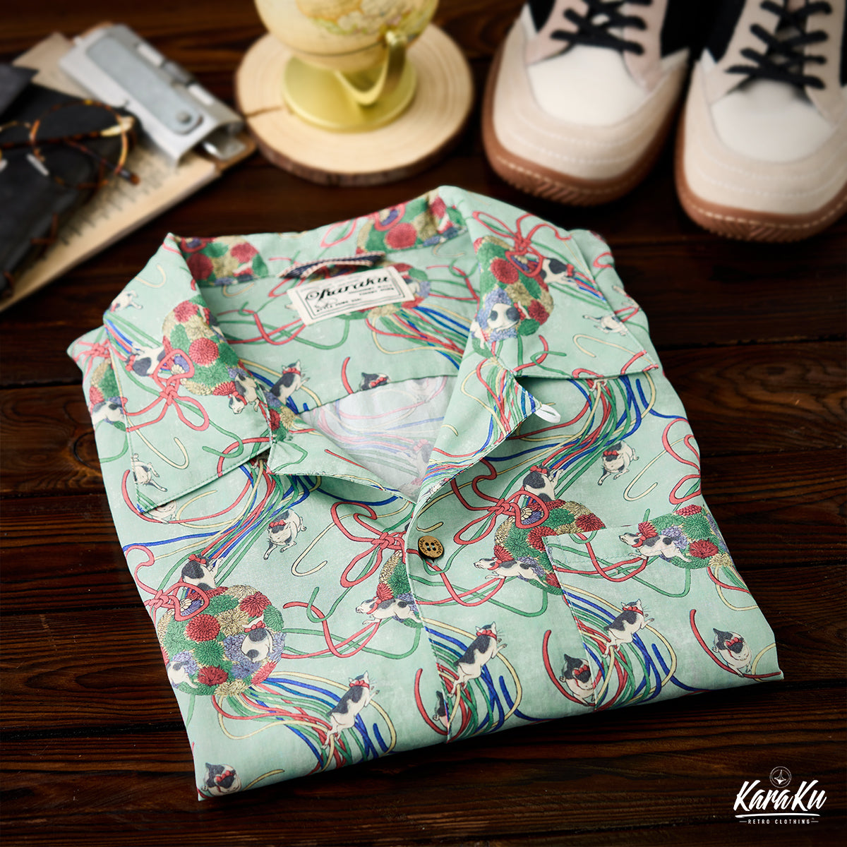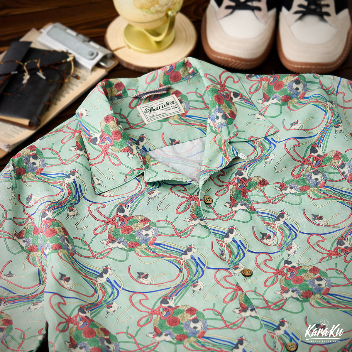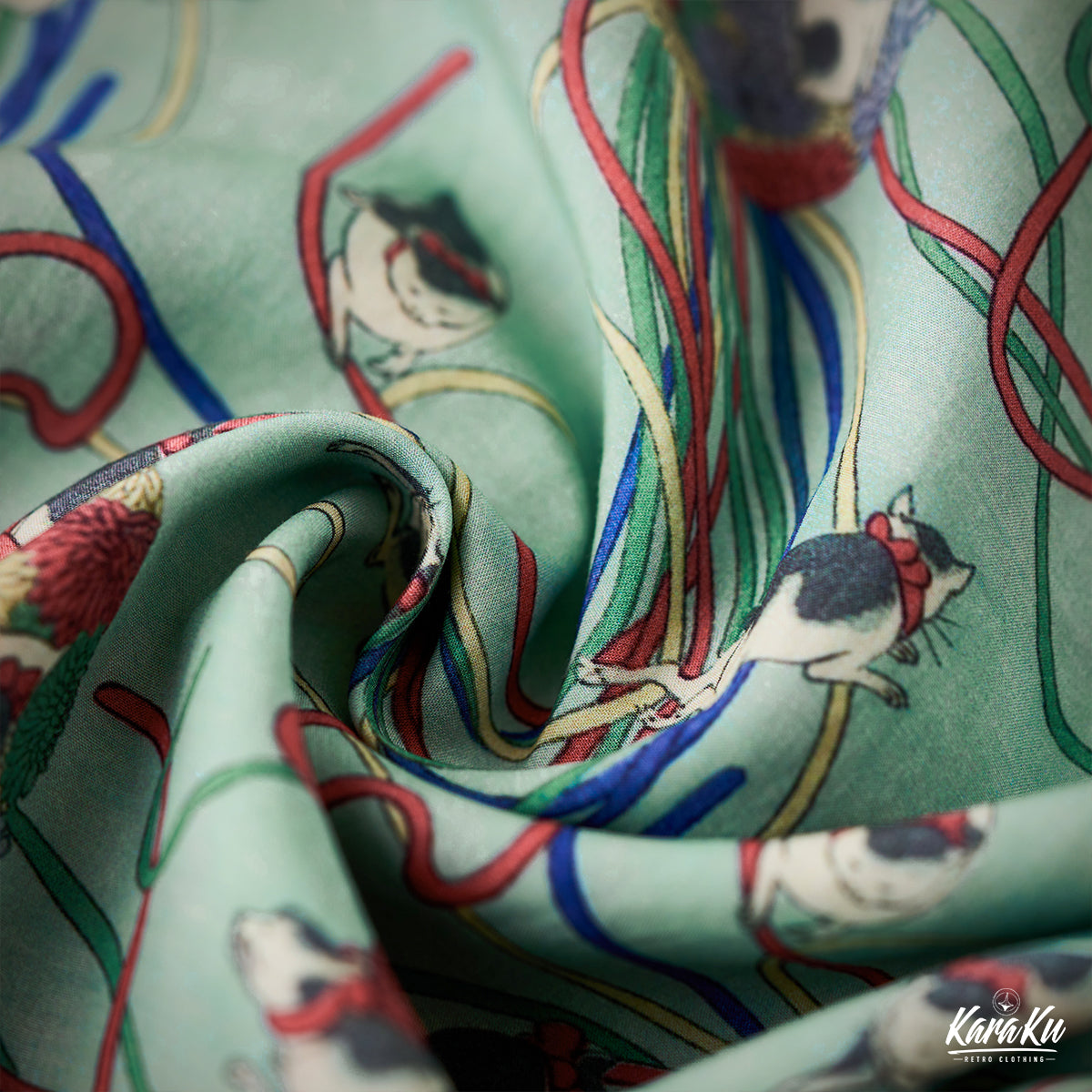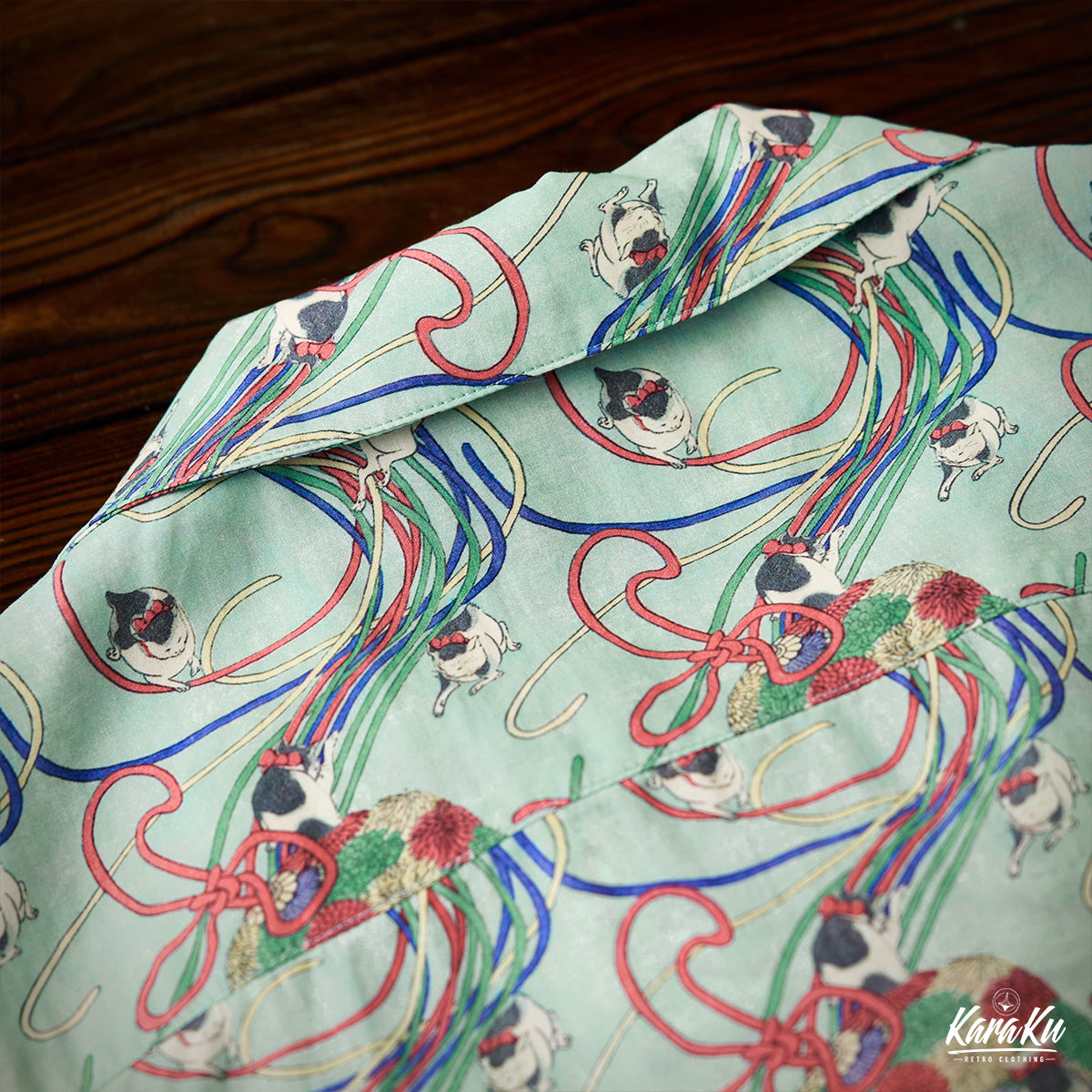 메이지 시대「고양이・리본・국화」우키요에 텐셀 알로하 셔츠