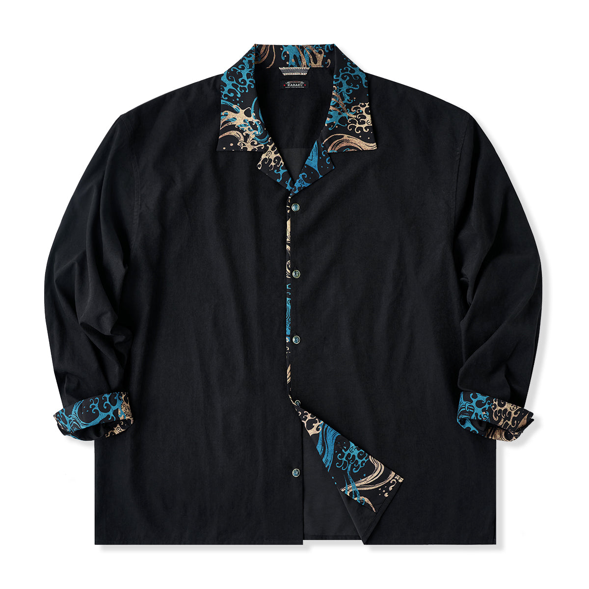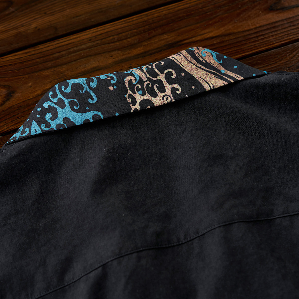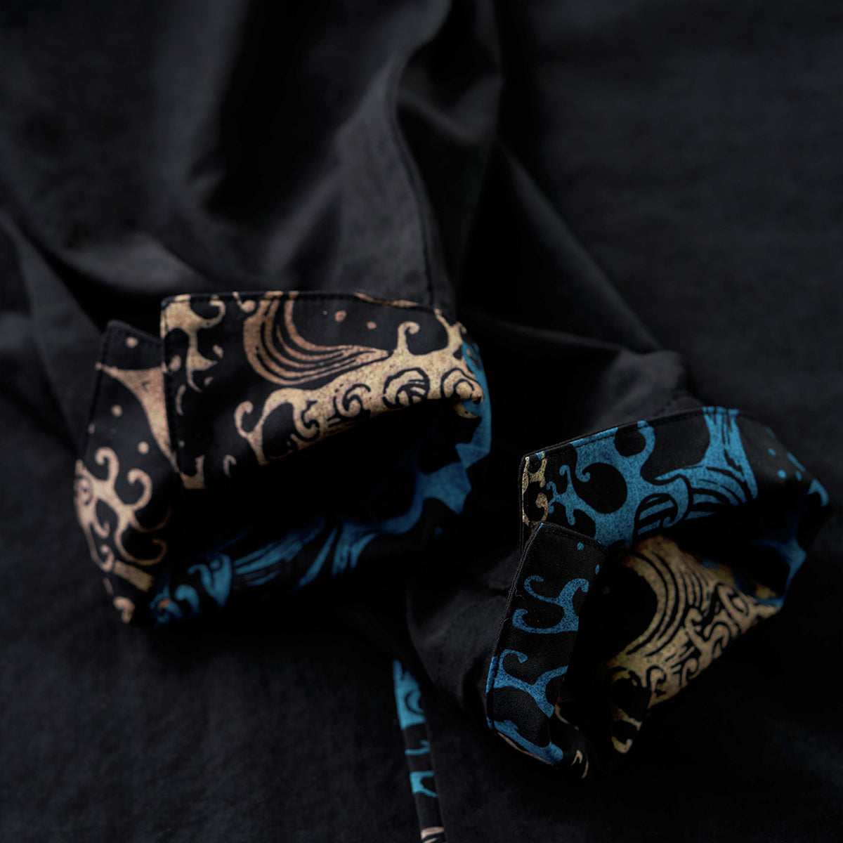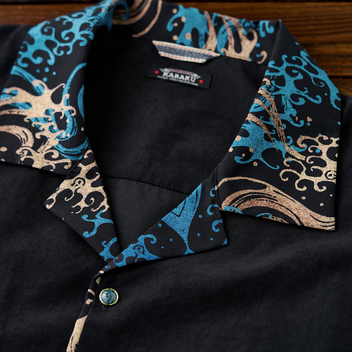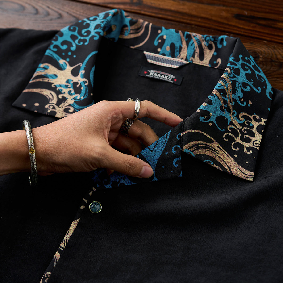 소매·칼라·앞단의 파도 무늬는 에도 시대부터 이어진 일본 전통 디자인으로, 힘과 자연의 역동성을 상징합니다. 골드와 블루가 블랙 셔츠와 조화를 이루어 전통과 모던한 감각을 동시에 전합니다.