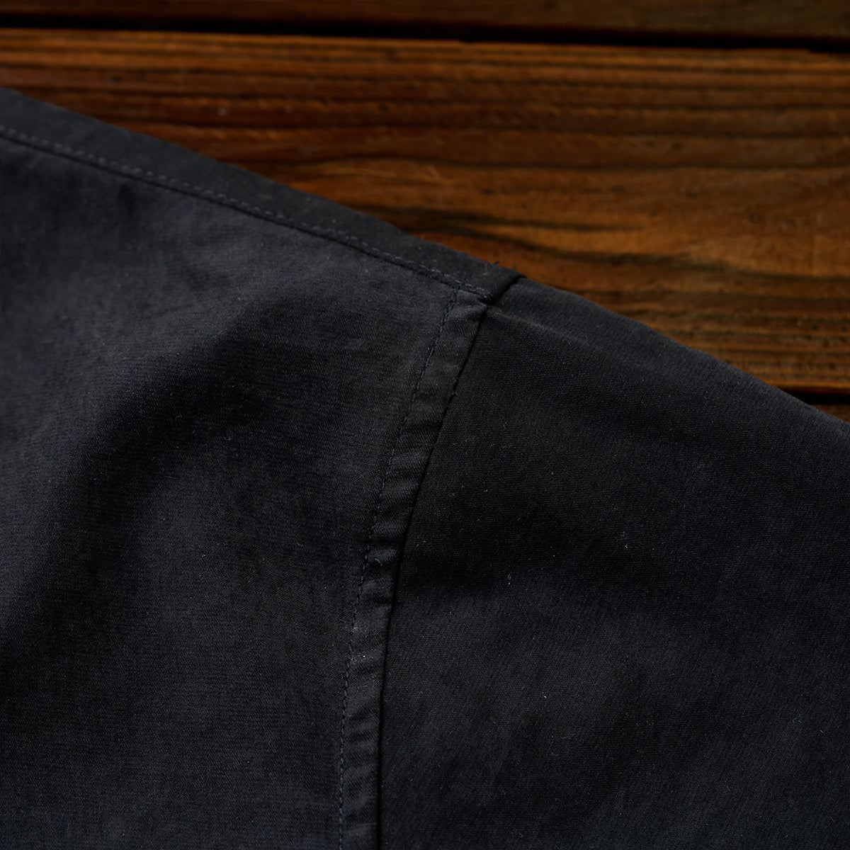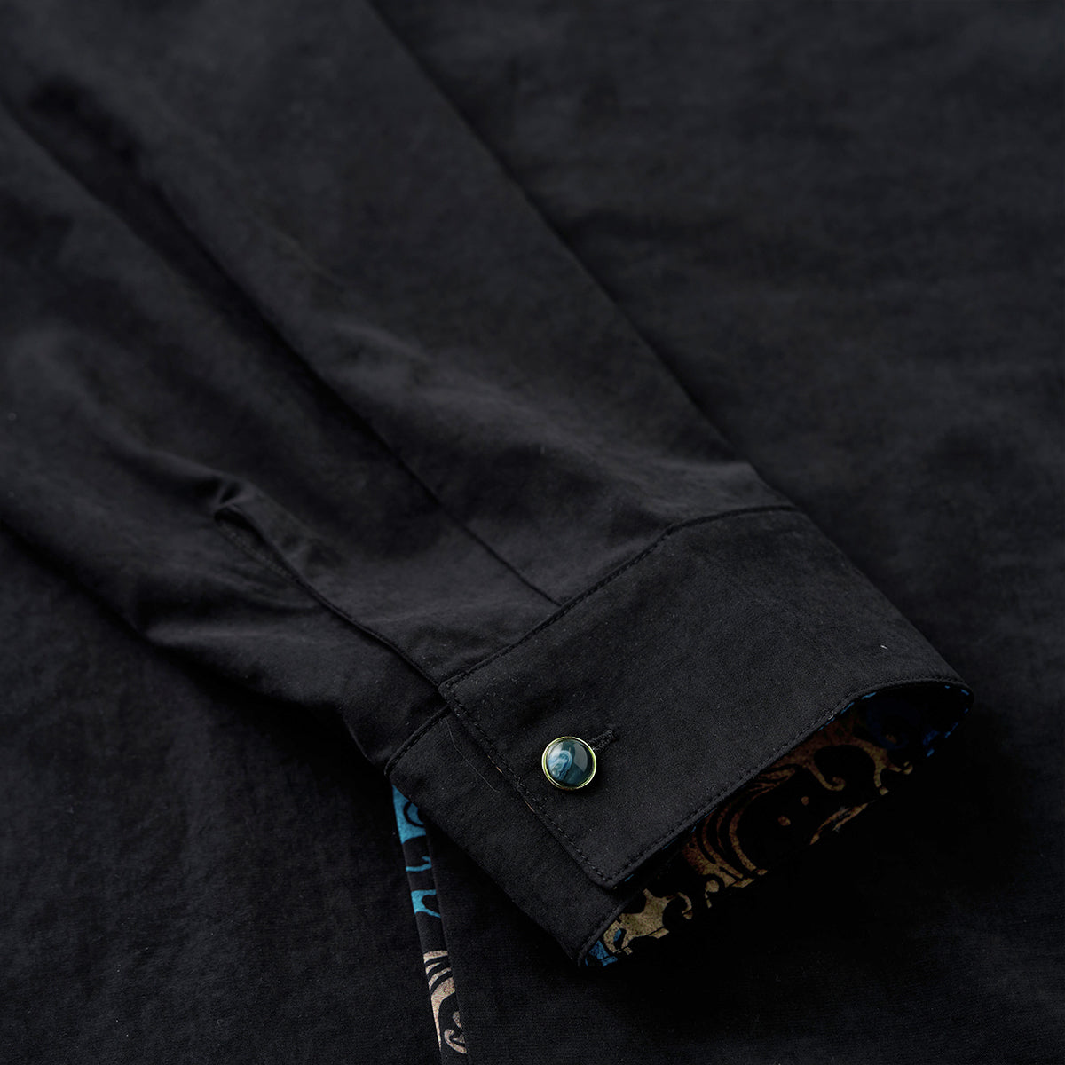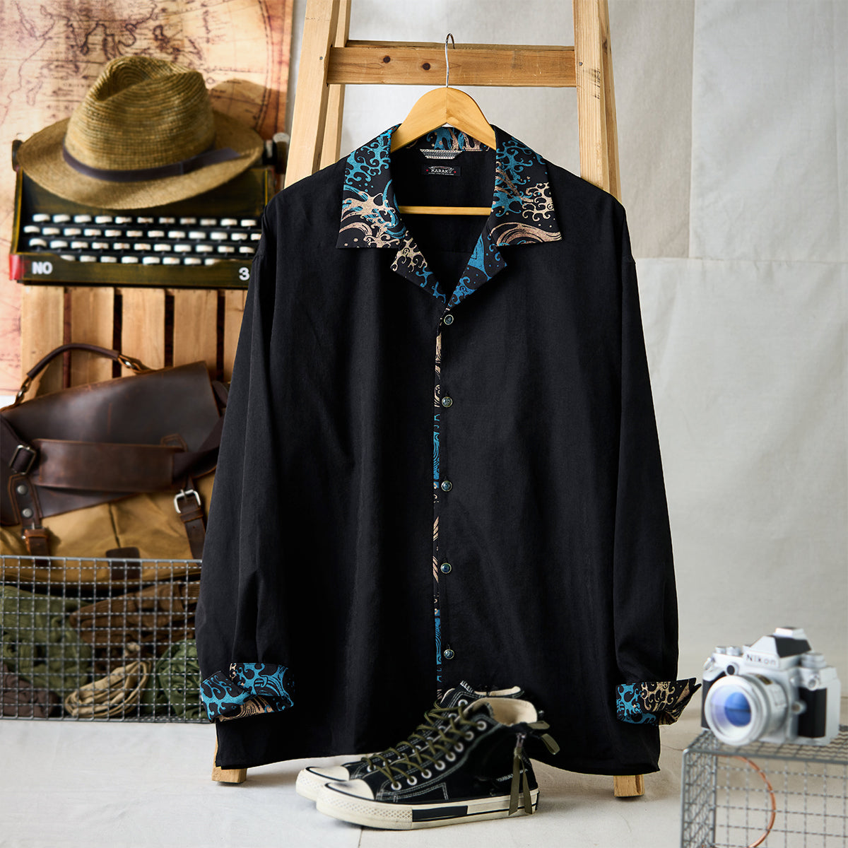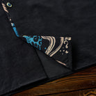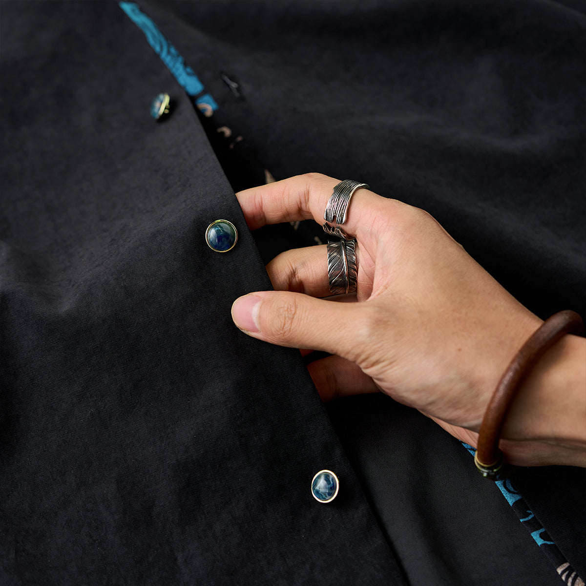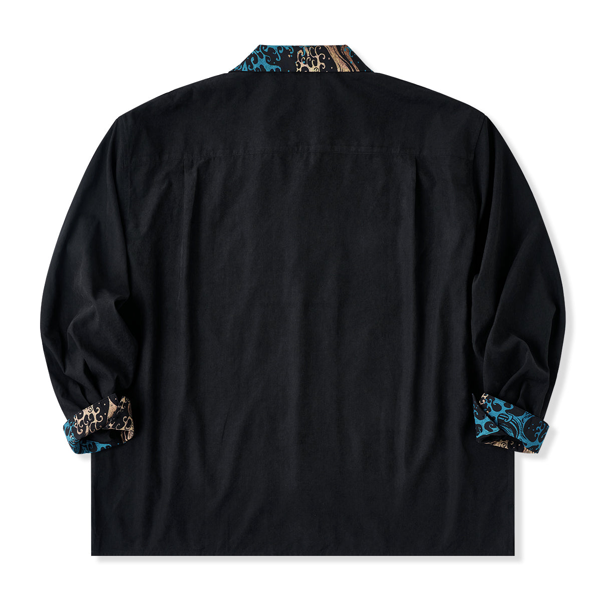 소매·칼라·앞단의 파도 무늬는 에도 시대부터 이어진 일본 전통 디자인으로, 힘과 자연의 역동성을 상징합니다. 골드와 블루가 블랙 셔츠와 조화를 이루어 전통과 모던한 감각을 동시에 전합니다.