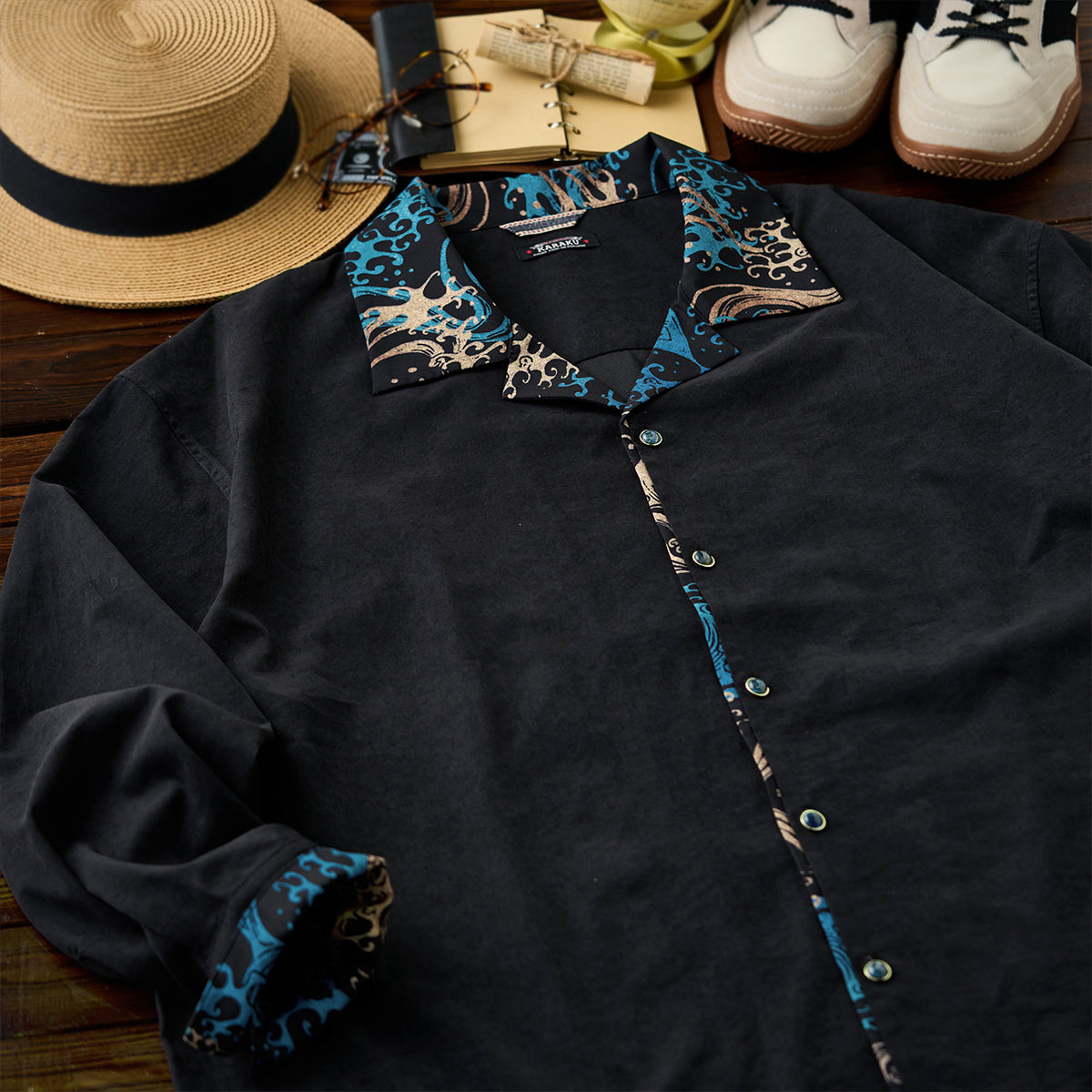 우키요에 기모노 패턴·파도무늬 블루 아게이트 버튼 피치스킨 오픈칼라 셔츠