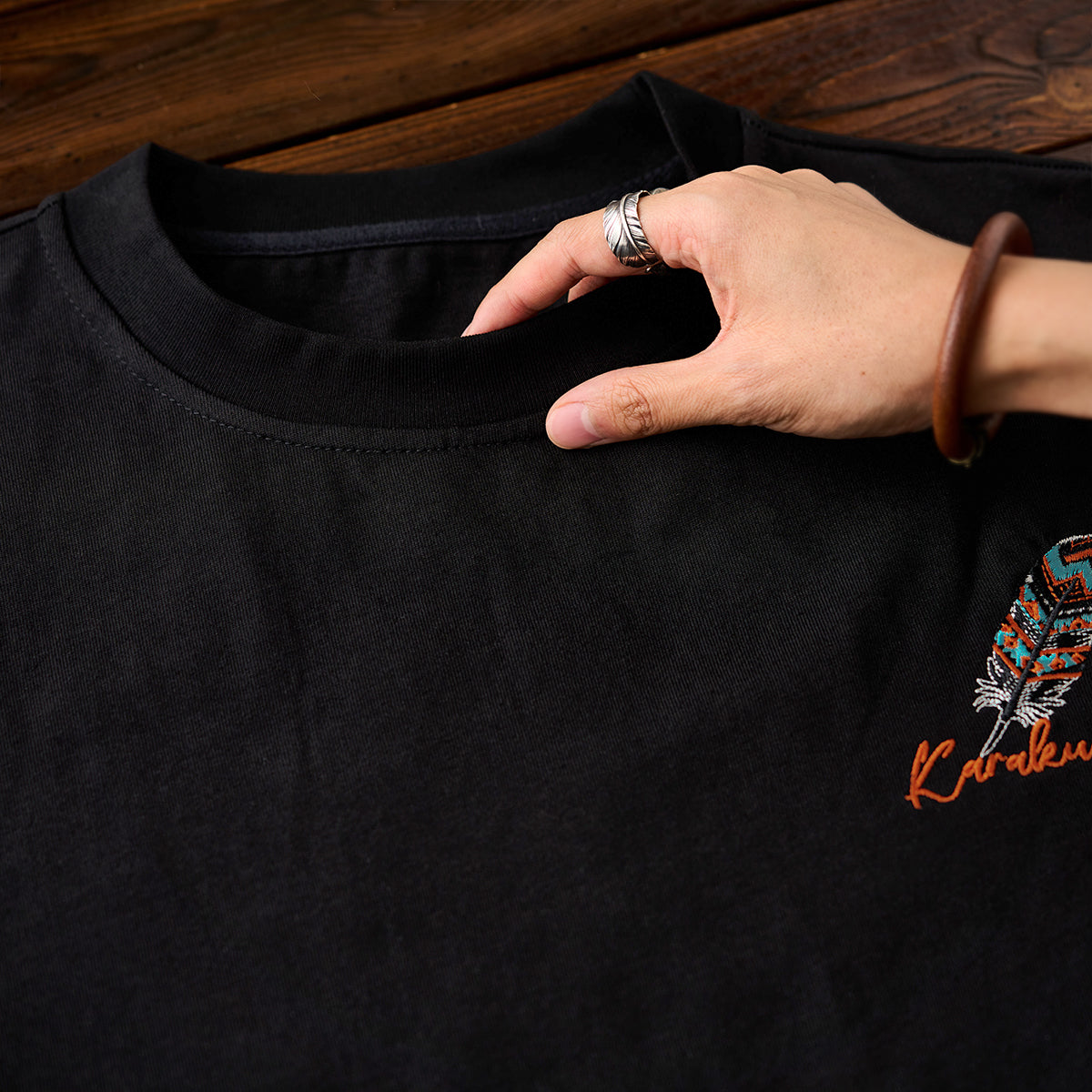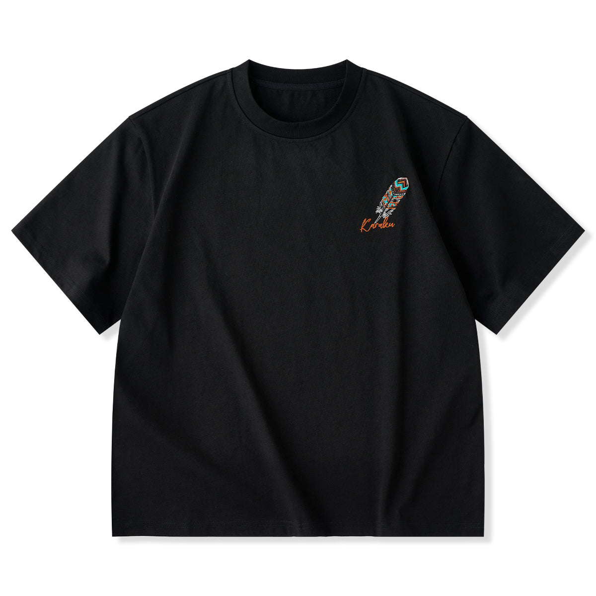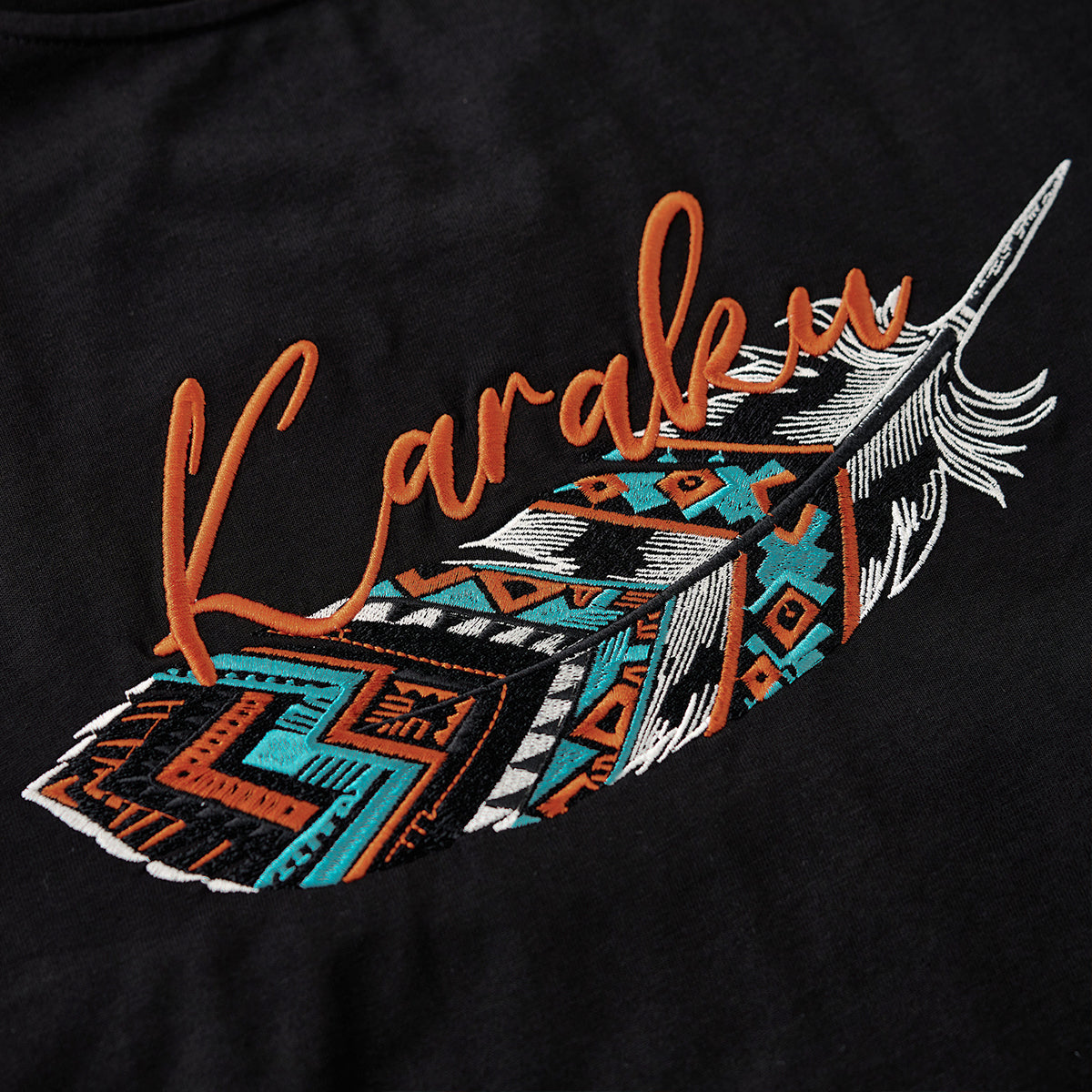 「KaraKu」로고와 나바호 스타일 깃털 자수 코튼 티
