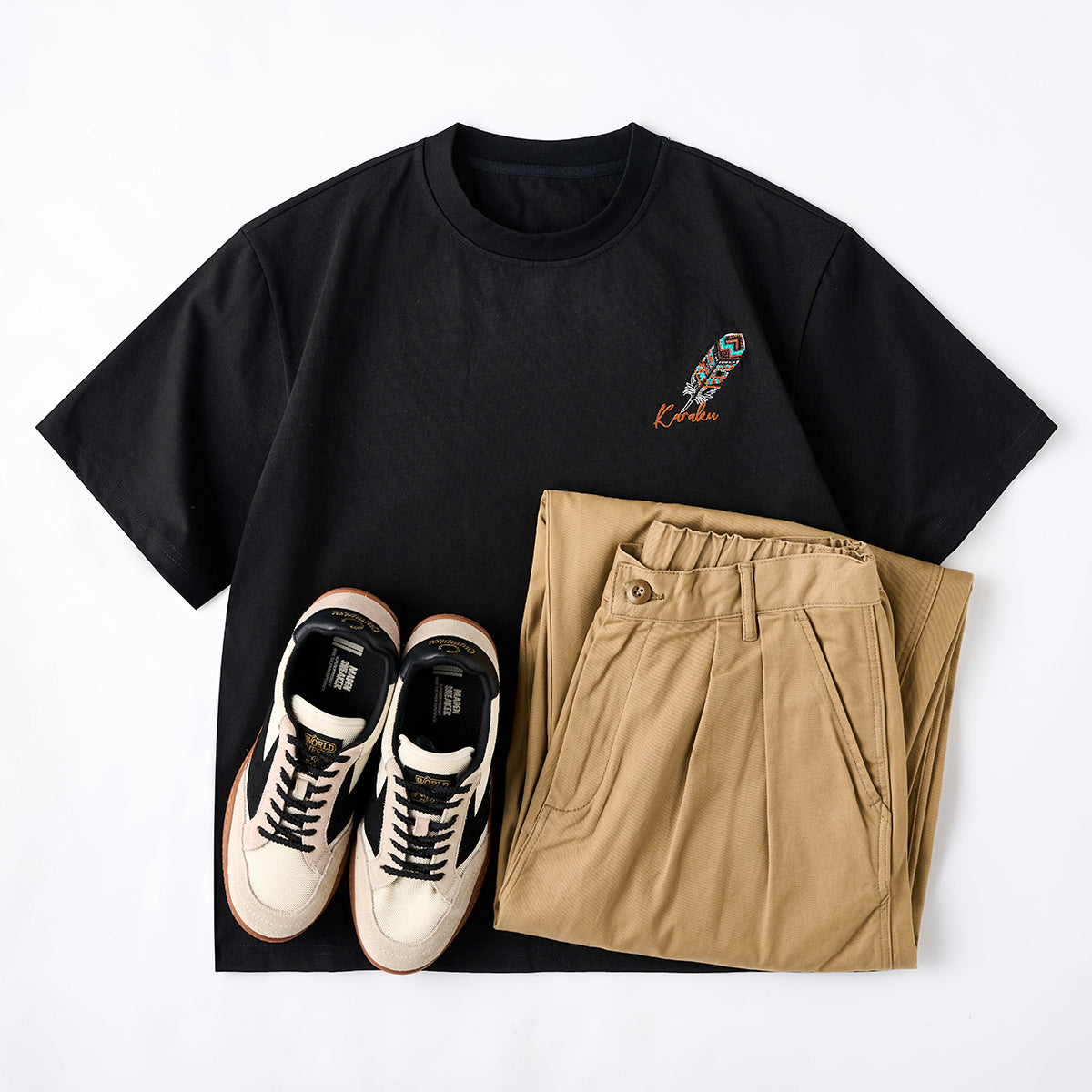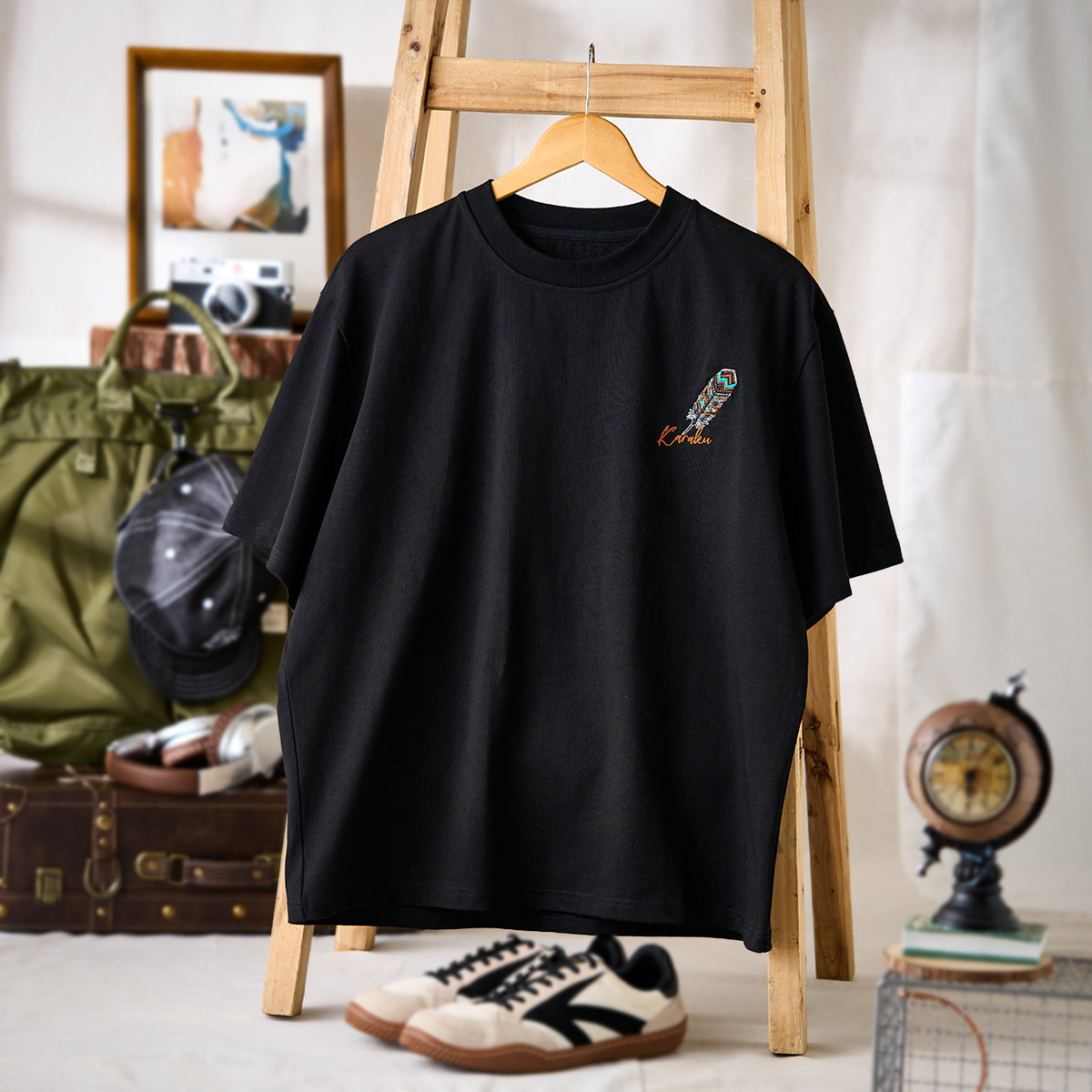 ‘Karaku’ 필기체 로고와 깃털 자수가 어우러져 감각적인 포인트를 주며, 뒷면의 큰 자수가 균형 잡힌 시각적 조화를 완성합니다.