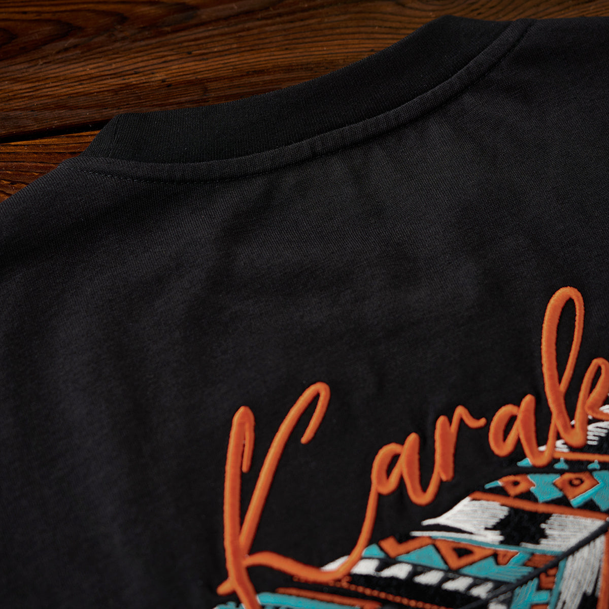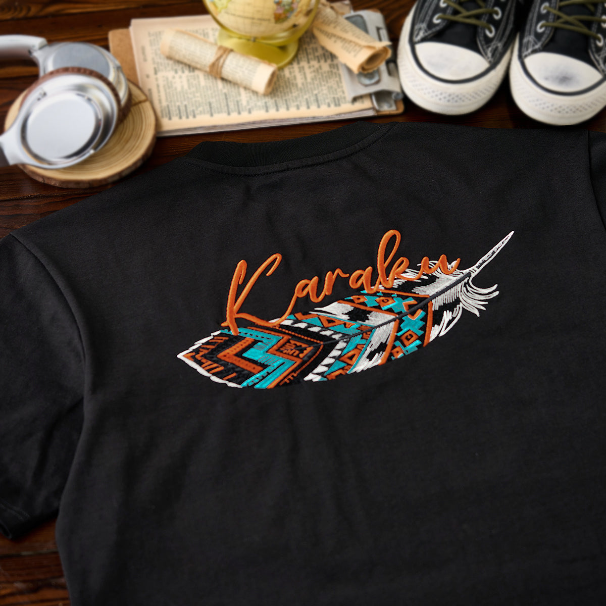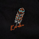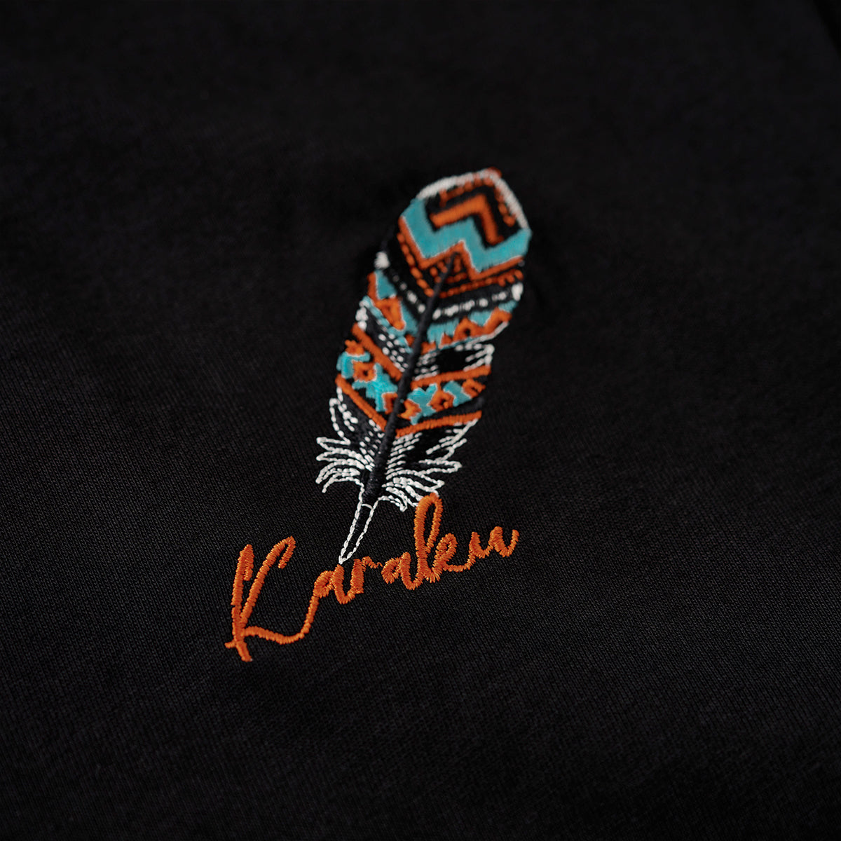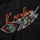 나바호 스타일 깃털 자수와 ‘Karaku’ 로고가 어우러진 블랙 셔츠로, 선명한 컬러와 모던한 디자인이 돋보입니다.