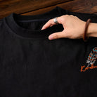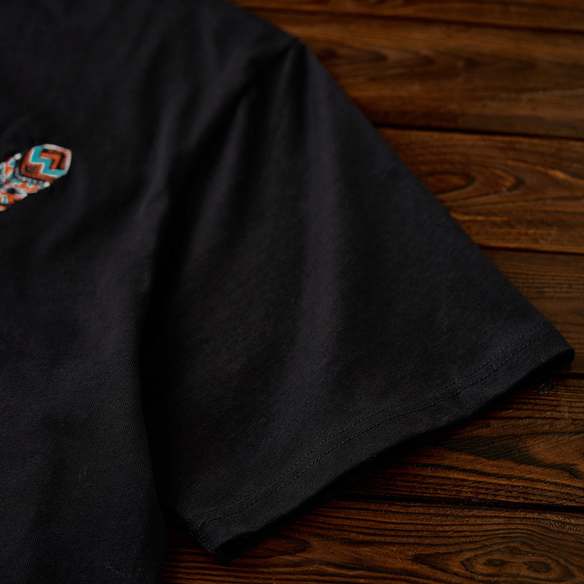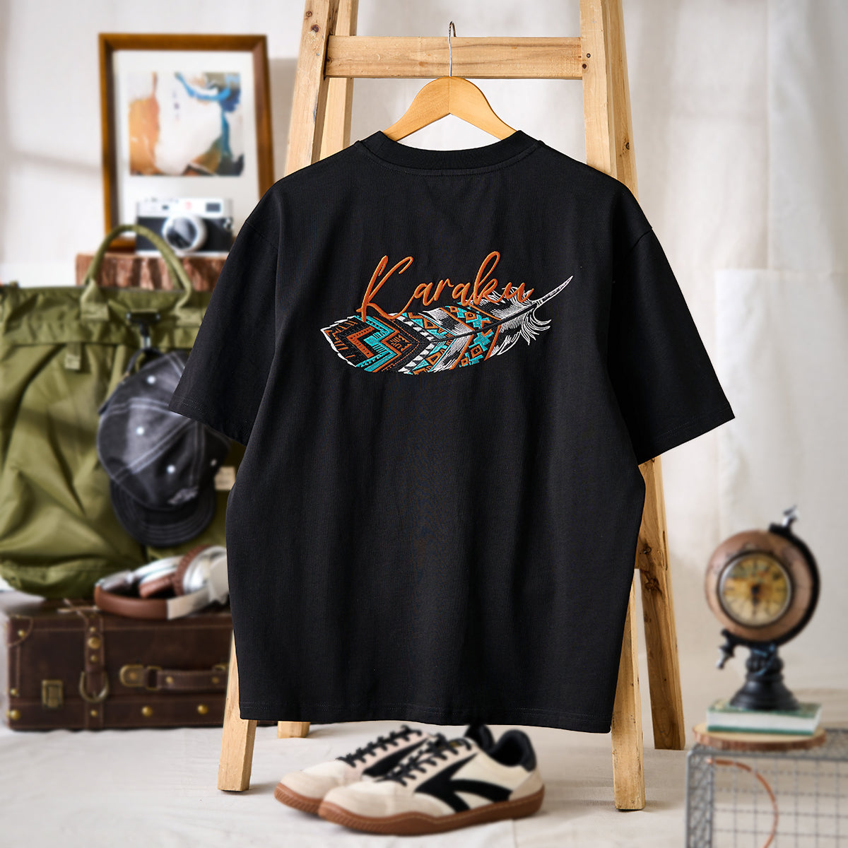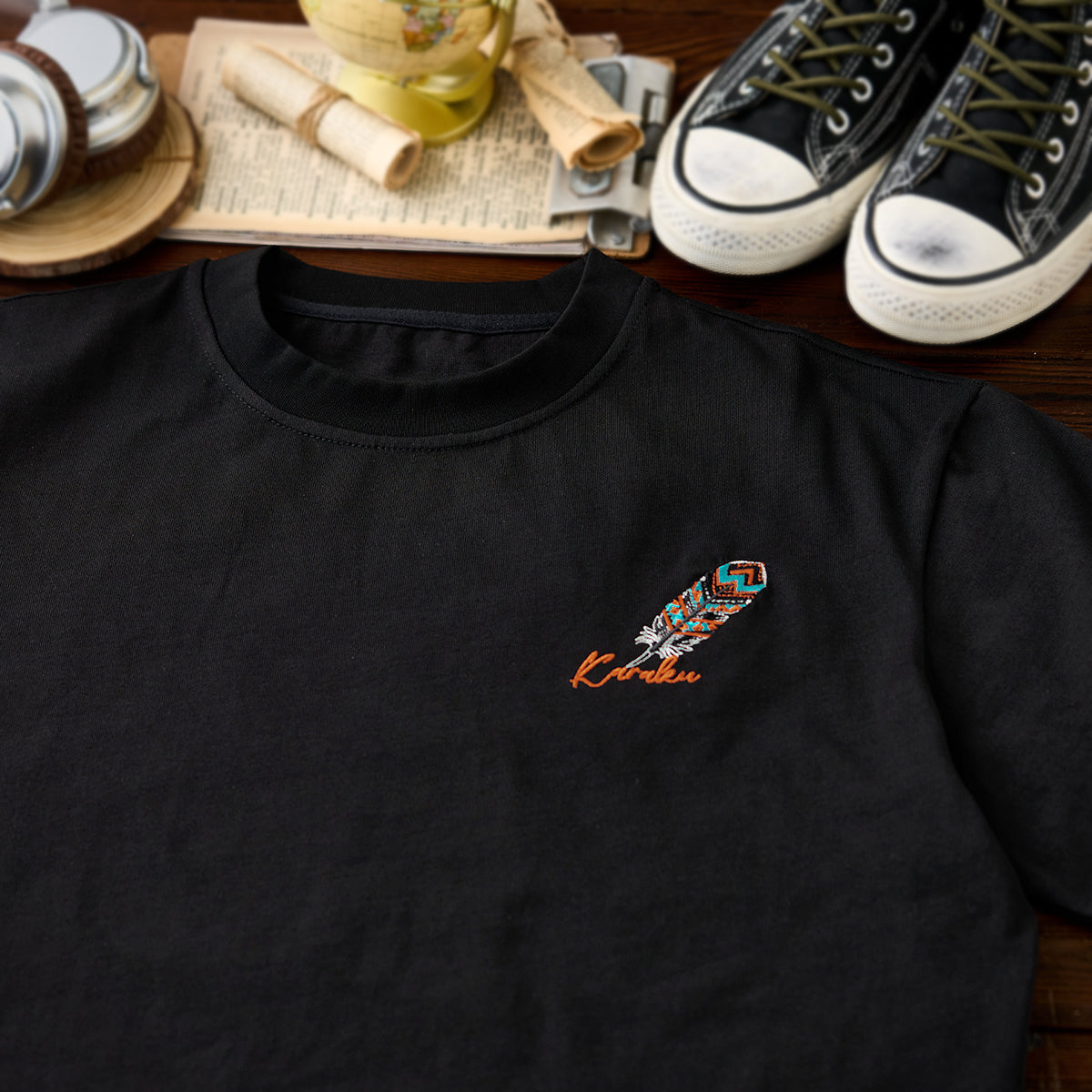 나바호 스타일 깃털 자수와 ‘Karaku’ 로고가 어우러진 블랙 셔츠로, 선명한 컬러와 모던한 디자인이 돋보입니다.