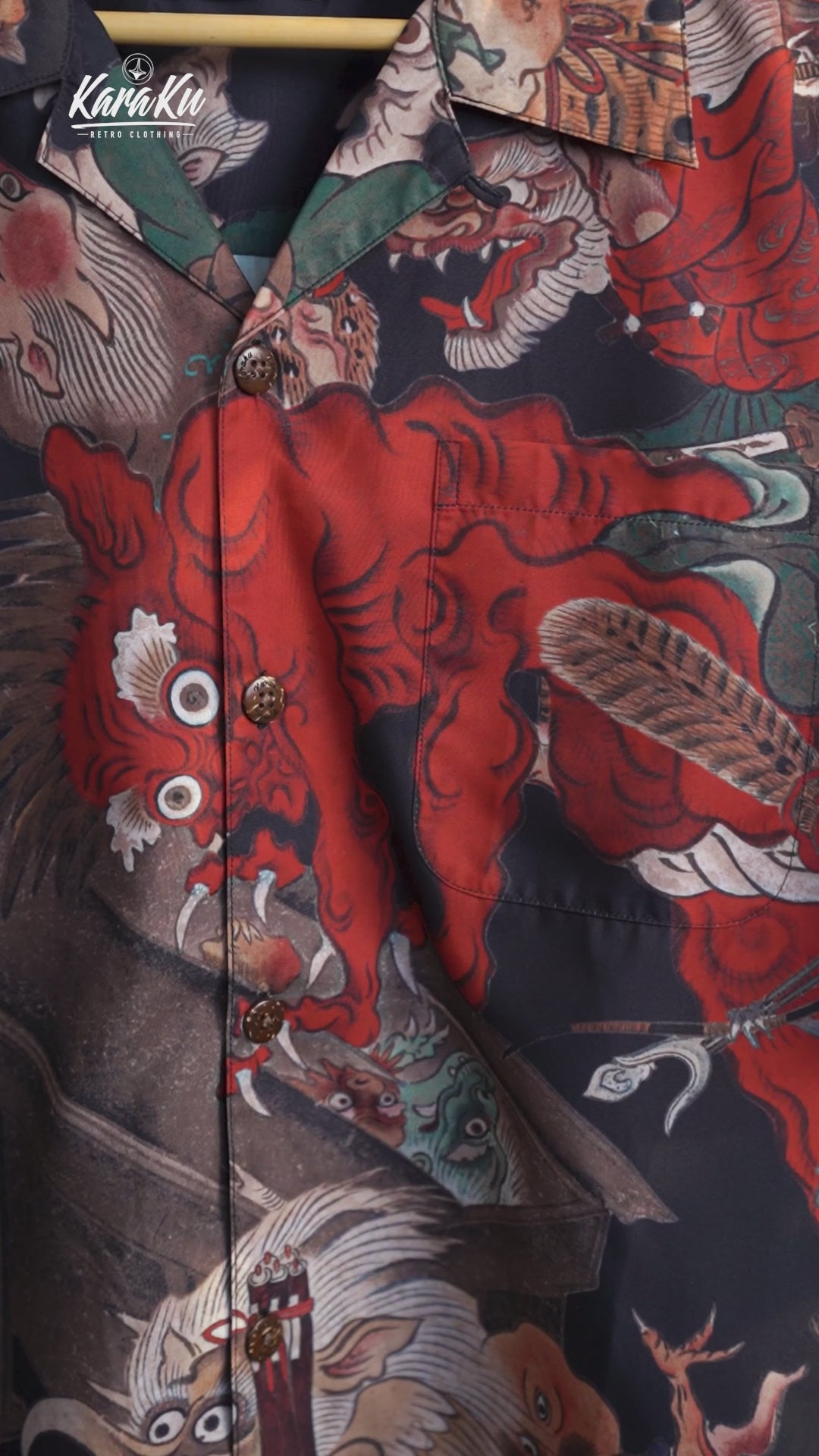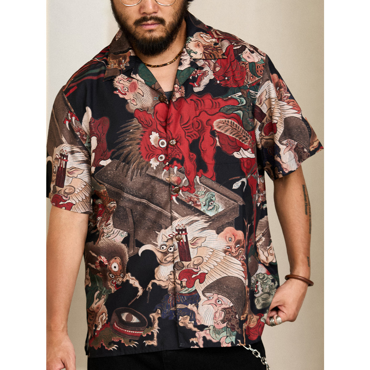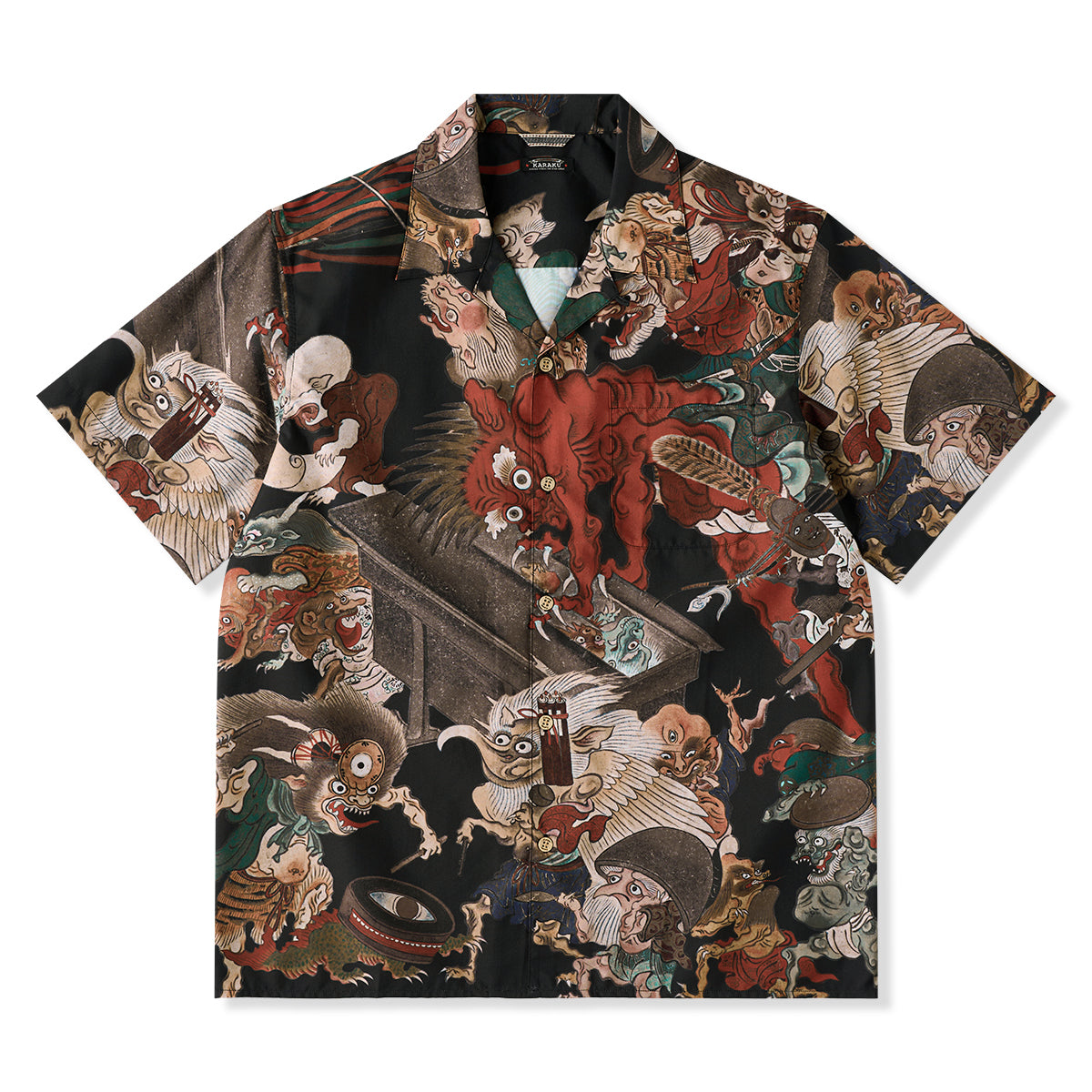 오픈 카라 디자인의 요괴 그래픽 셔츠이며 일본 전통 이형 미학이 담긴 특별한 아이템입니다.