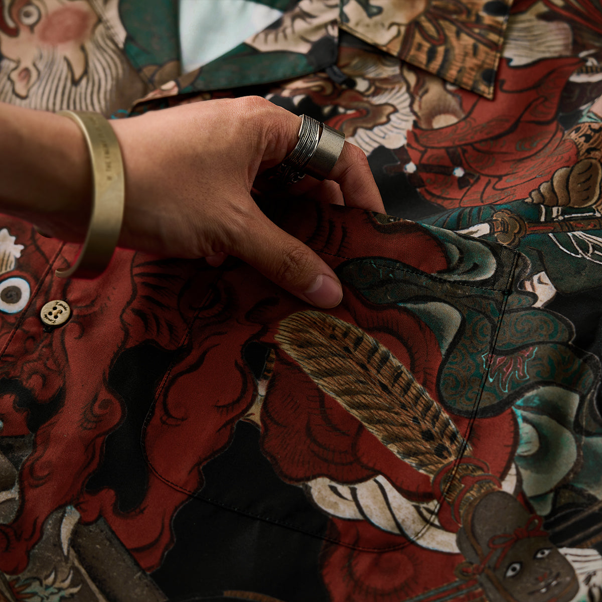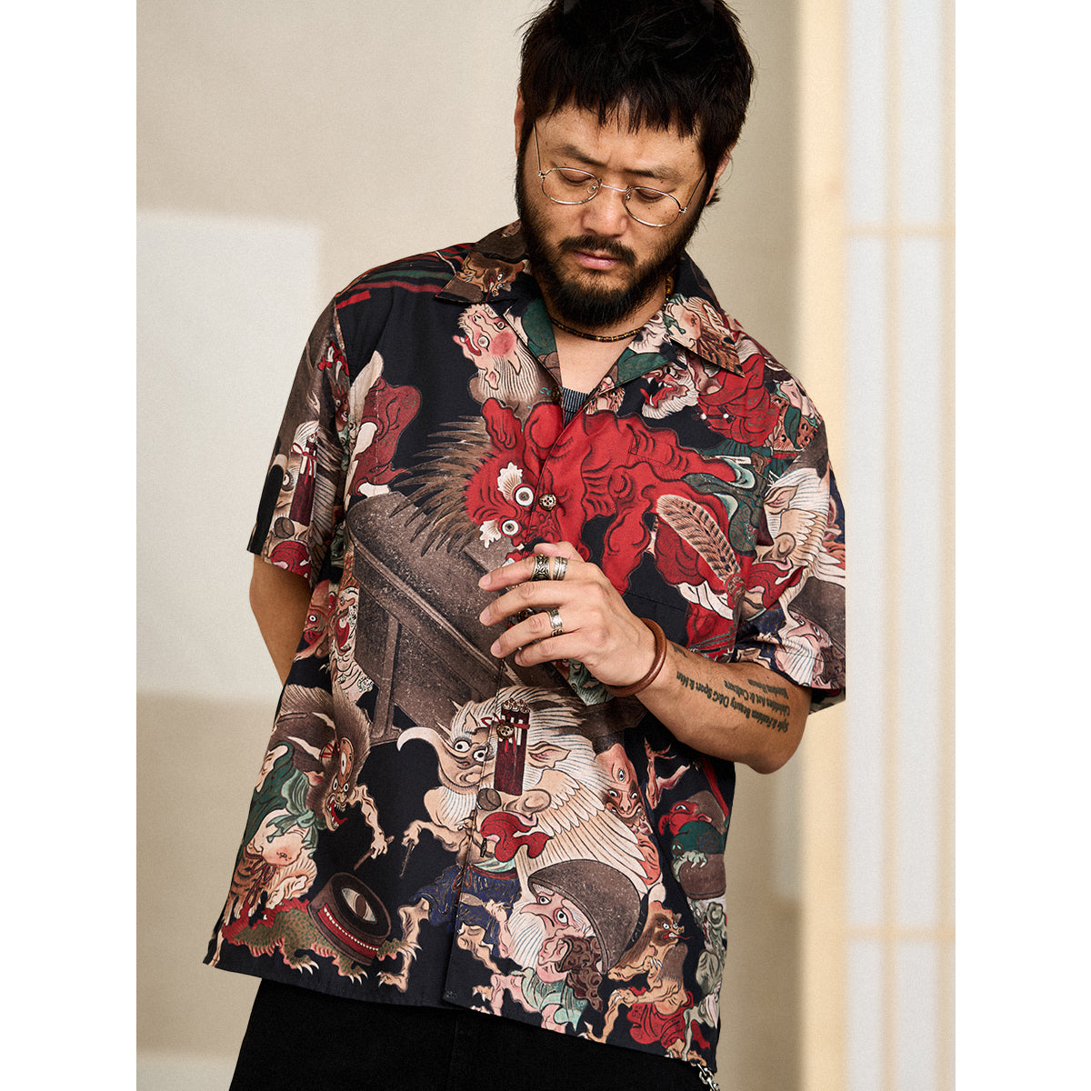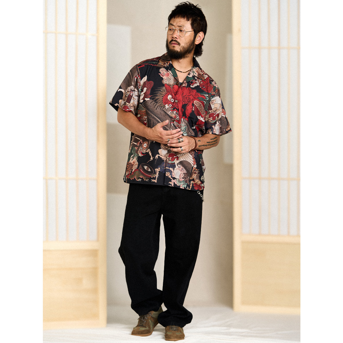 오픈 카라 디자인의 요괴 그래픽 셔츠이며 일본 전통 이형 미학이 담긴 특별한 아이템입니다.