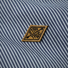 가슴 ‘stay true’ 자수의 포인트와 빈티지한 올드스쿨 감성의 스트라이프 패턴 조화.
