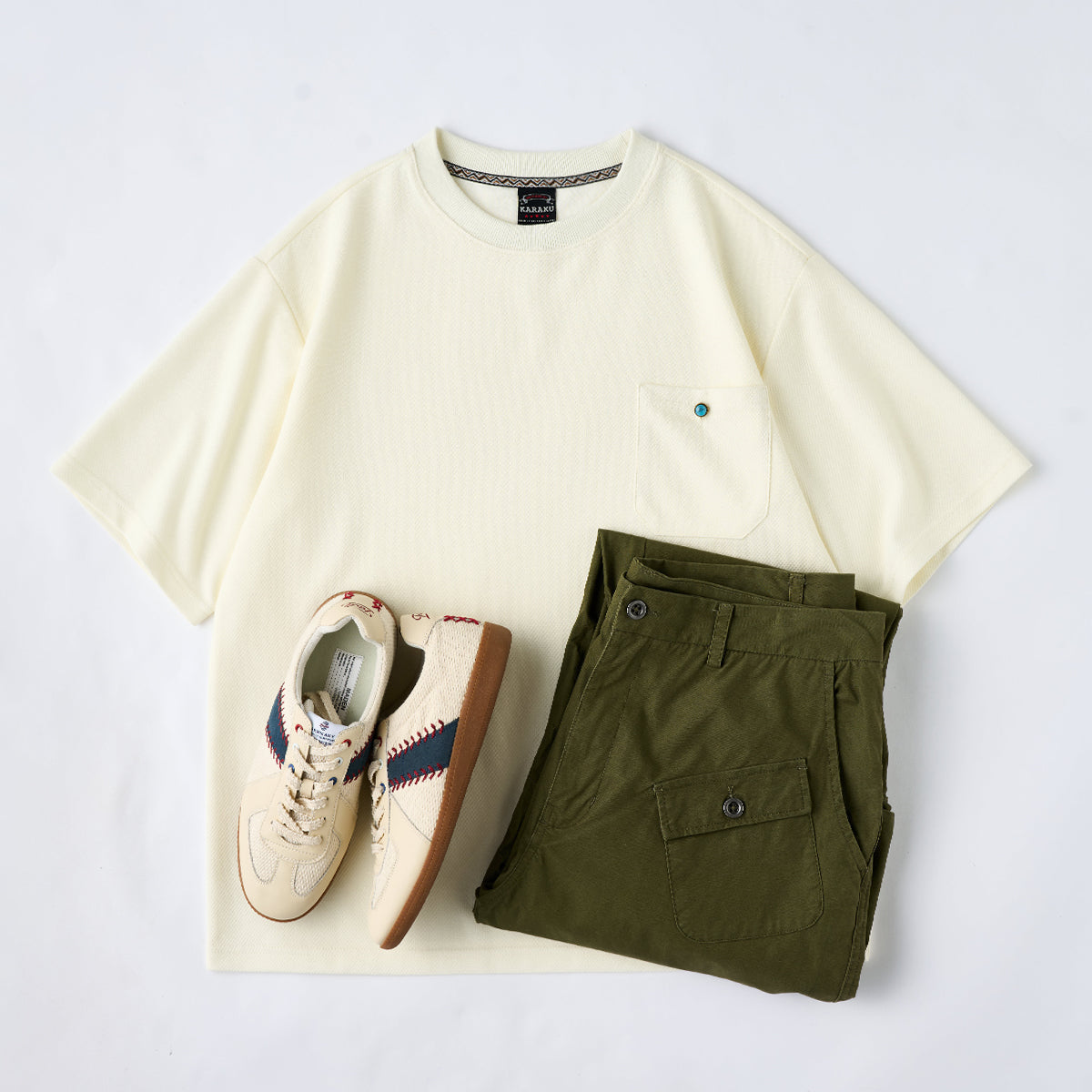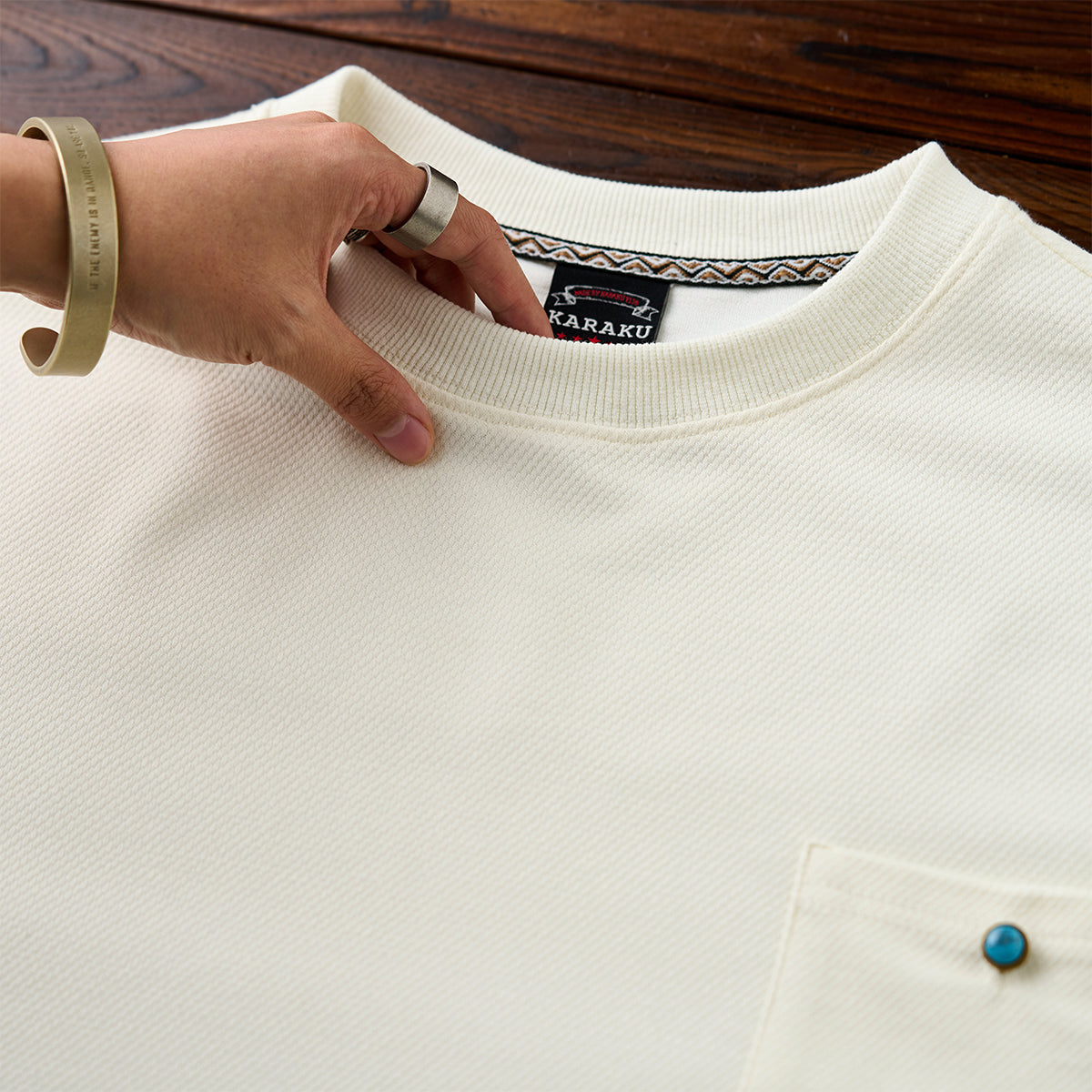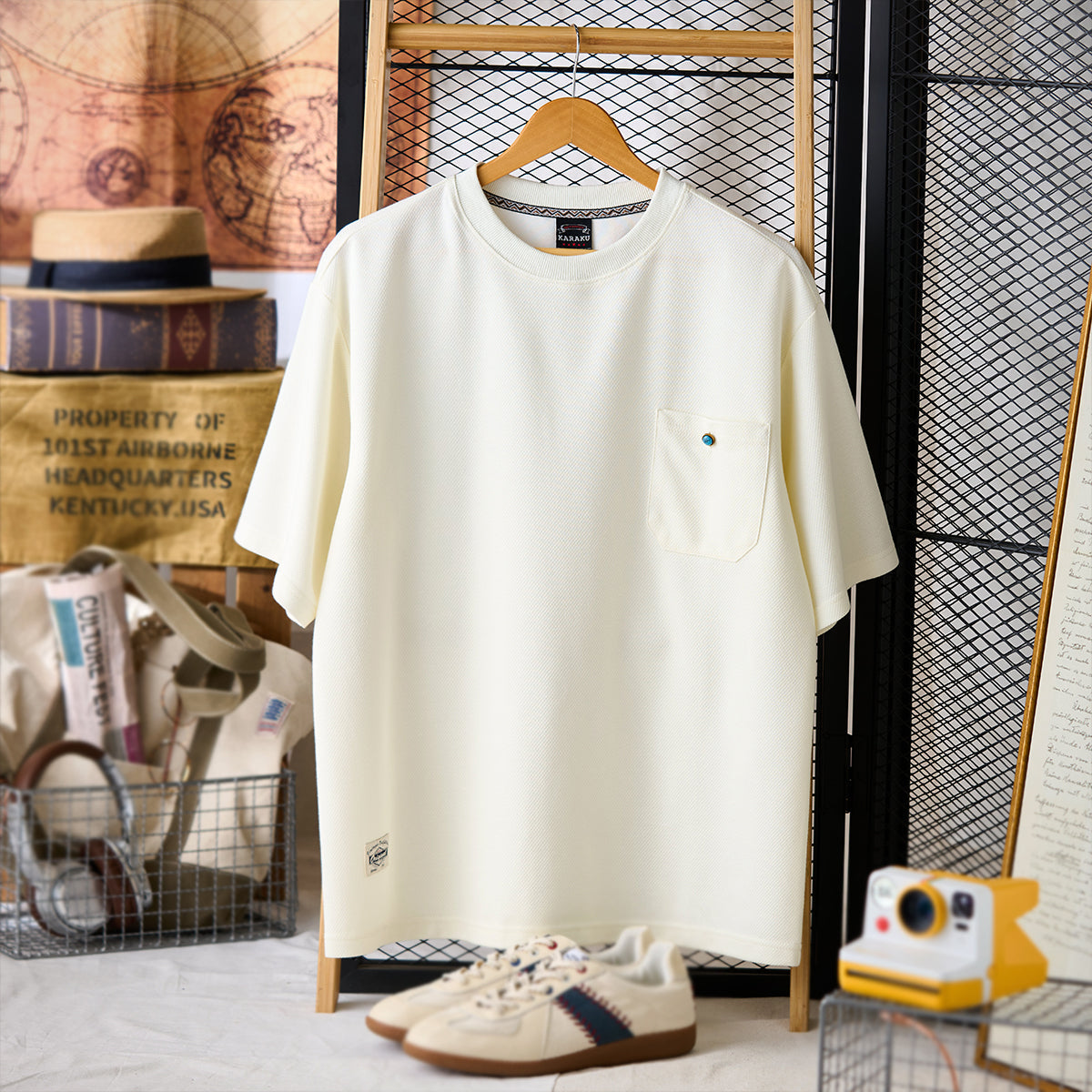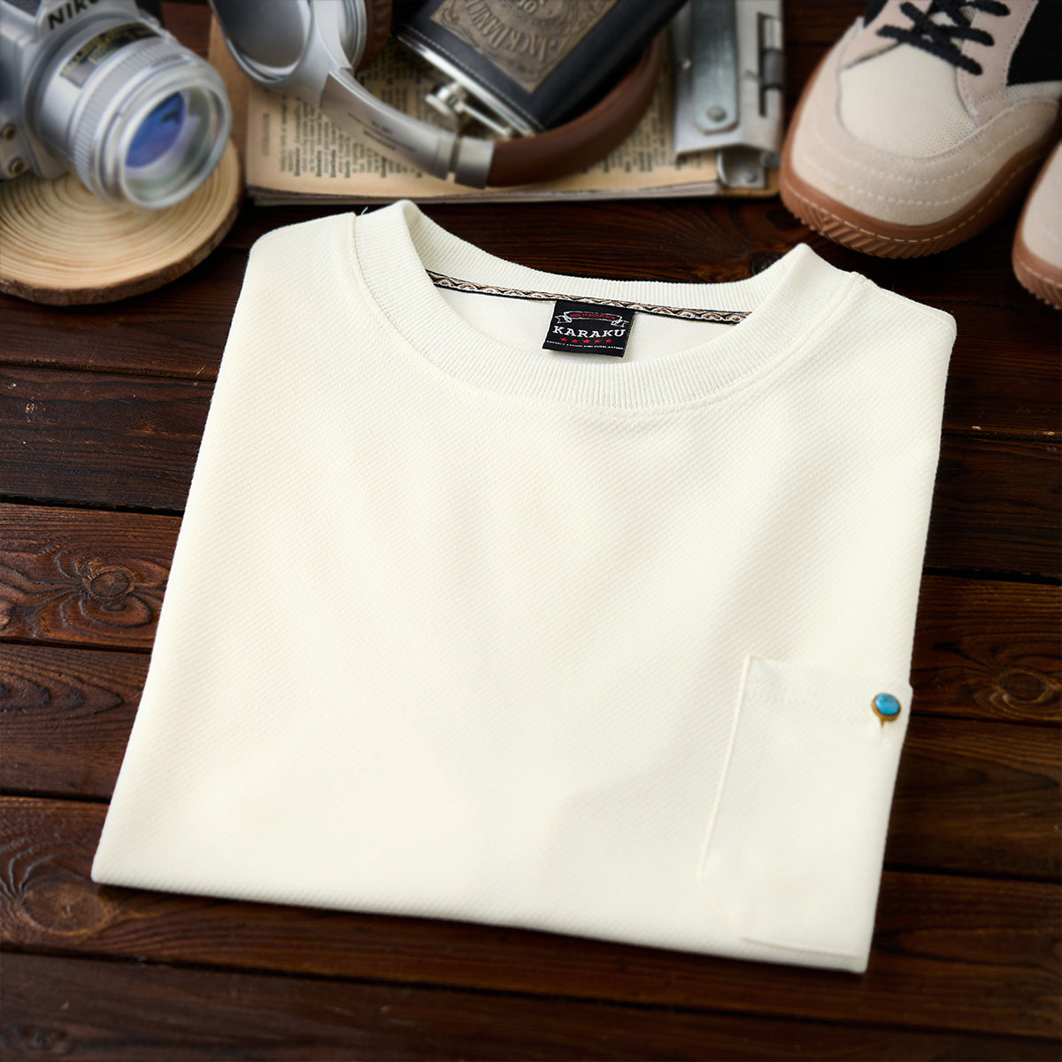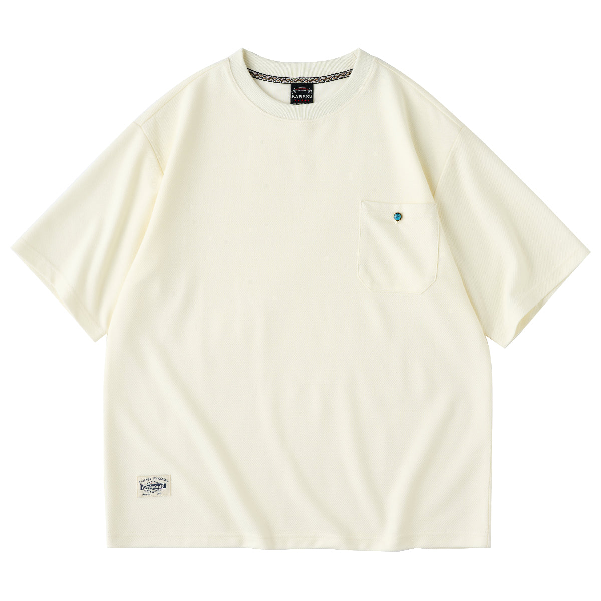 포인트 라벨과 터키석 단추 포켓이 돋보이며, 부드러운 면 혼방 소재로 데일리로 편안하게 입기 좋은 티셔츠입니다.