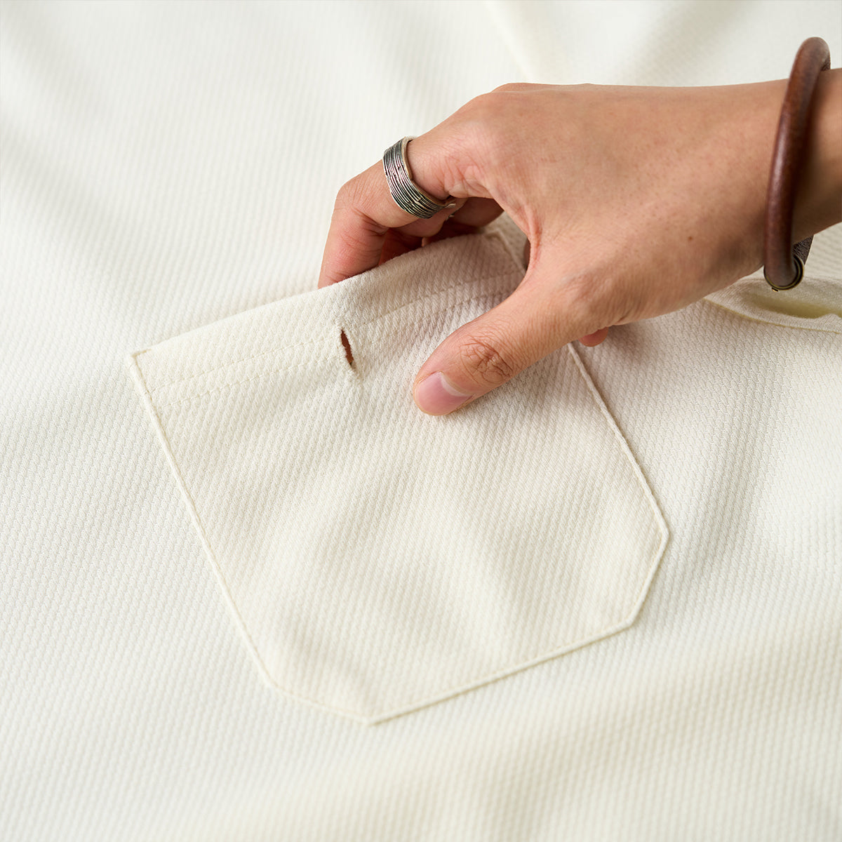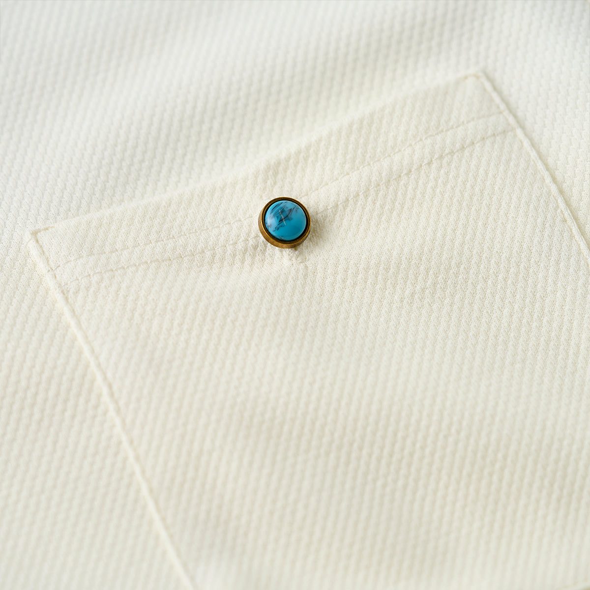 가슴 포켓에 더해진 터키석 느낌의 단추가 은은하면서도 눈길을 사로잡는 포인트입니다.